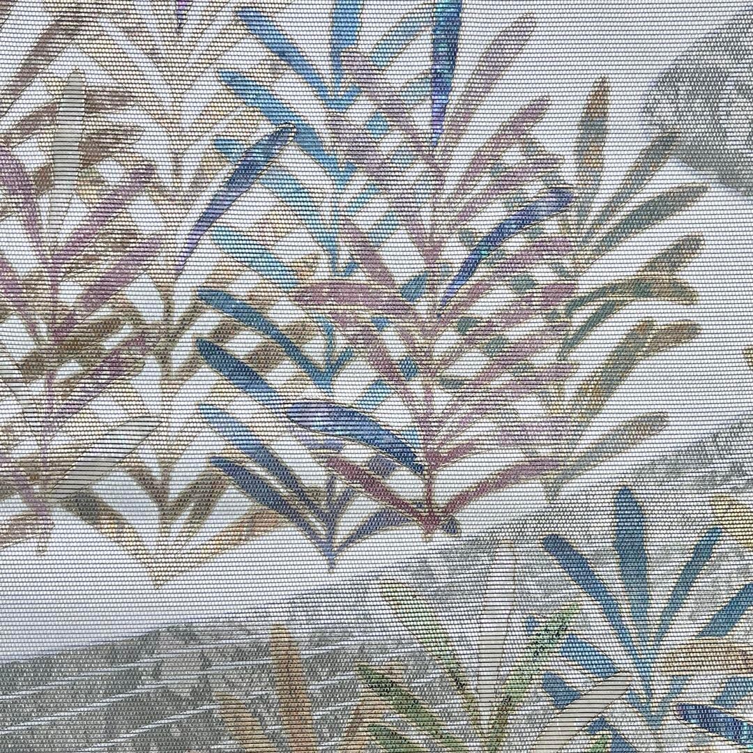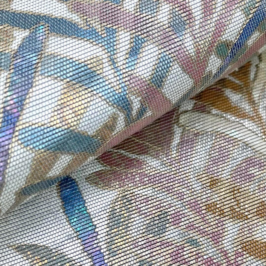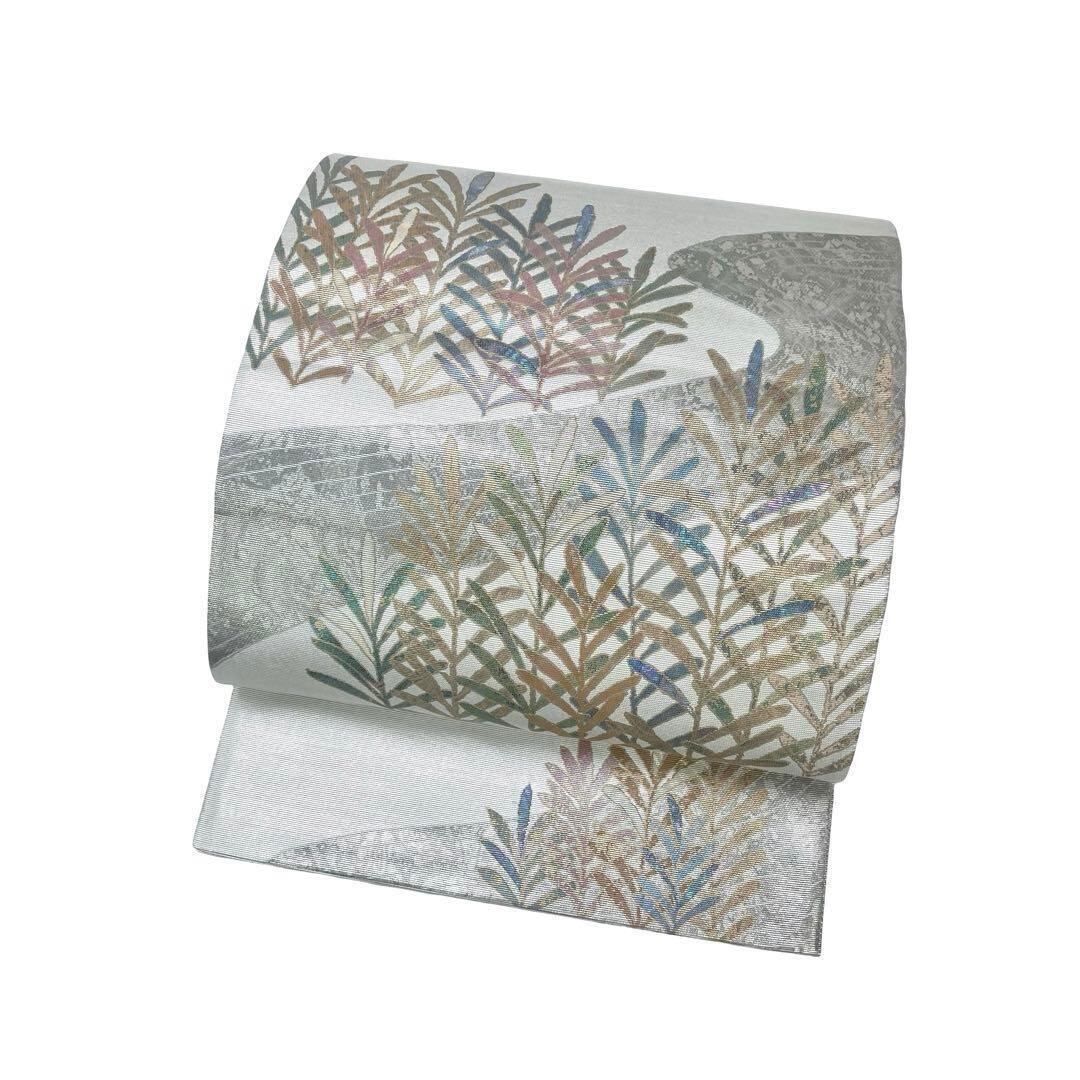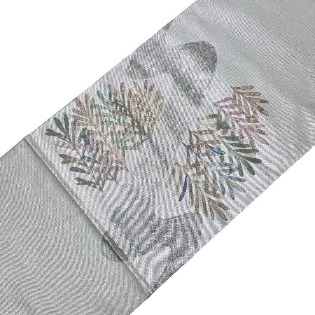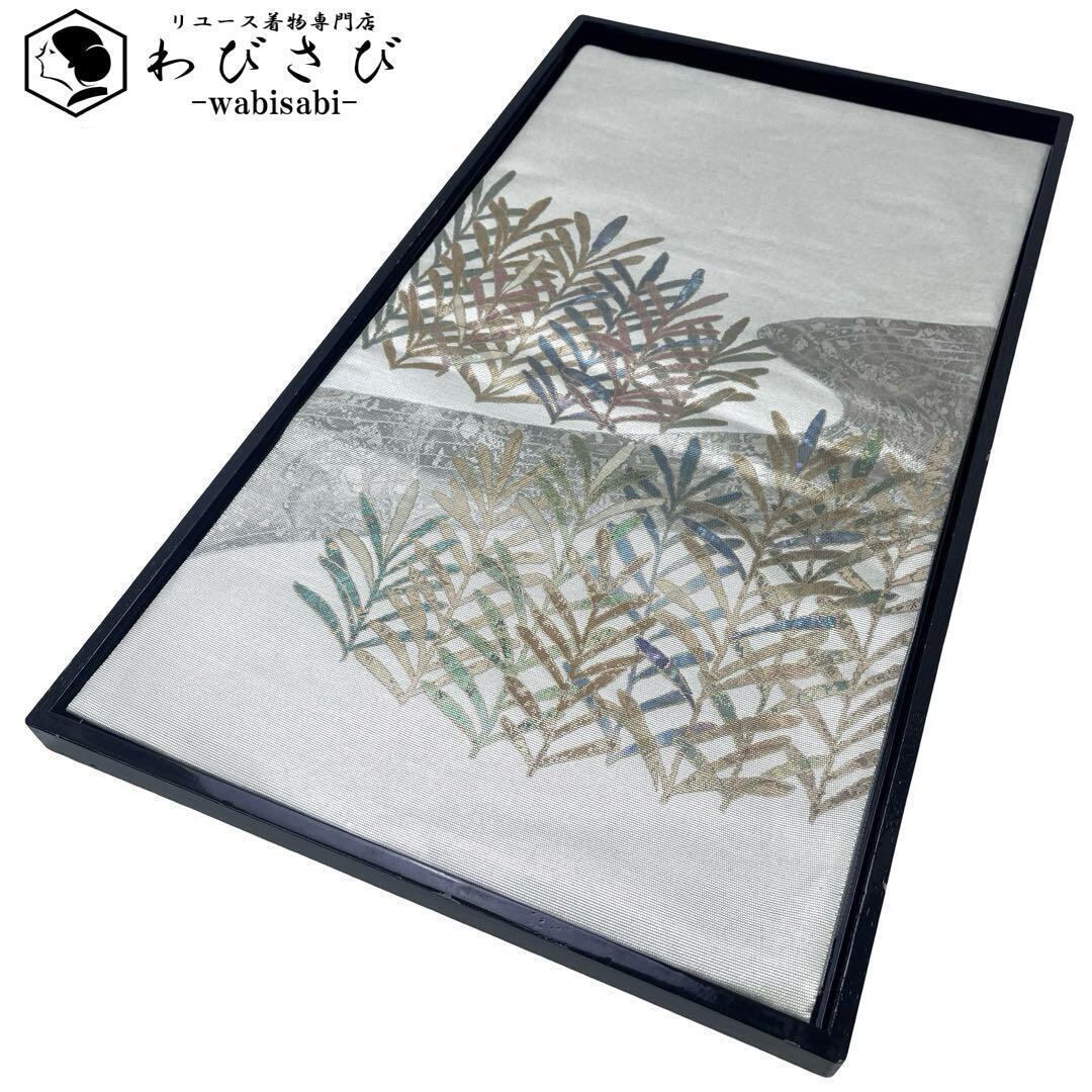 灰白色の落ち着いたお色味に螺鈿が使われた流水に草模様がデザインされた素敵なお品でございます。
