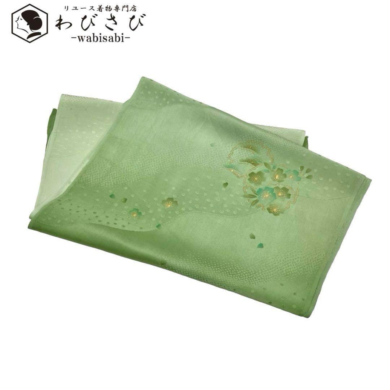 若葉色ベースのお色味に雪輪に花模様がデザインされた素敵なお品でございます。