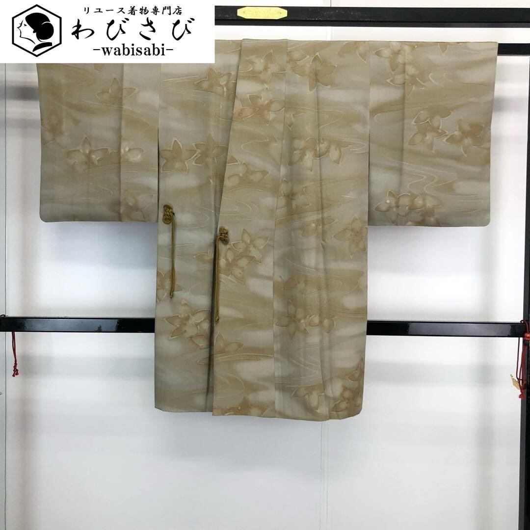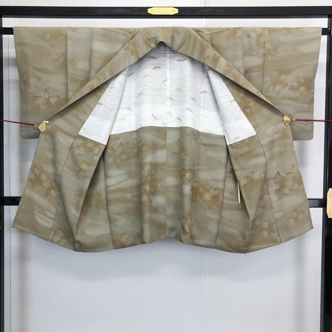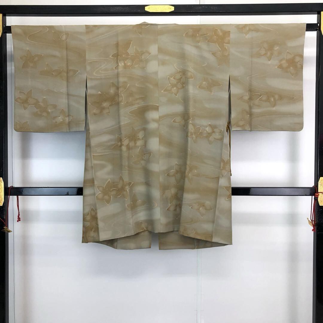 古晒色の落ち着きのあるお色味に流水に花模様の染柄がデザインされた素敵なお品でございます。