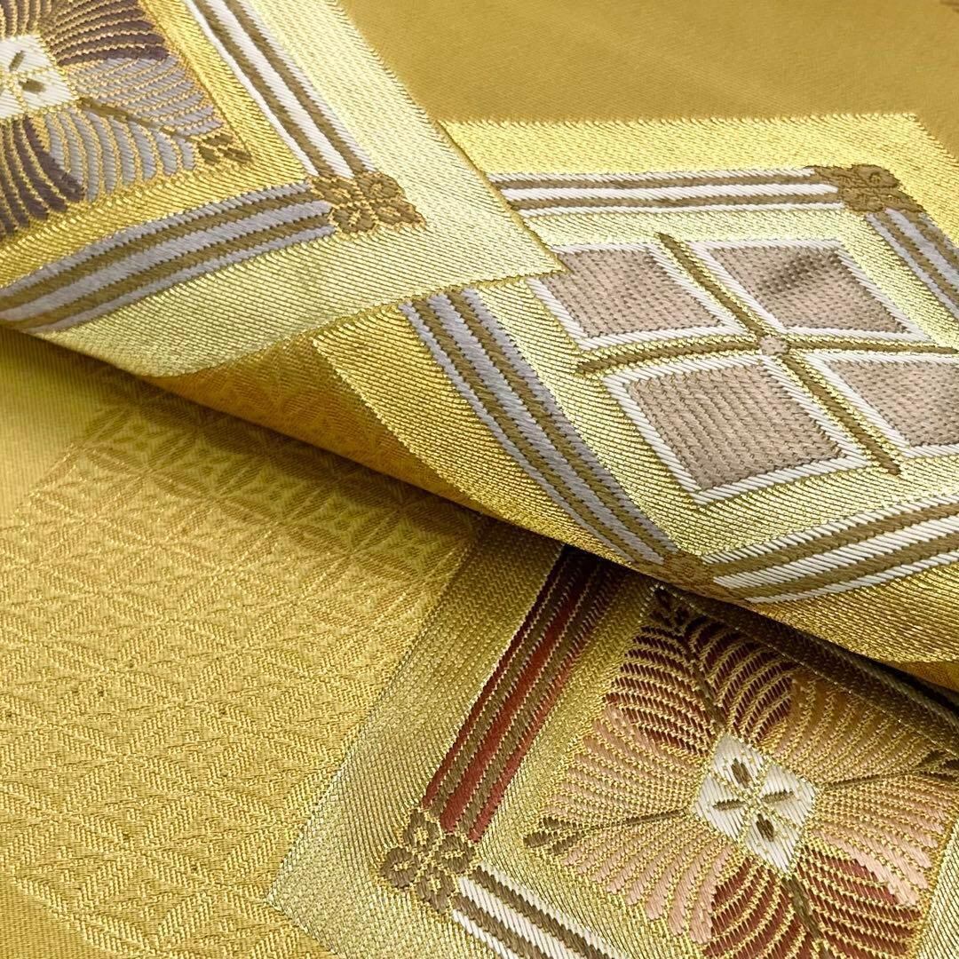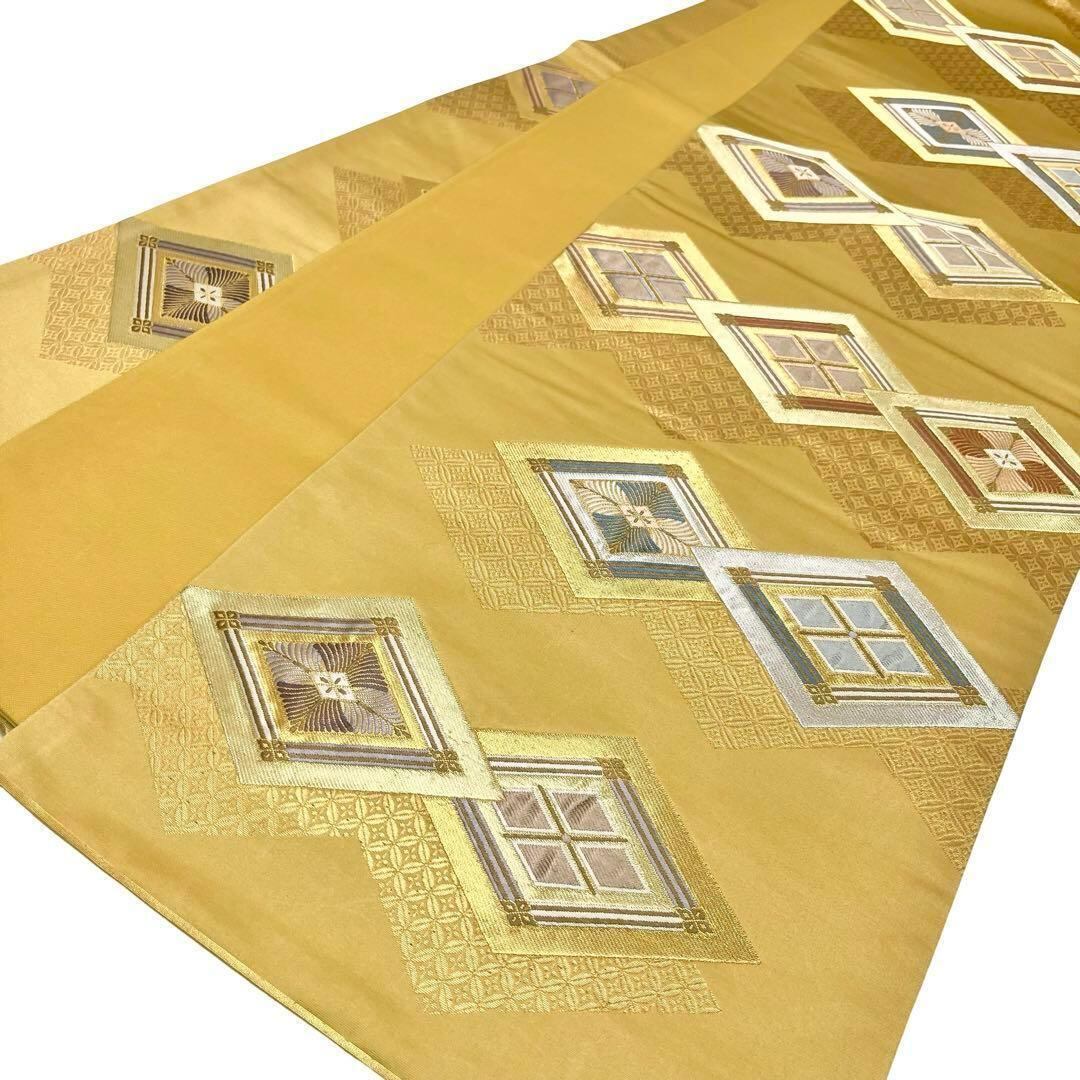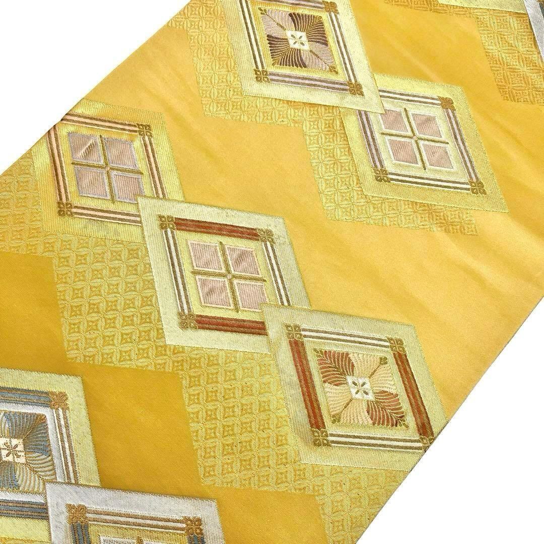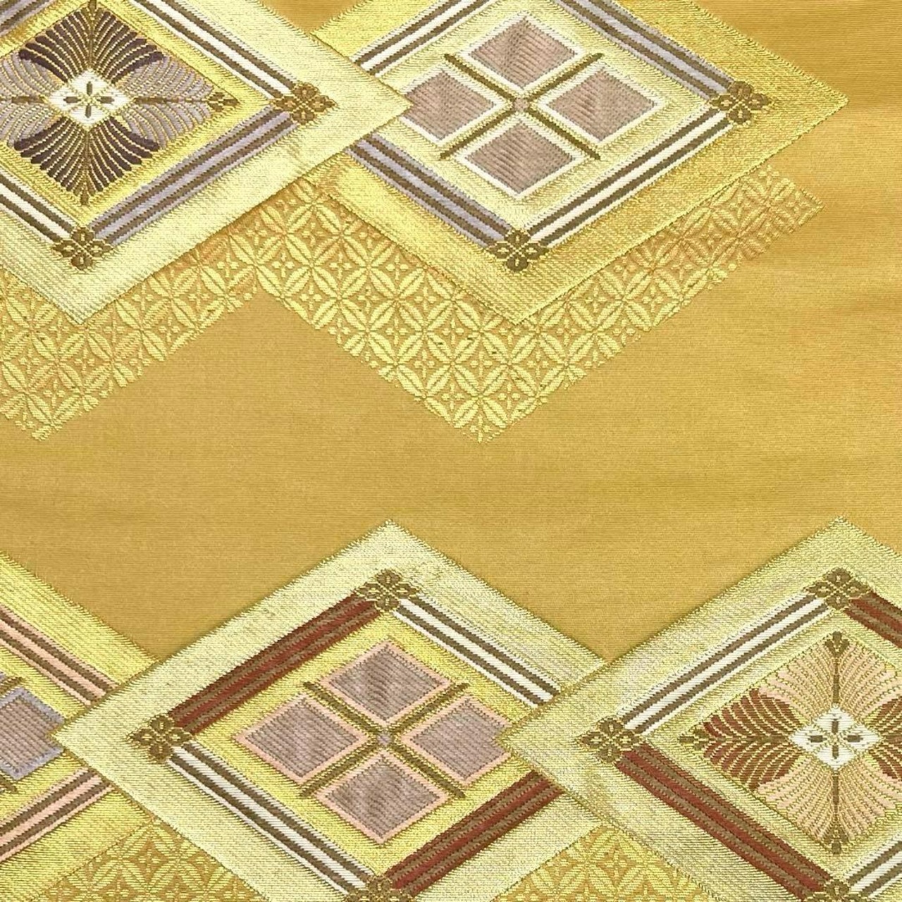 濃卵色の煌びやかなお色味に菱形模様、七宝などの柄裄がデザインされた素敵なお品でございます。