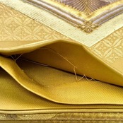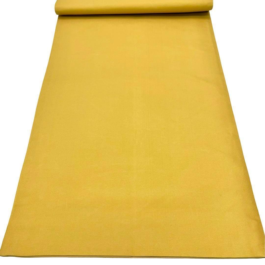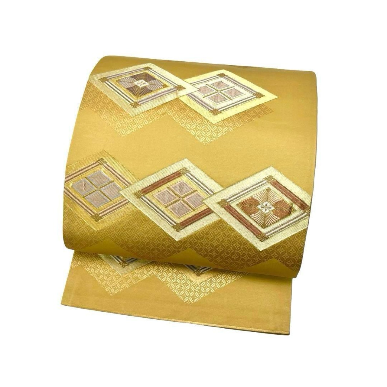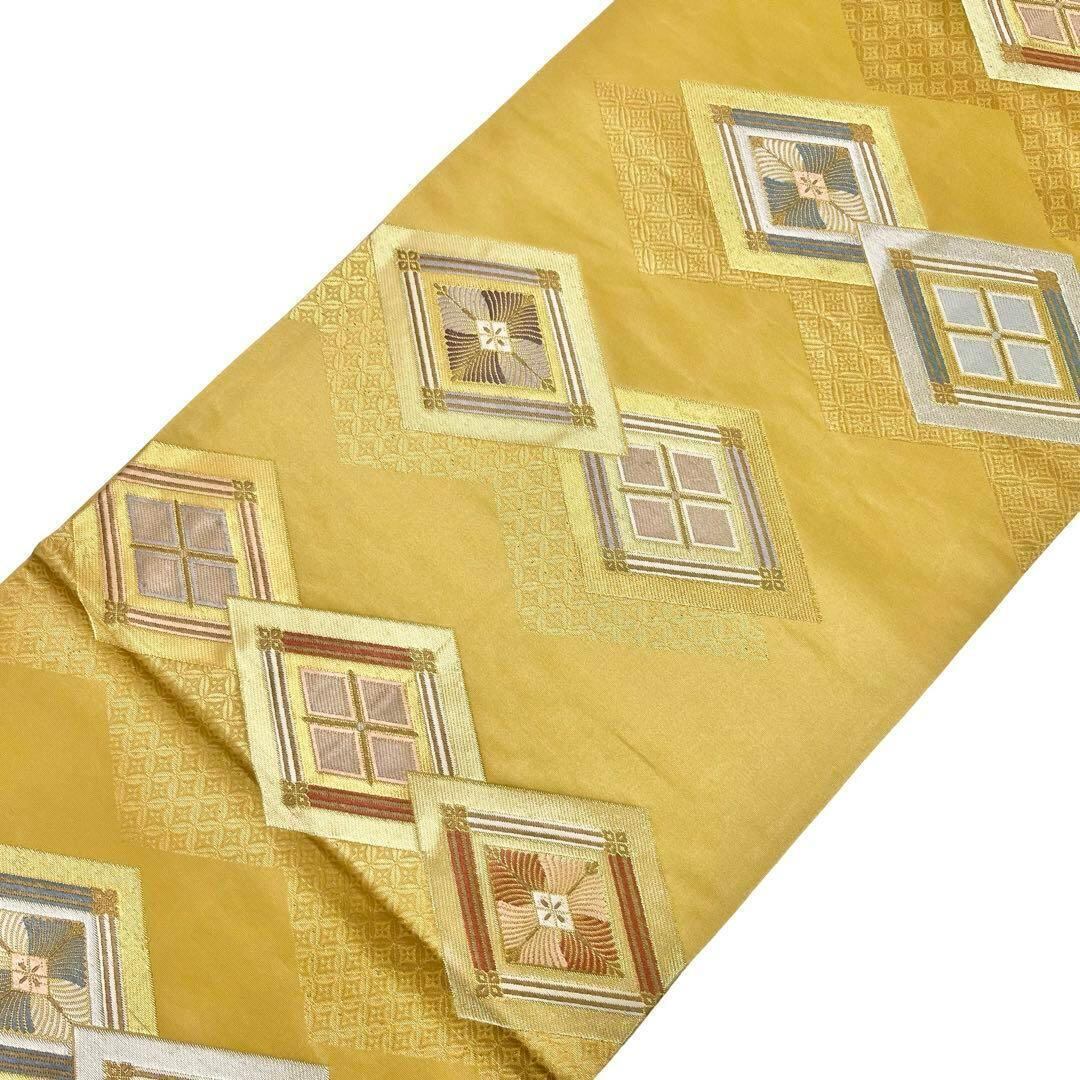 濃卵色の煌びやかなお色味に菱形模様、七宝などの柄裄がデザインされた素敵なお品でございます。