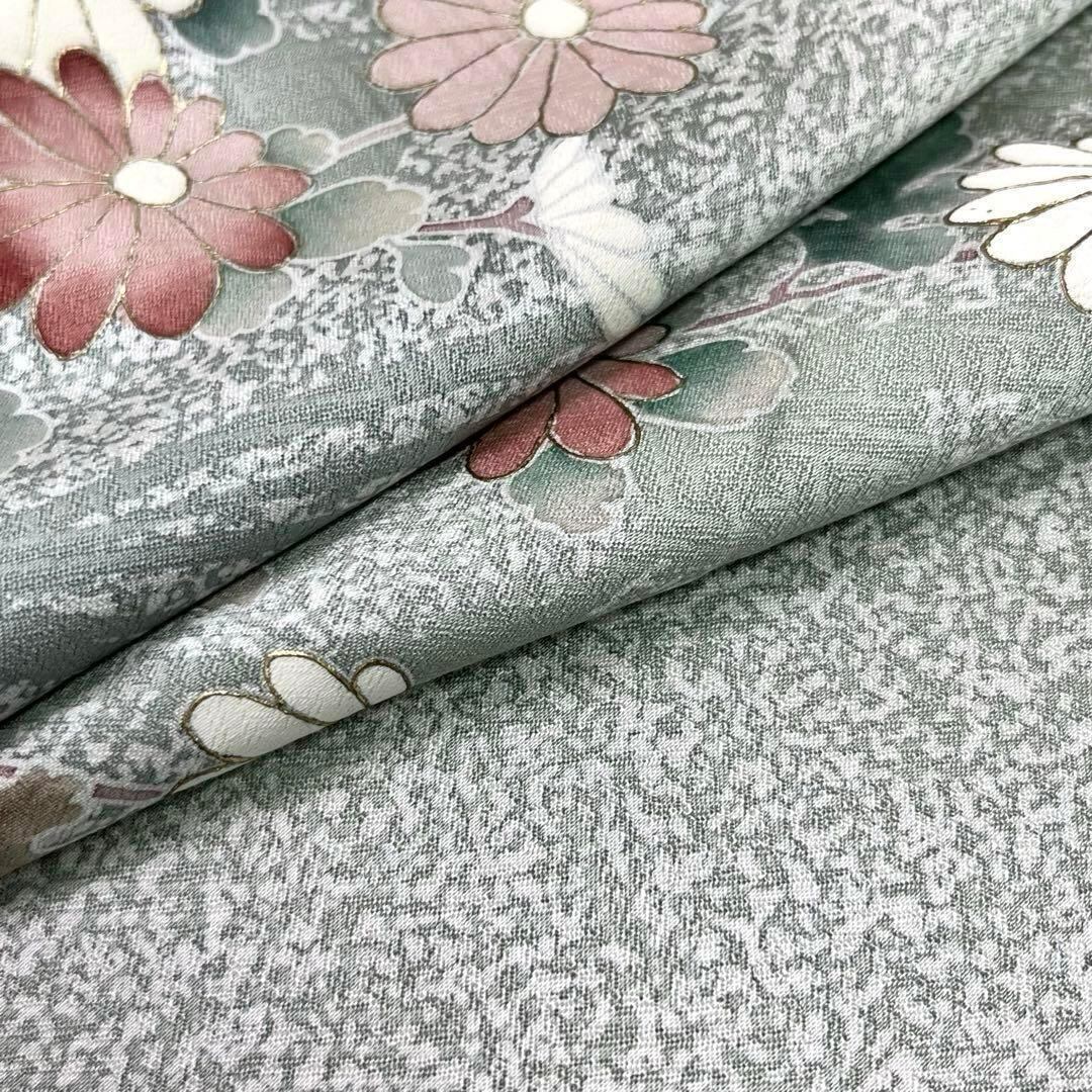 裏葉色の品のあるお色味に暈し、叩き染、上品な草花模様がデザインされた素敵な柄裄のお品でございます。