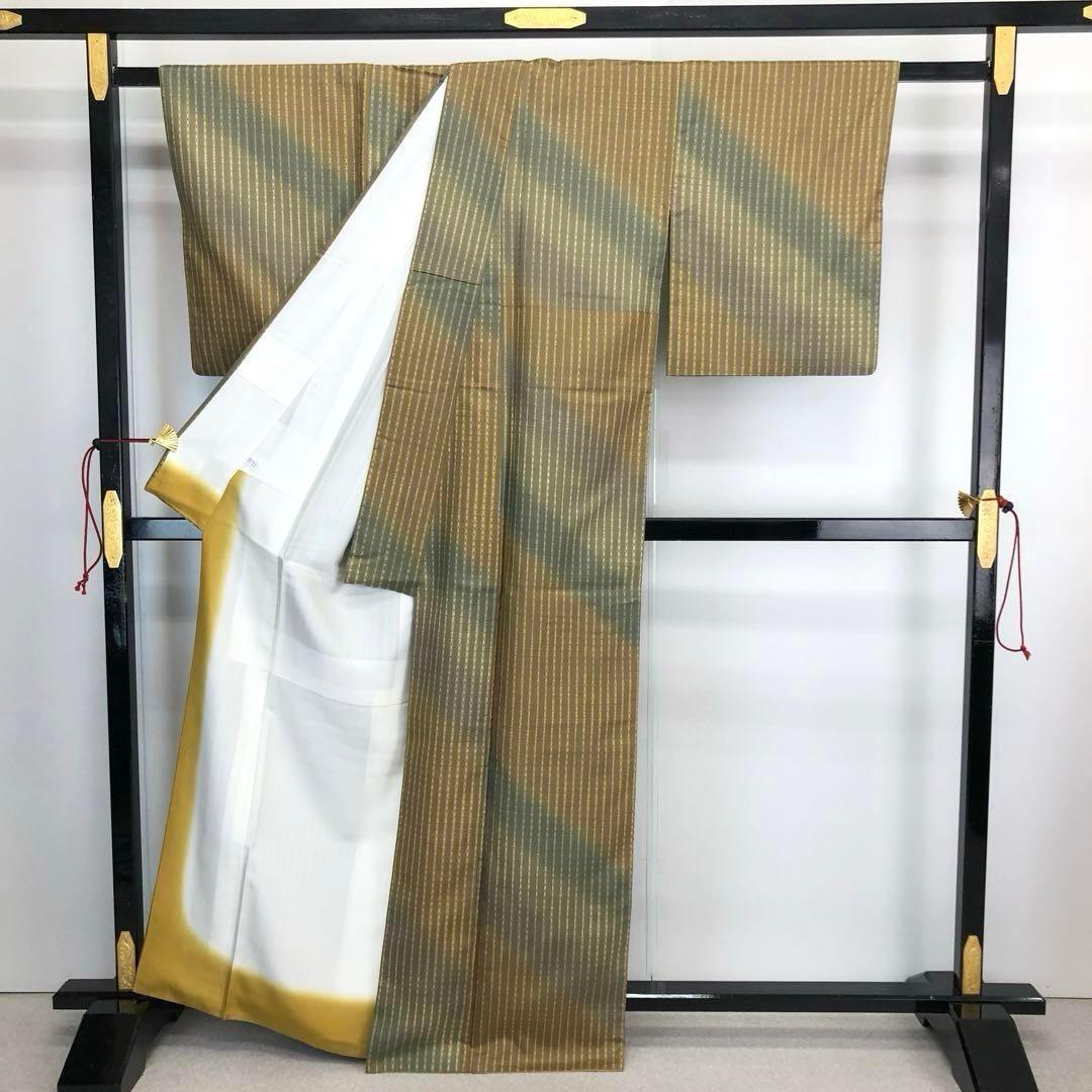 梅谷渋色ベースのお色味、斜めの染め色に絞りの縦縞模様がデザインされた素敵なお品でございます。