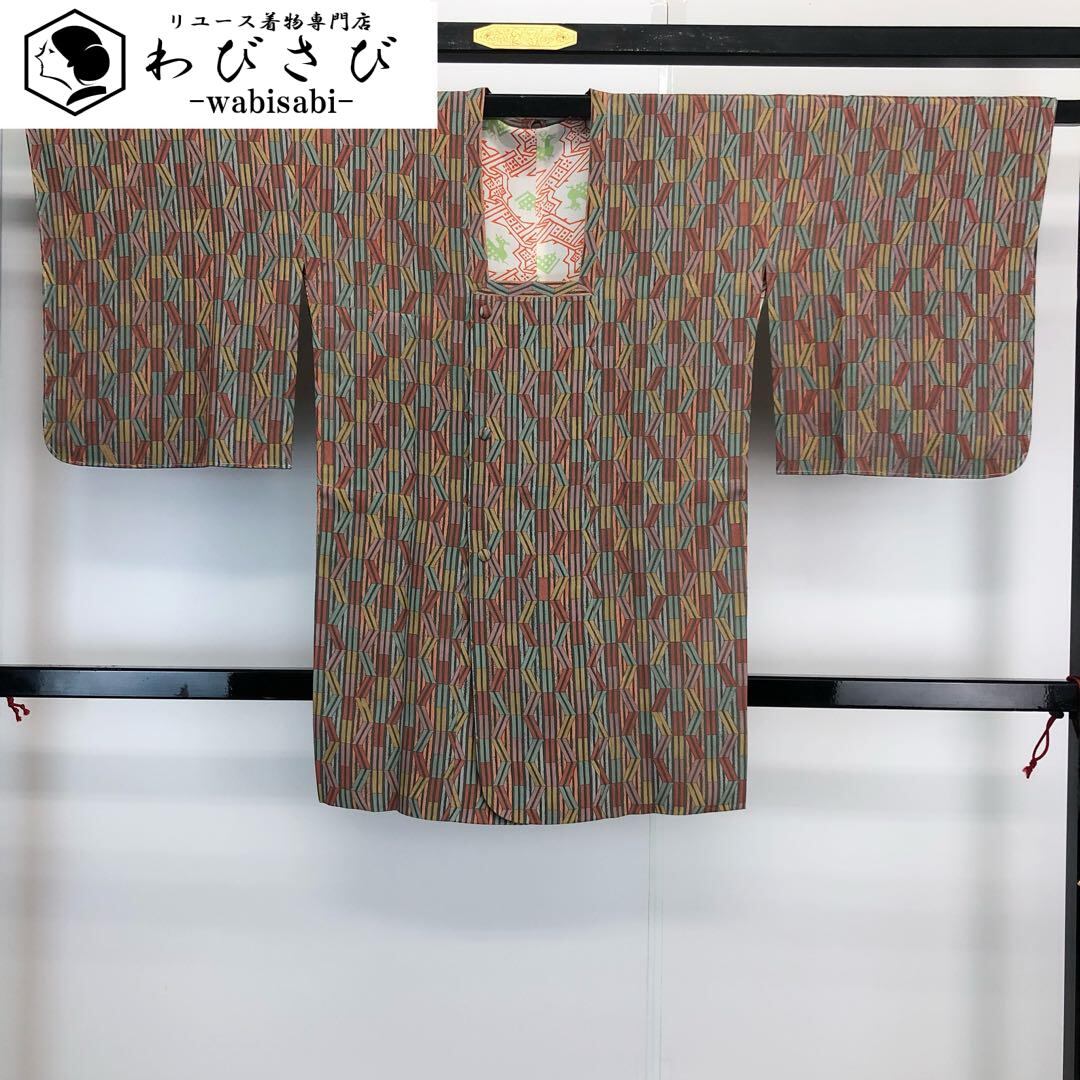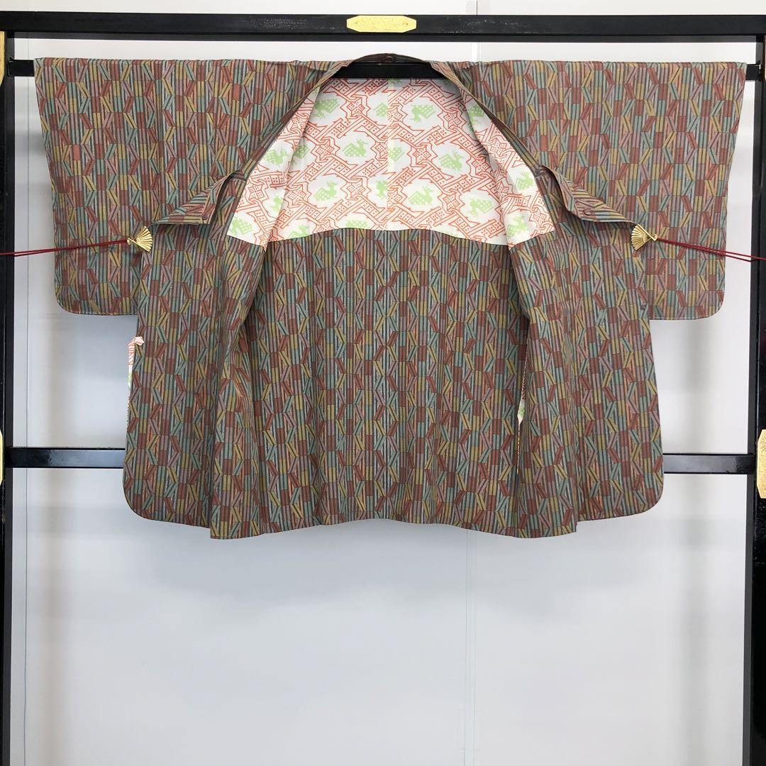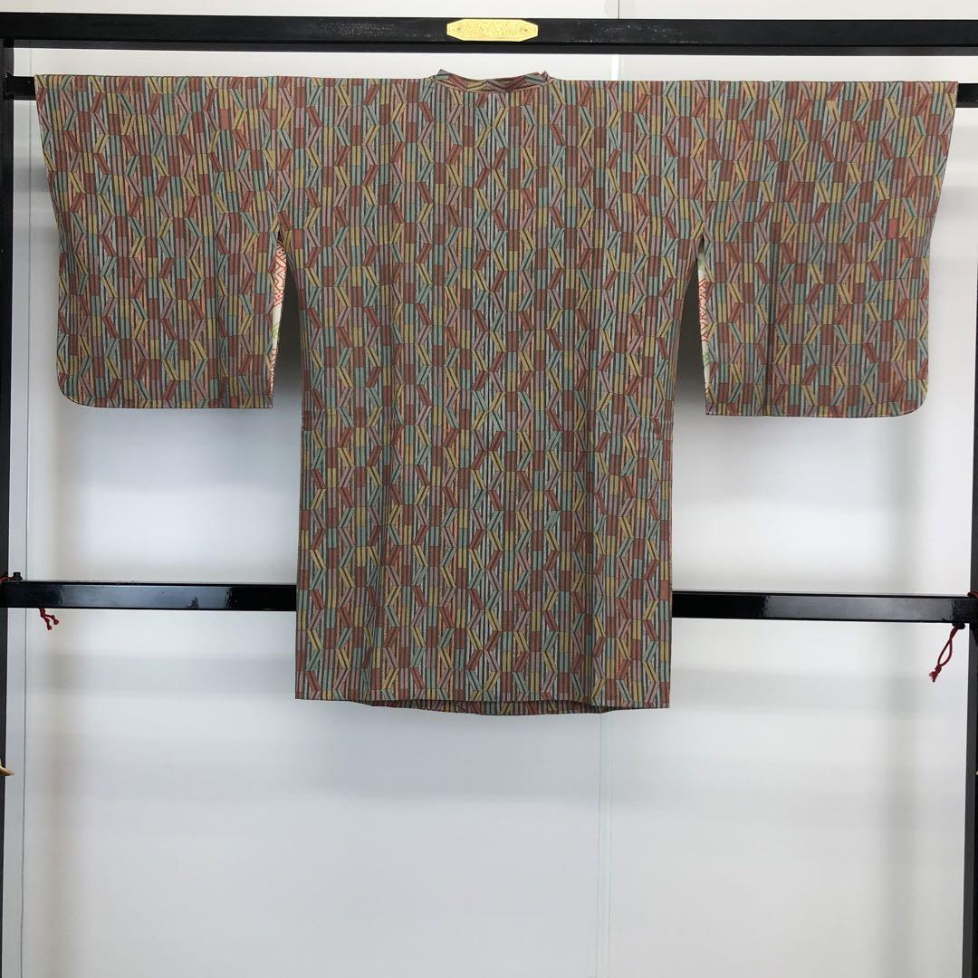 落ち着いたお色味の縮緬に縦縞模様、幾何学模様の柄裄がデザインされた染柄の素敵なお品でございます。