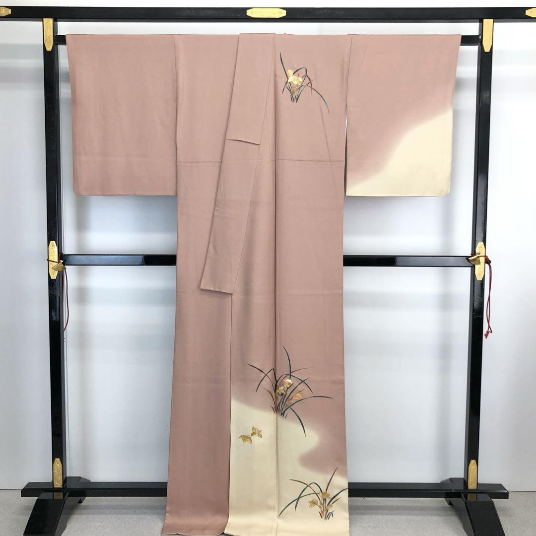 退紅色ベースの品のあるお色味に暈し、煌びやかな螺鈿が使われた上品な花模様がデザインされた素敵な柄裄のお品でございます。