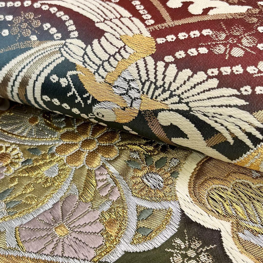 花模様、鳥、波模様などの柄裄がデザインされた彩り鮮やかな素敵な柄行のお品でございます。