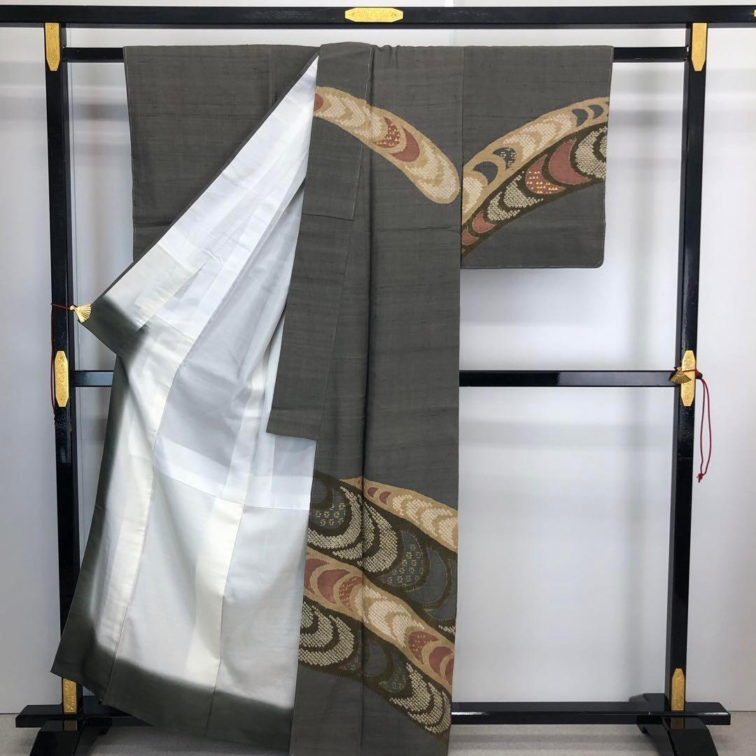 薄墨色の落ち着いたお色味の生紬、絞りなどの抽象模様がデザインされた雰囲気の良い素敵な柄行のお品でございます。