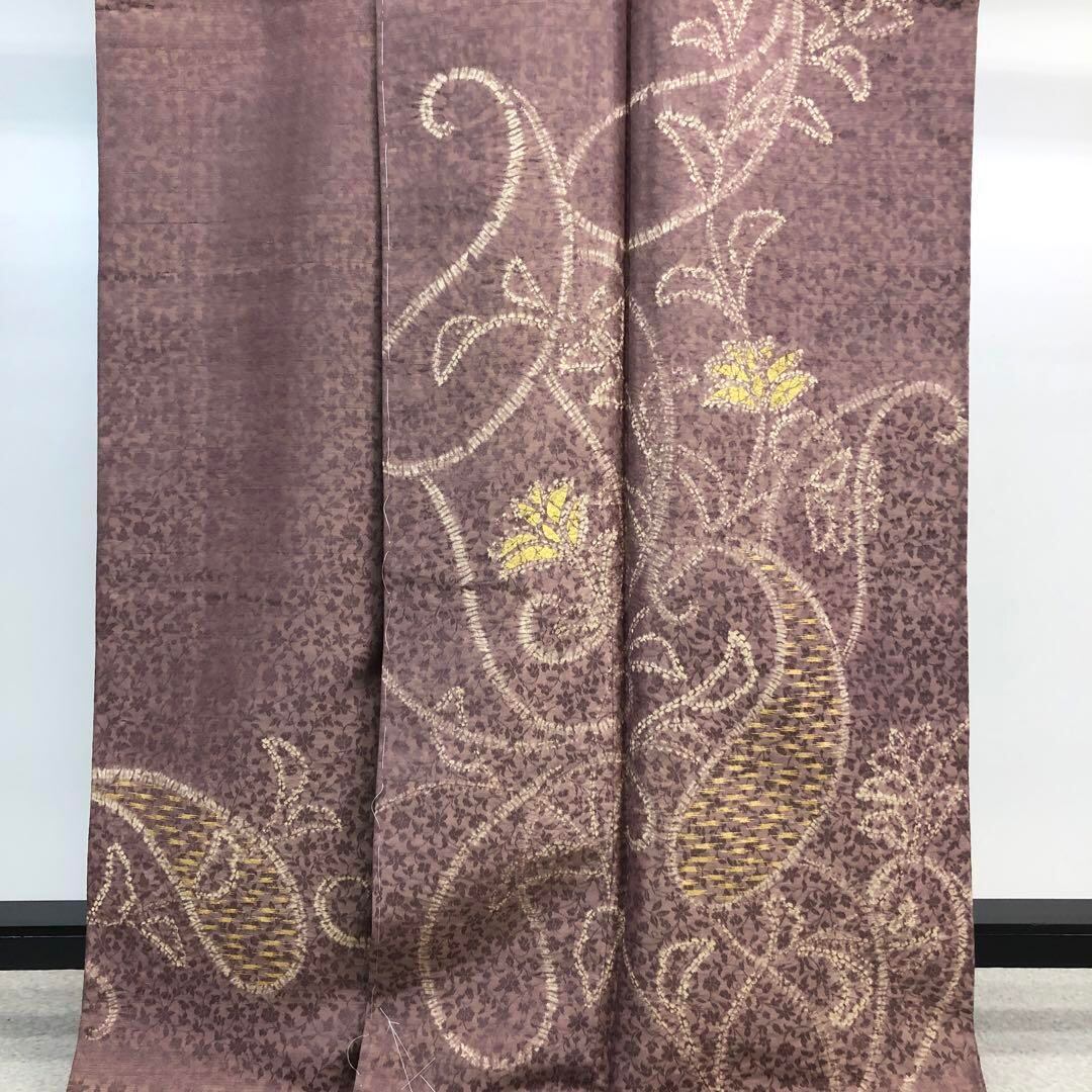 小豆鼠色ベースのお色味に絞り柄と金彩でデザインされた抽象花模様が印象的な素敵な柄裄のお品でございます。
