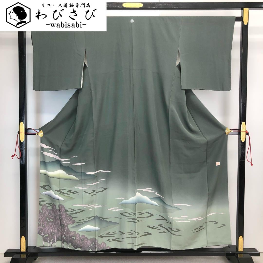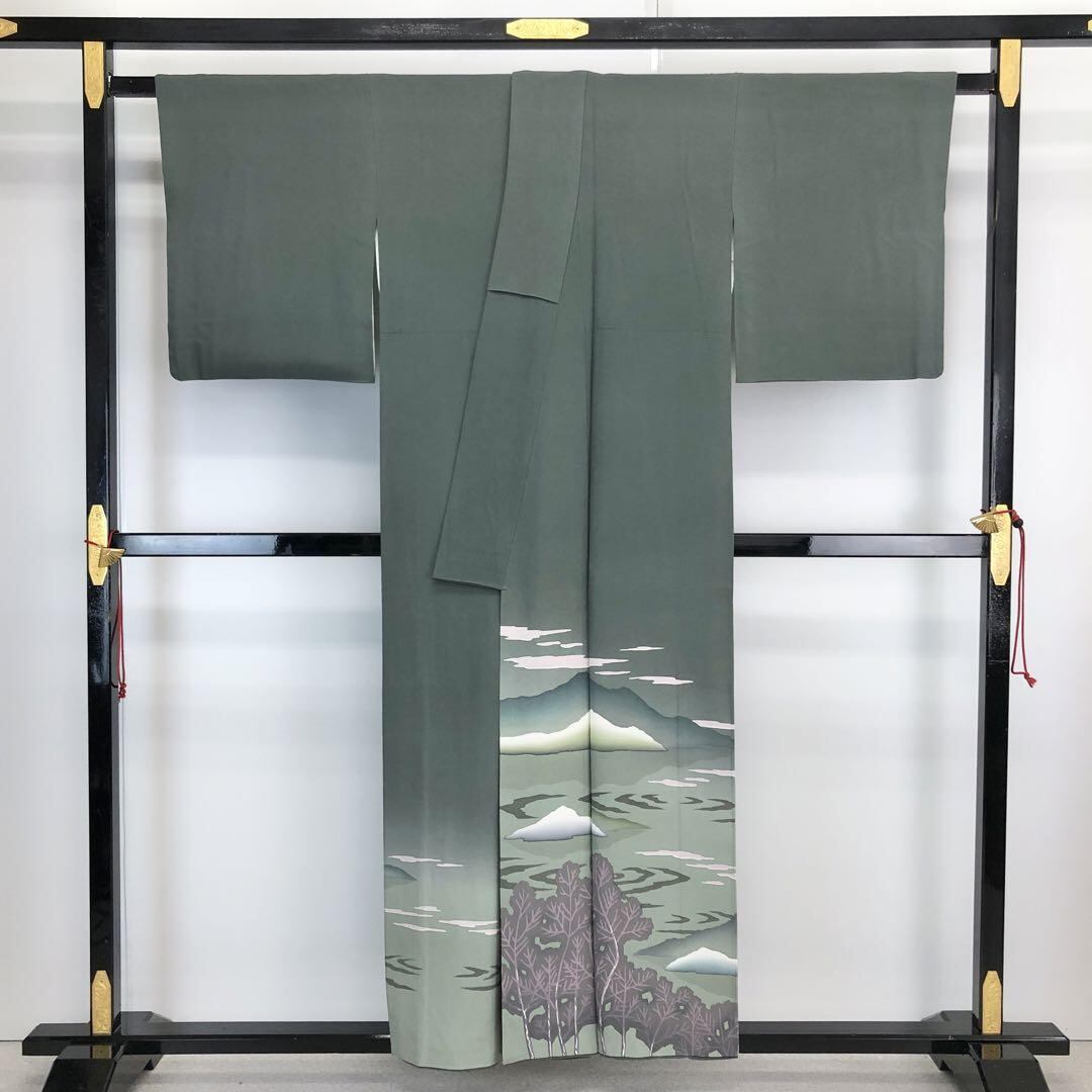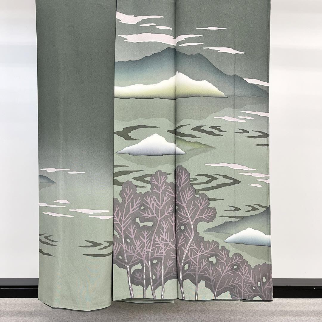 千種鼠色の落ち着きのあるお色味に暈し、遠山、波模様などの風景柄がデザインされた素敵なお品でございます。
