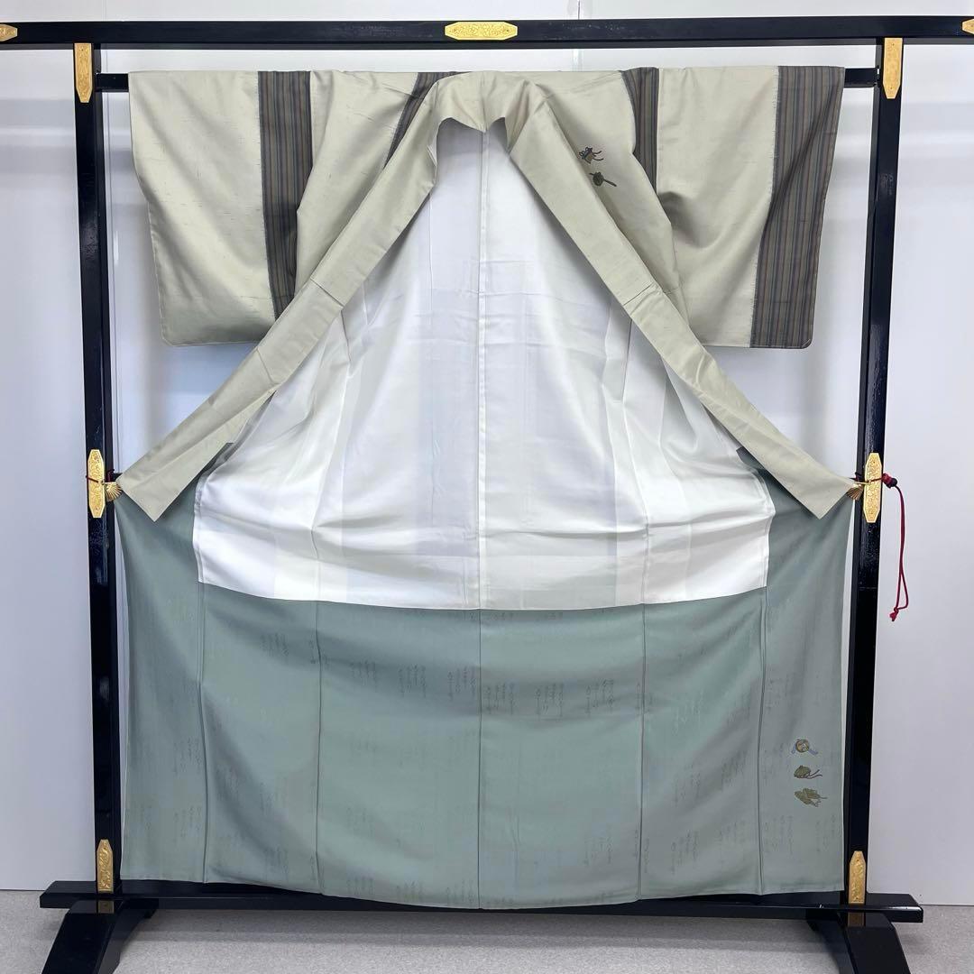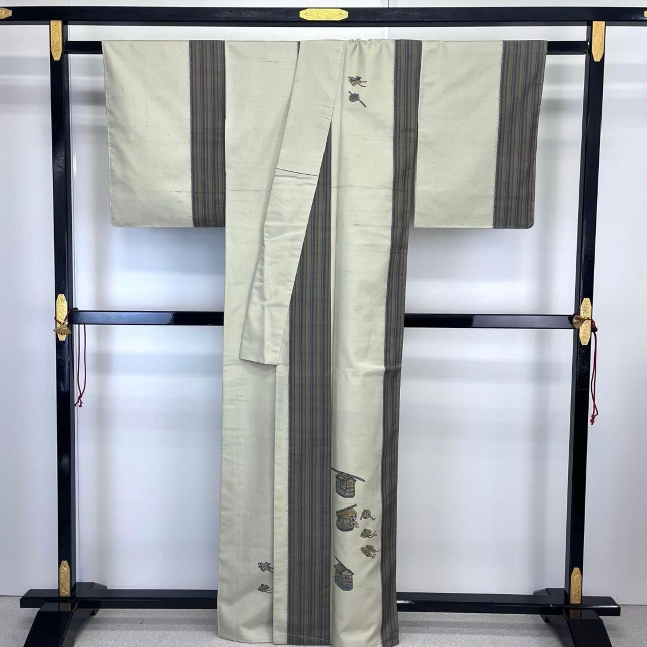 薄若葉色の落ち着いたお色味の紬地に駕籠や草履などの柄裄が手描きでデザインされた素敵なお品でございます。