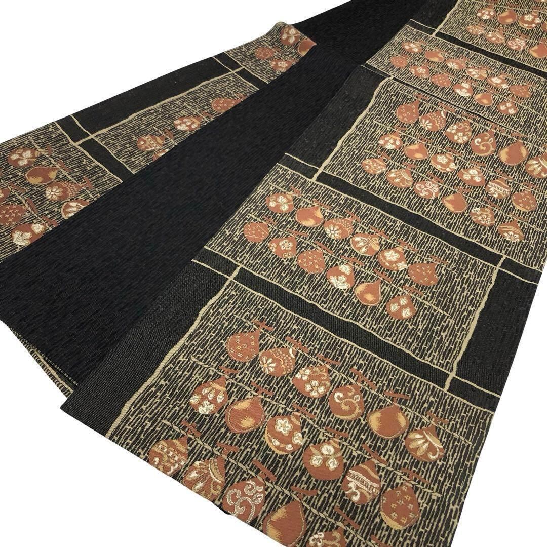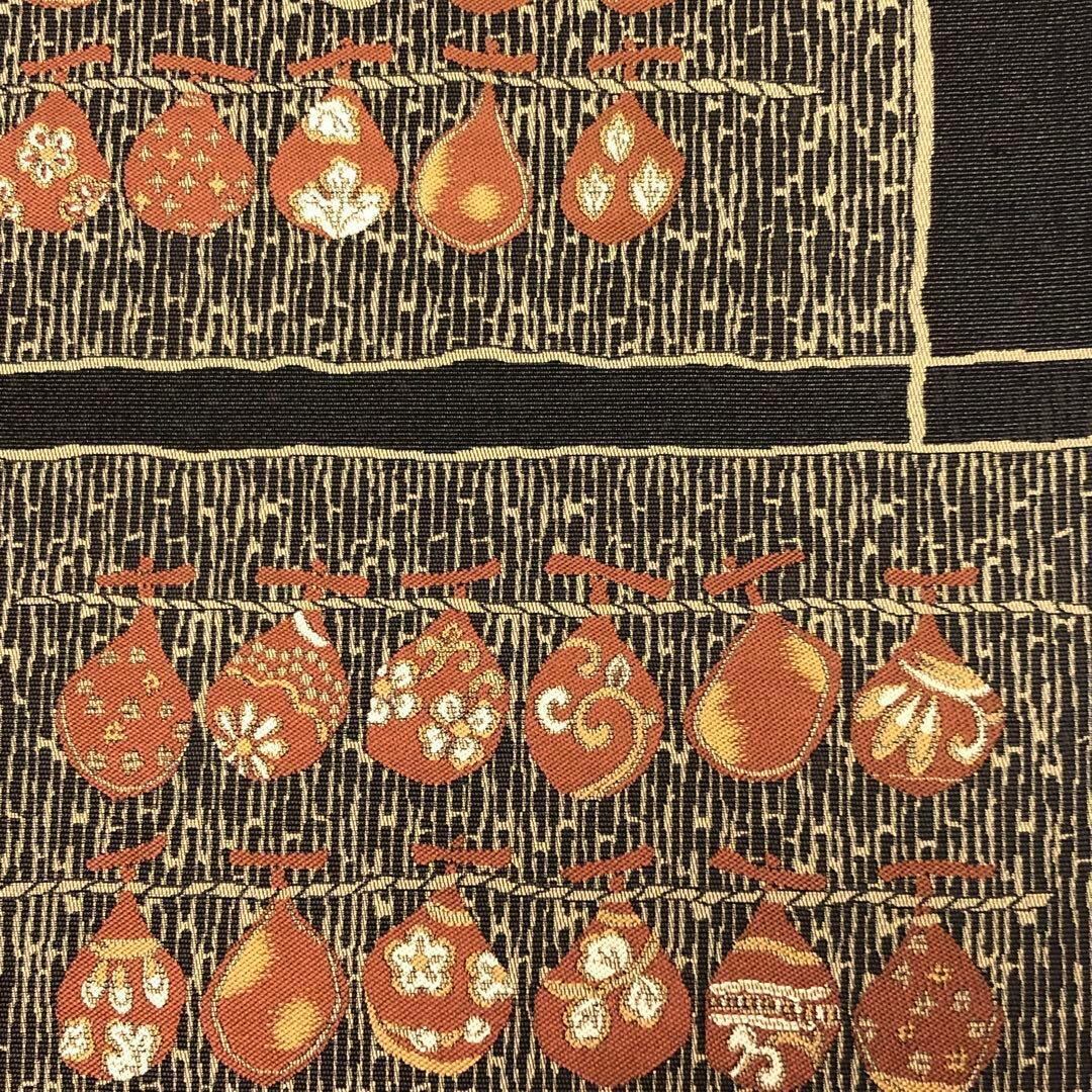 黒色のお色に干し果実の中に花模様などの多様な柄裄がデザインされた雰囲気の良い素敵なお品でございます。