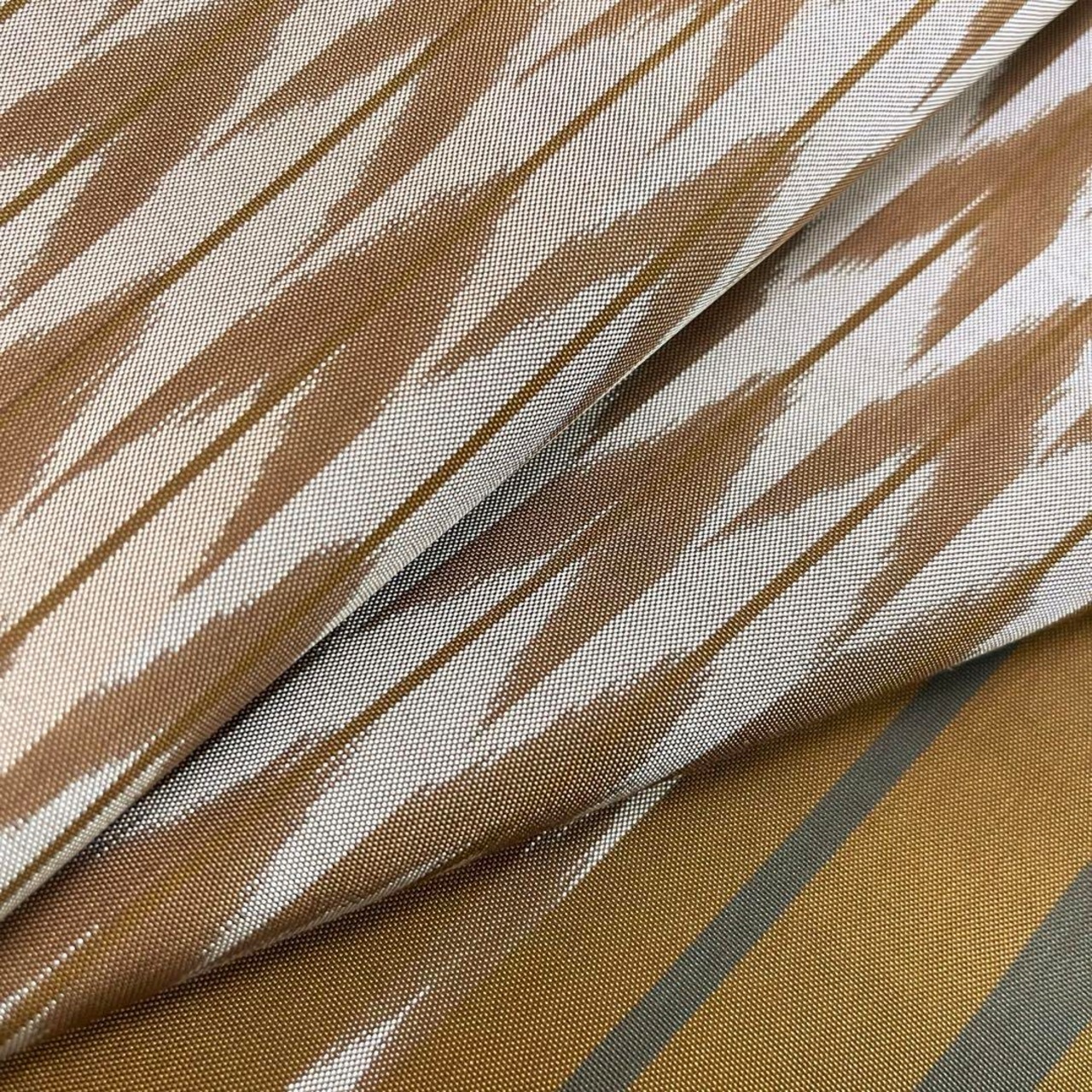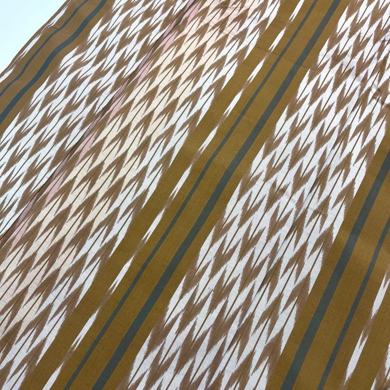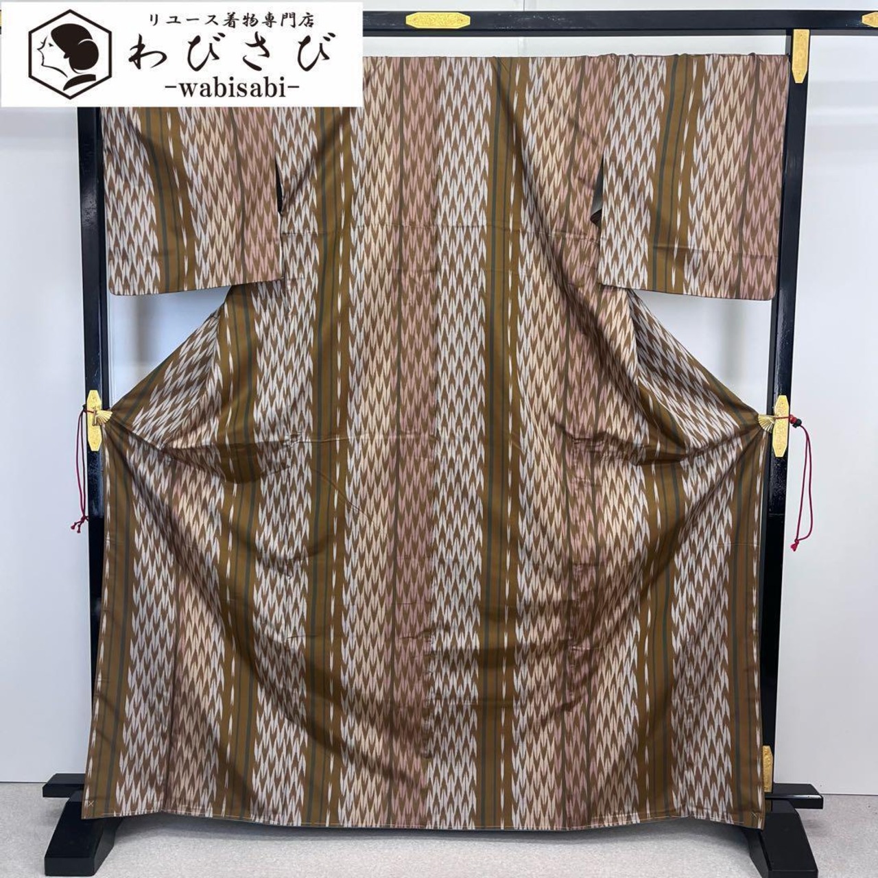 丁字色ベースの落ち着いたお色味、縦縞模様に矢絣の柄裄がデザインされたアンティークの雰囲気の漂う素敵な柄裄のお品でございます。