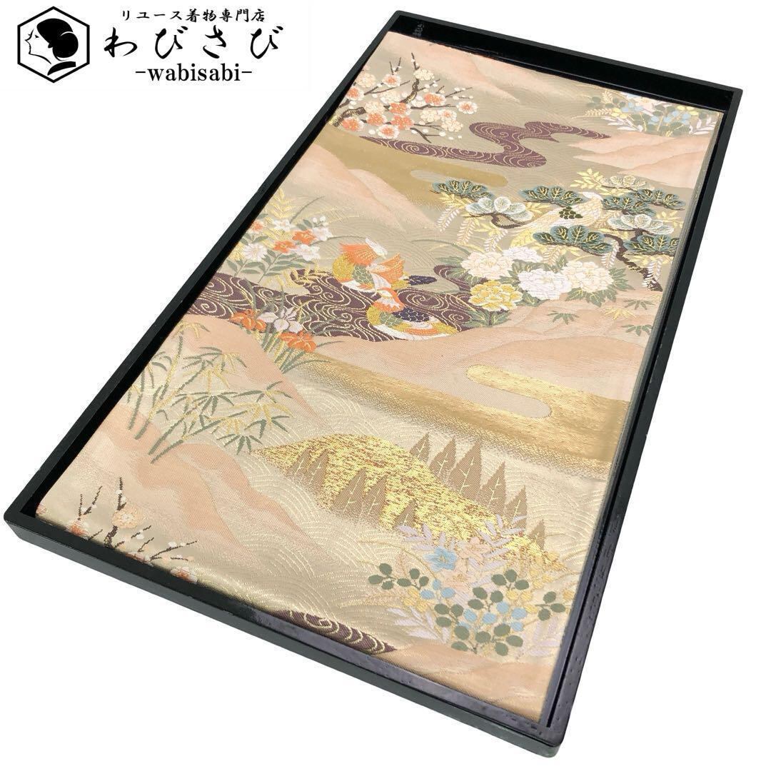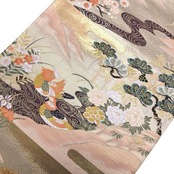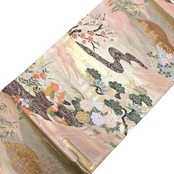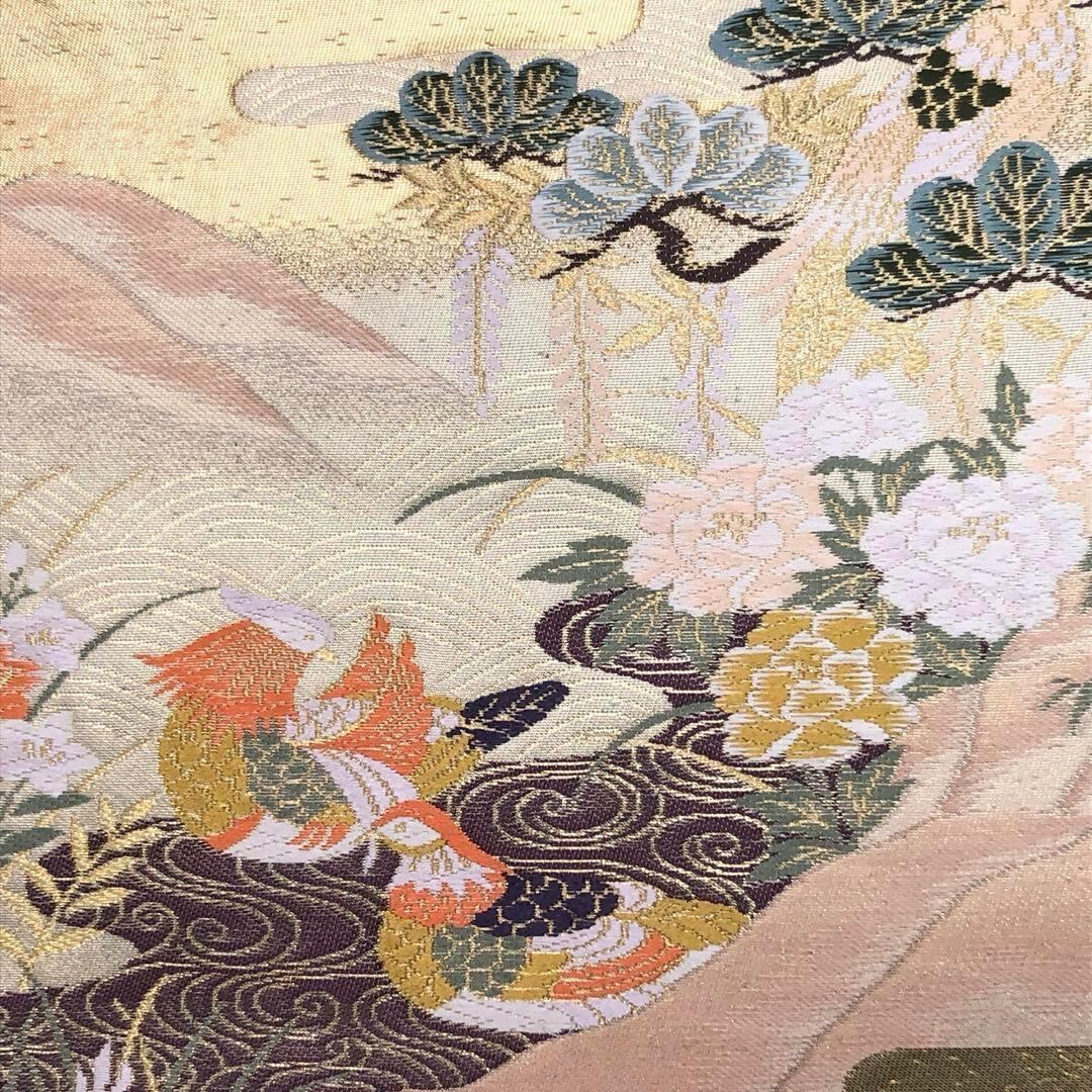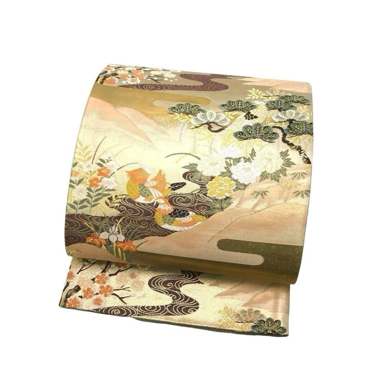 金色ベースのお色味、流水に鴛鴦、花模様などの雰囲気の良い風景がデザインされた煌びやかで素敵な柄裄のお品でございます。