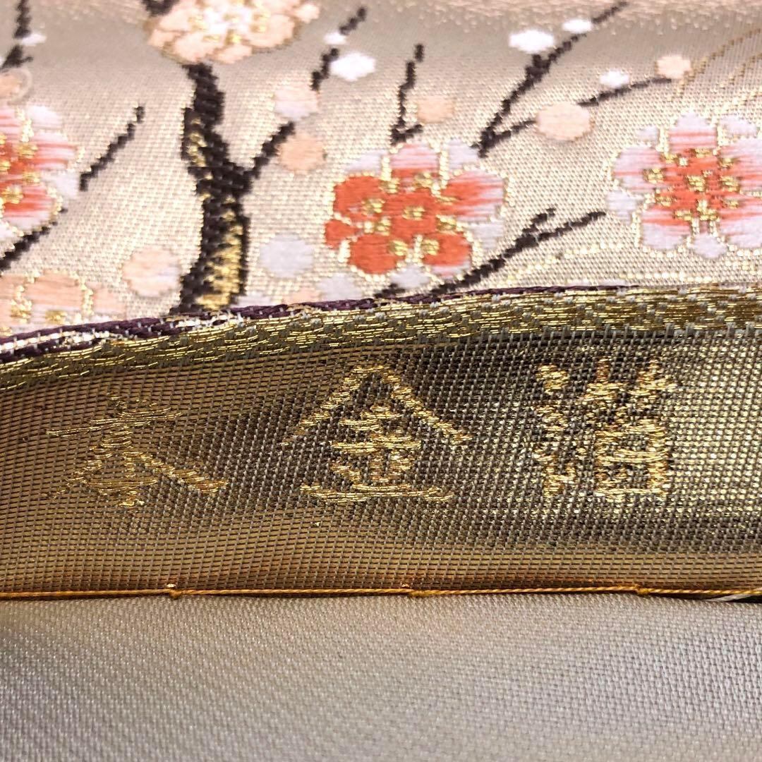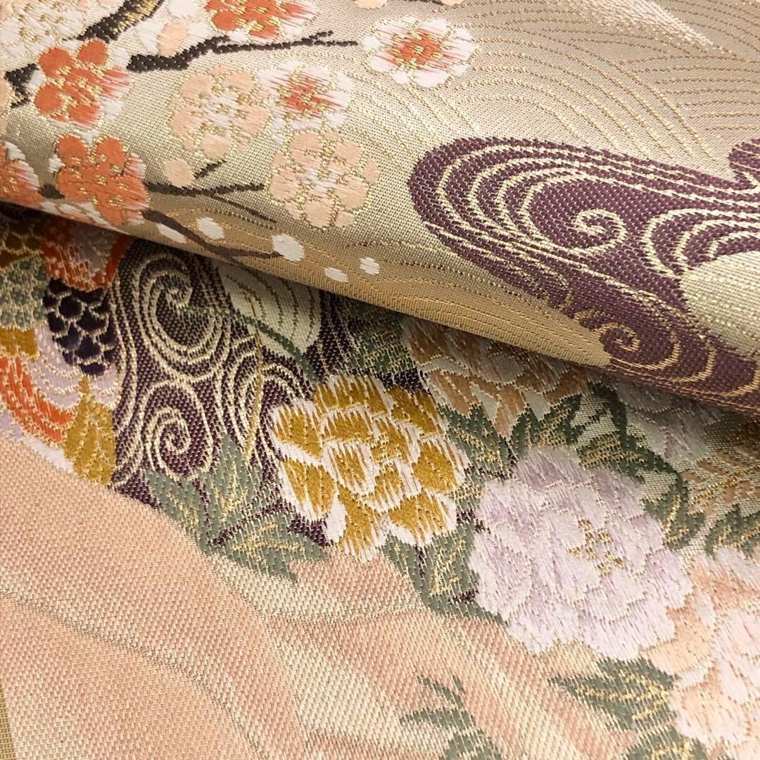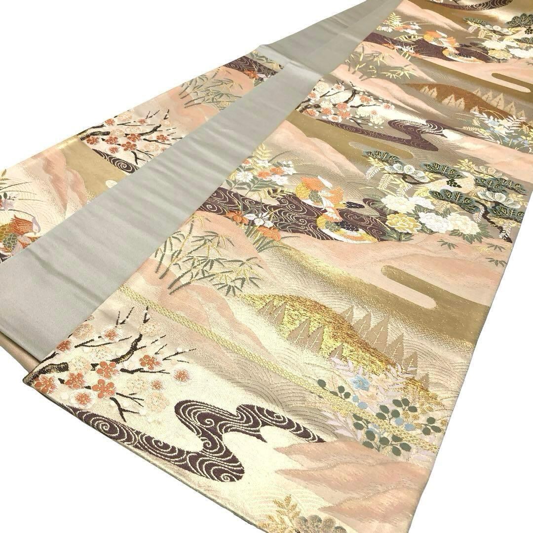 金色ベースのお色味、流水に鴛鴦、花模様などの雰囲気の良い風景がデザインされた煌びやかで素敵な柄裄のお品でございます。