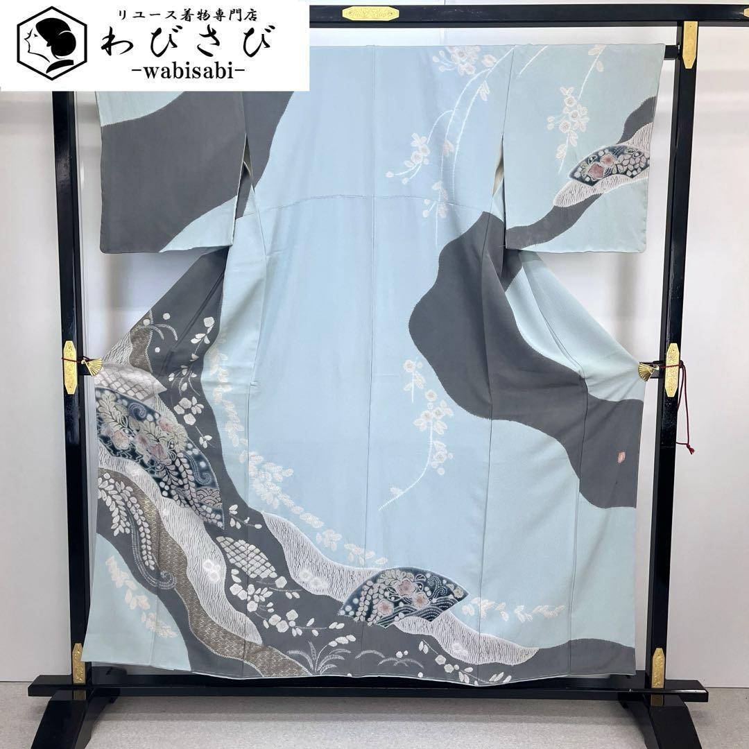 秘色の品のあるお色味に美しい辻が花絞りの柄裄がデザインされた素敵なお品でございます。