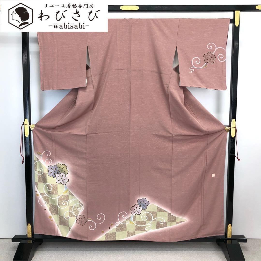 付下げ 作家物 梅の花 市松模様 金彩 薄紅色 しつけ糸 縮緬 K-4305