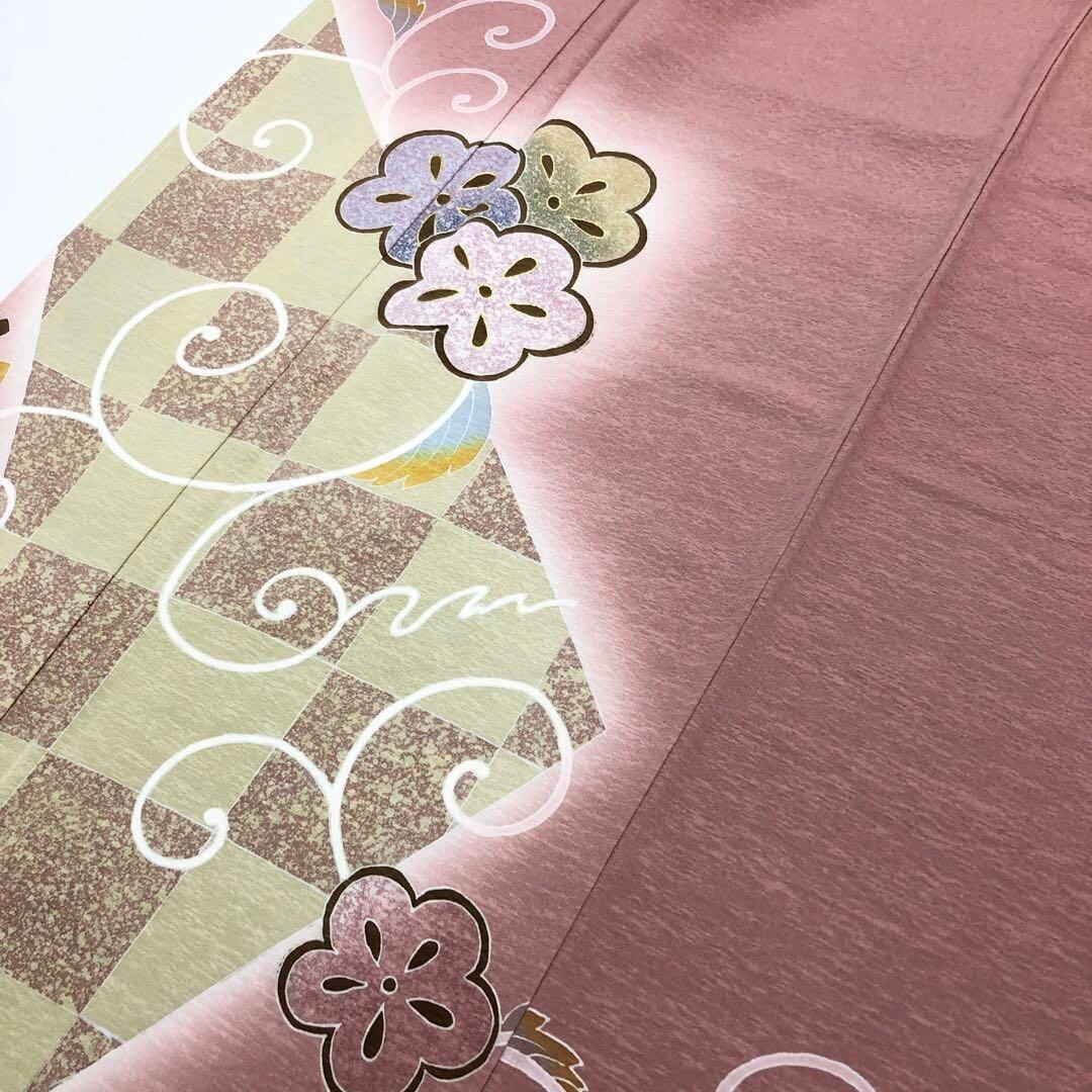 薄紅色のお色味の縮緬に可愛らしい梅の花、市松模様の柄裄がデザインされた素敵なお品でございます。