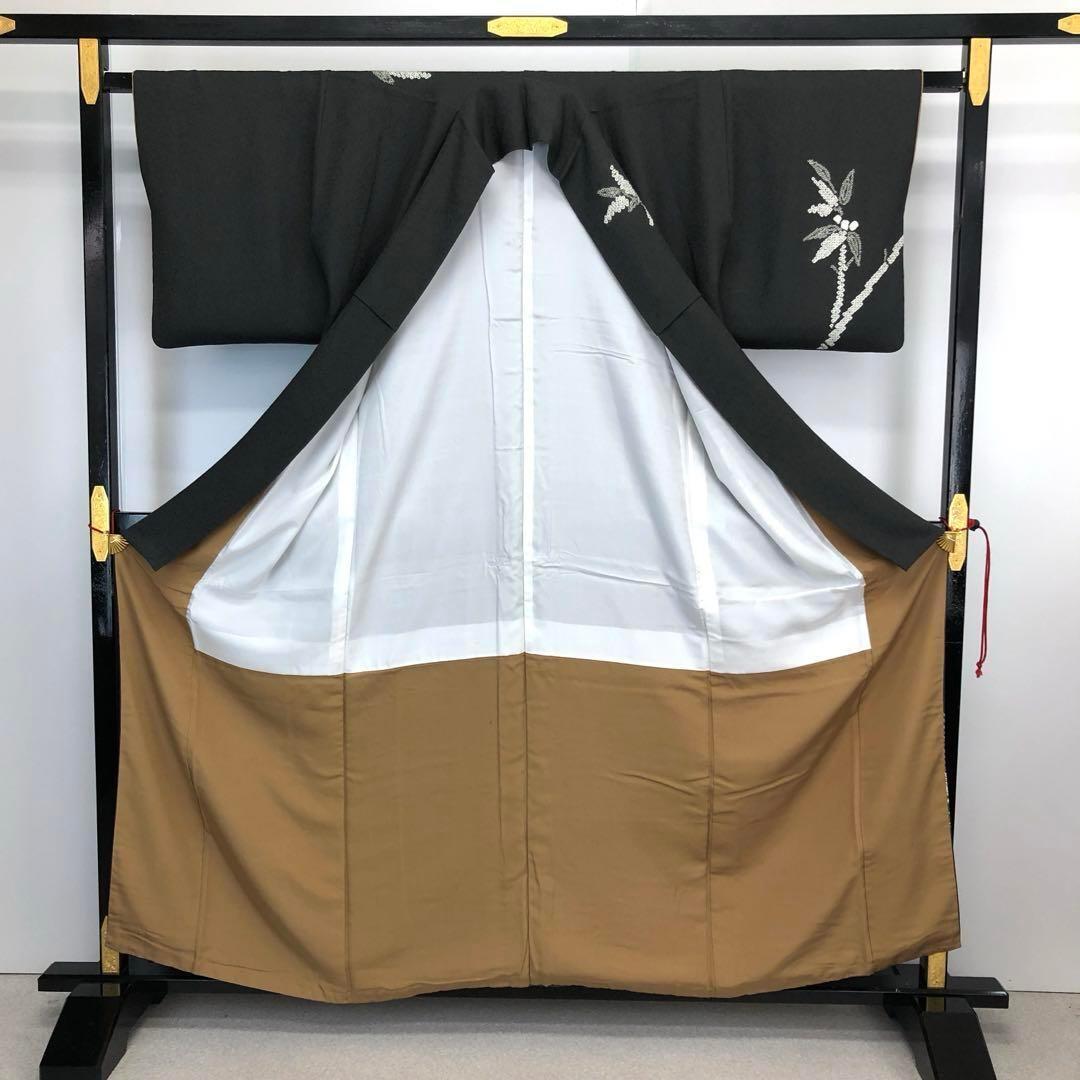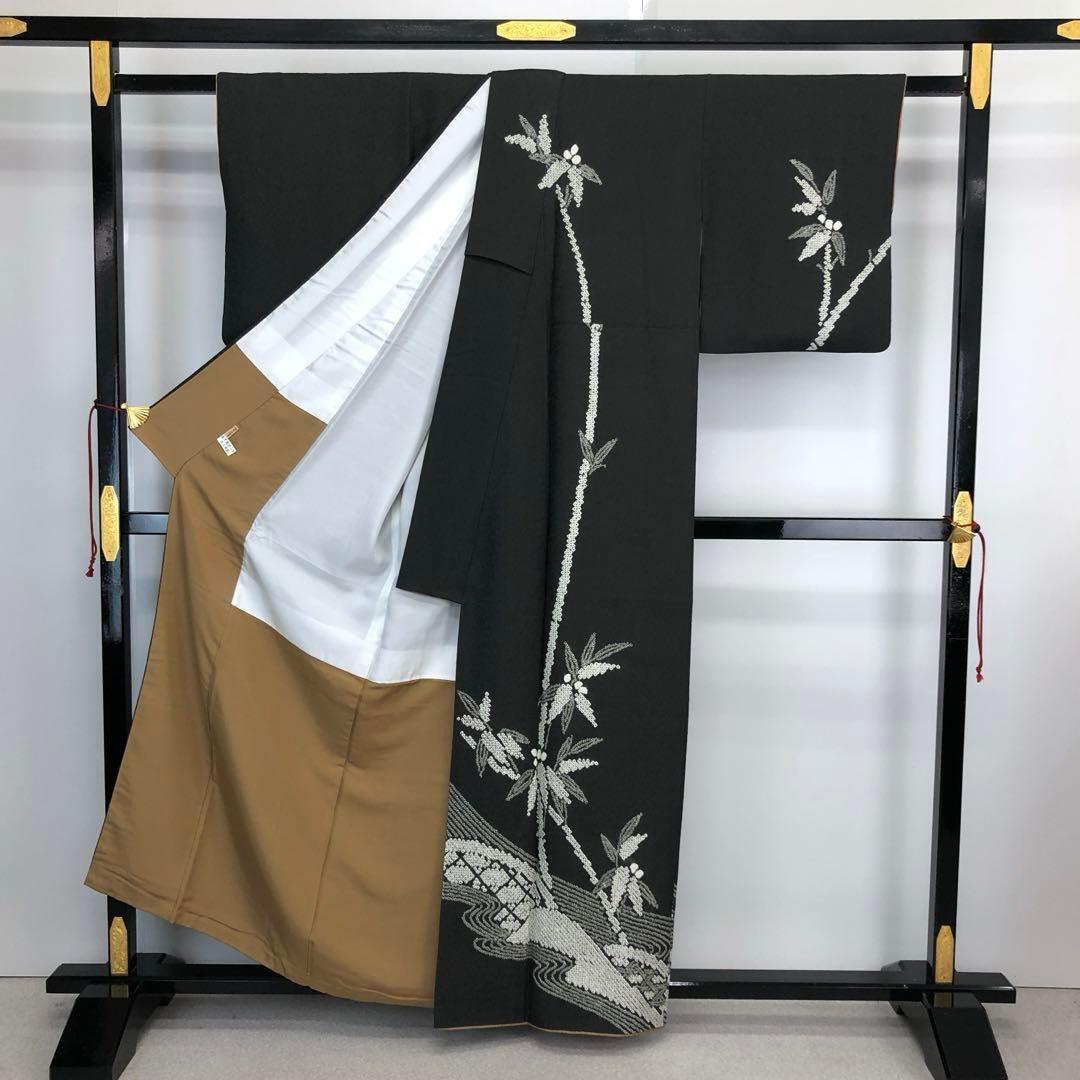 消炭色の落ち着いたお色味に葉模様、流水模様などの柄裄がデザインされた素敵なお品でございます。
