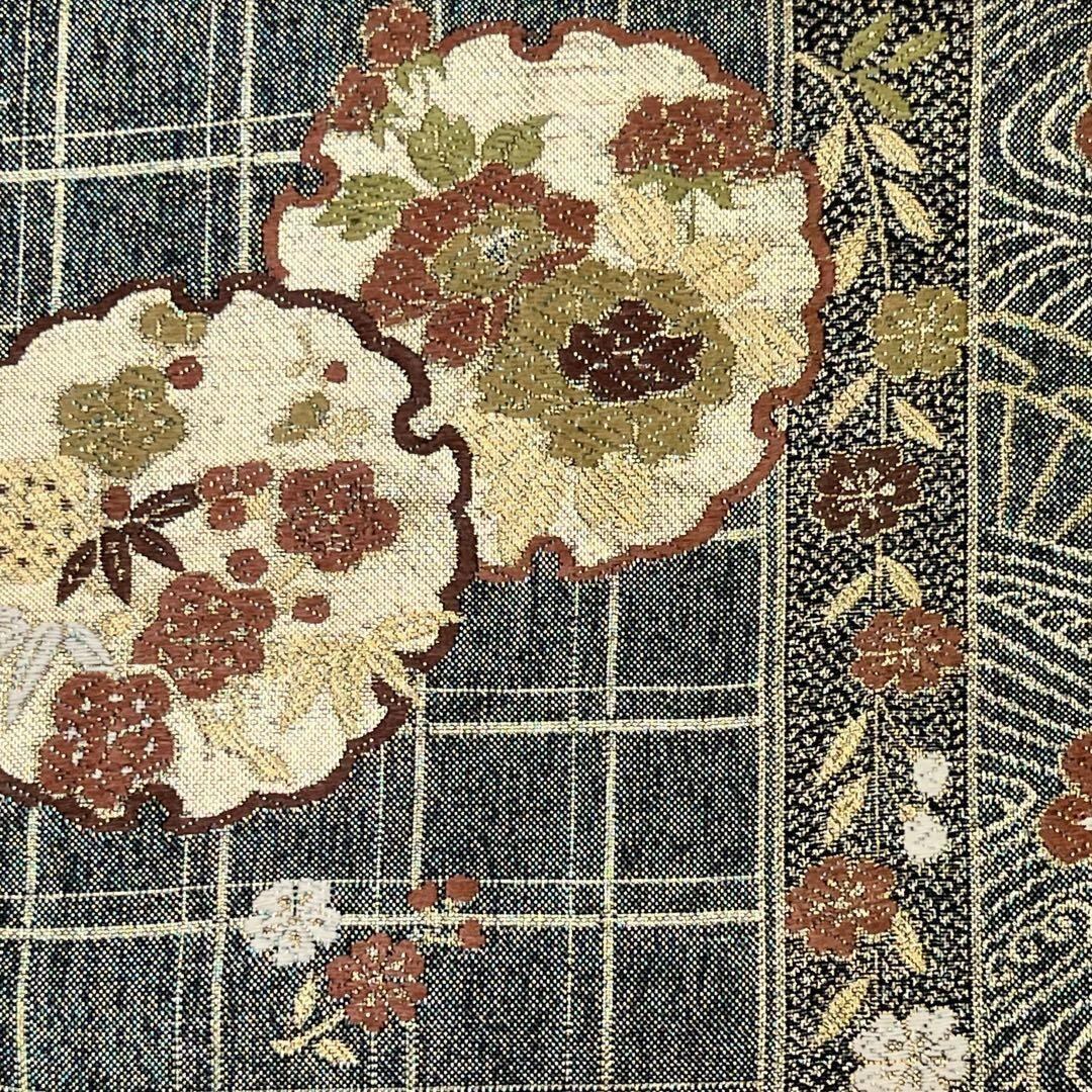 袋帯 雪輪に花模様 格子柄 金糸 深藍色 O-4556 着物 きもの kimono 和服 和装 中古 リサイクル着物 【送料無料】