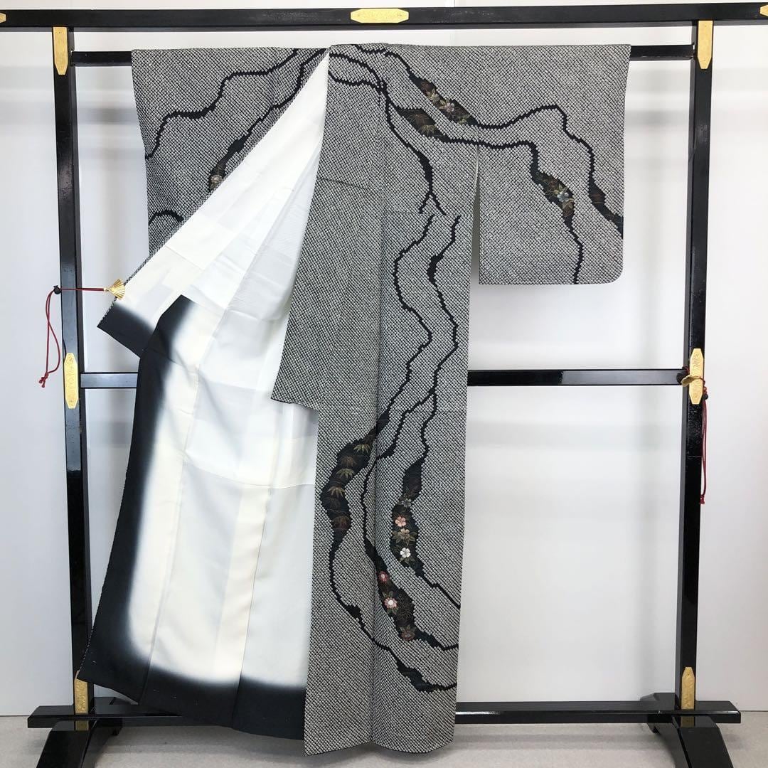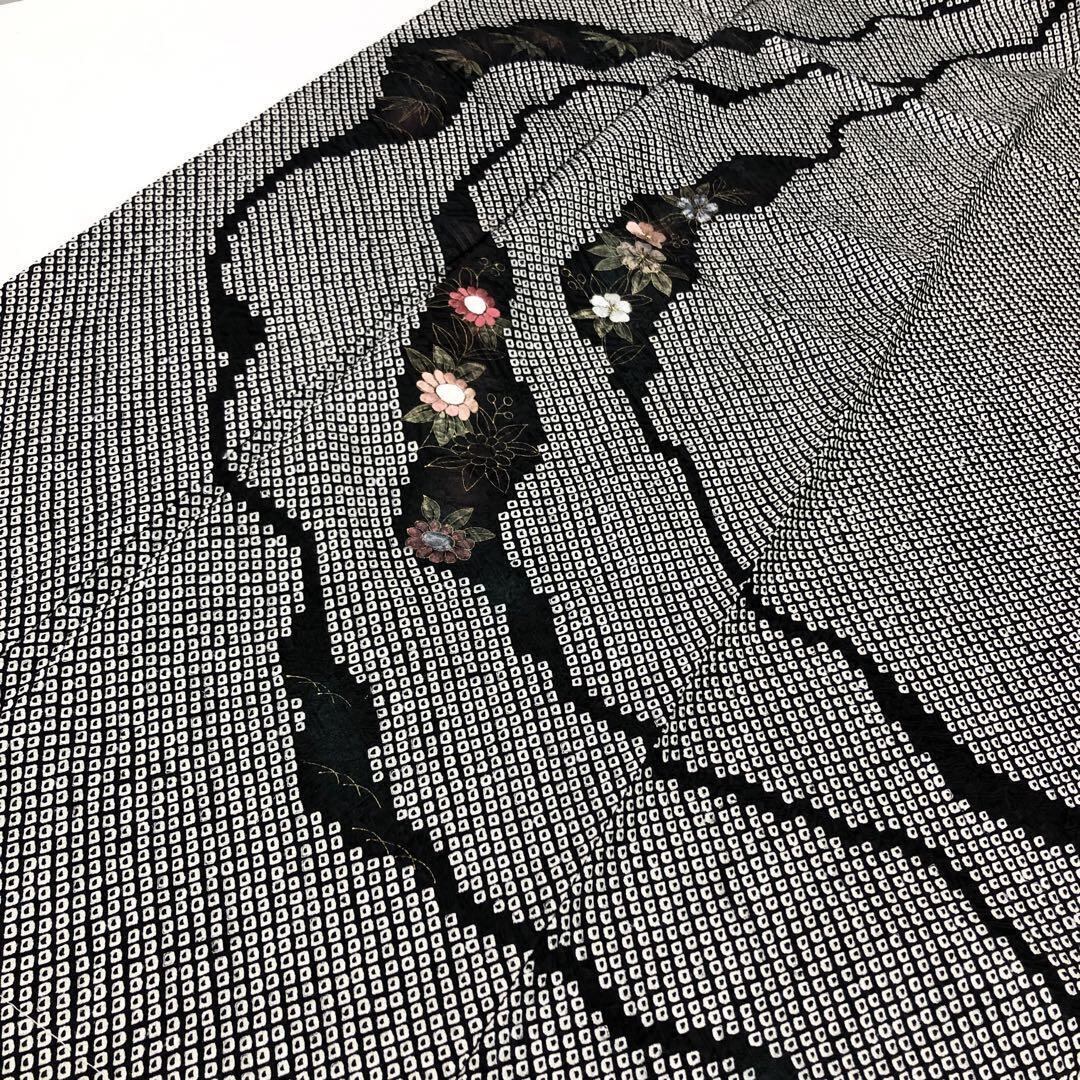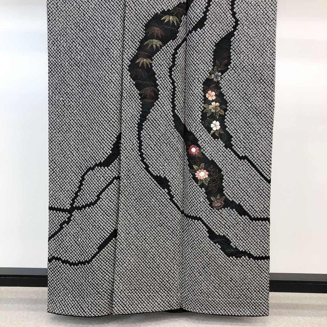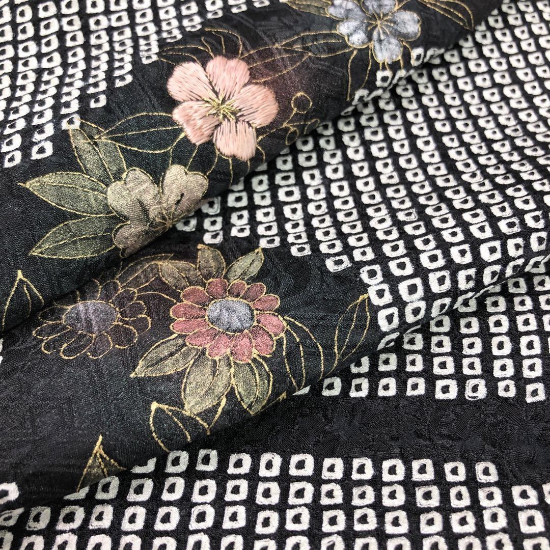 黒色のお色味の総絞りに刺繍の花模様の柄裄がデザインされた素敵なお品でございます。
