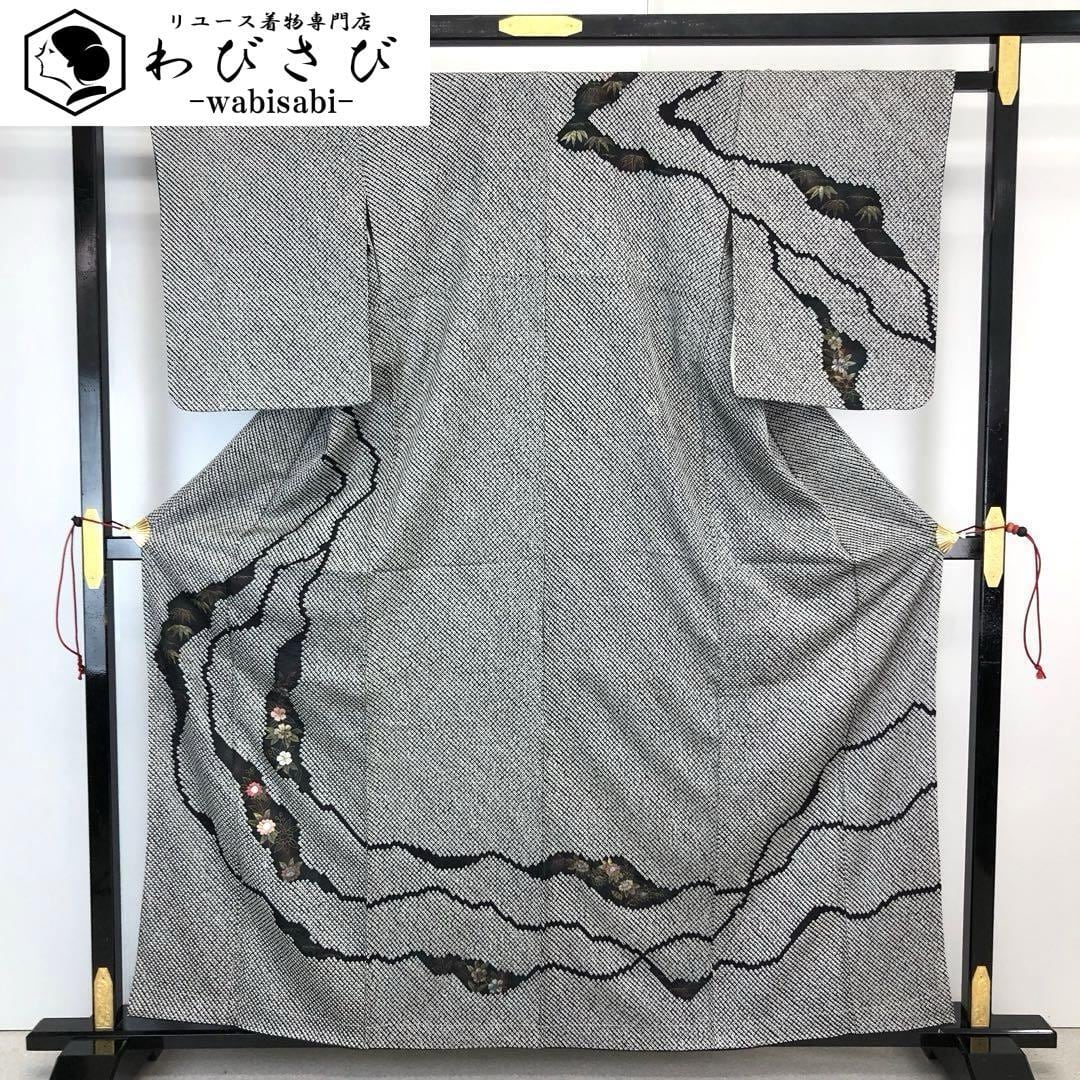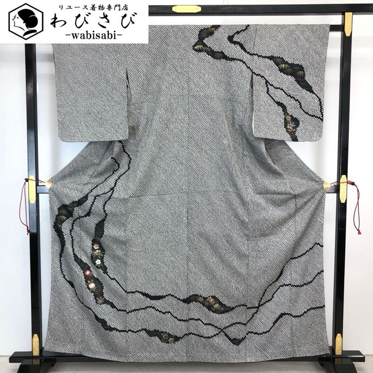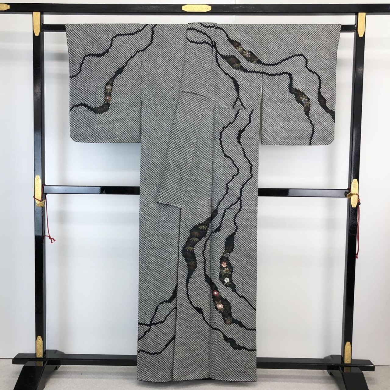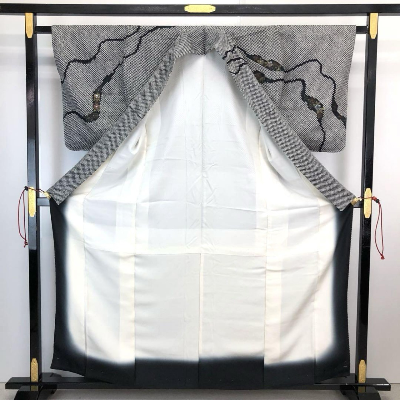 黒色のお色味の総絞りに刺繍の花模様の柄裄がデザインされた素敵なお品でございます。