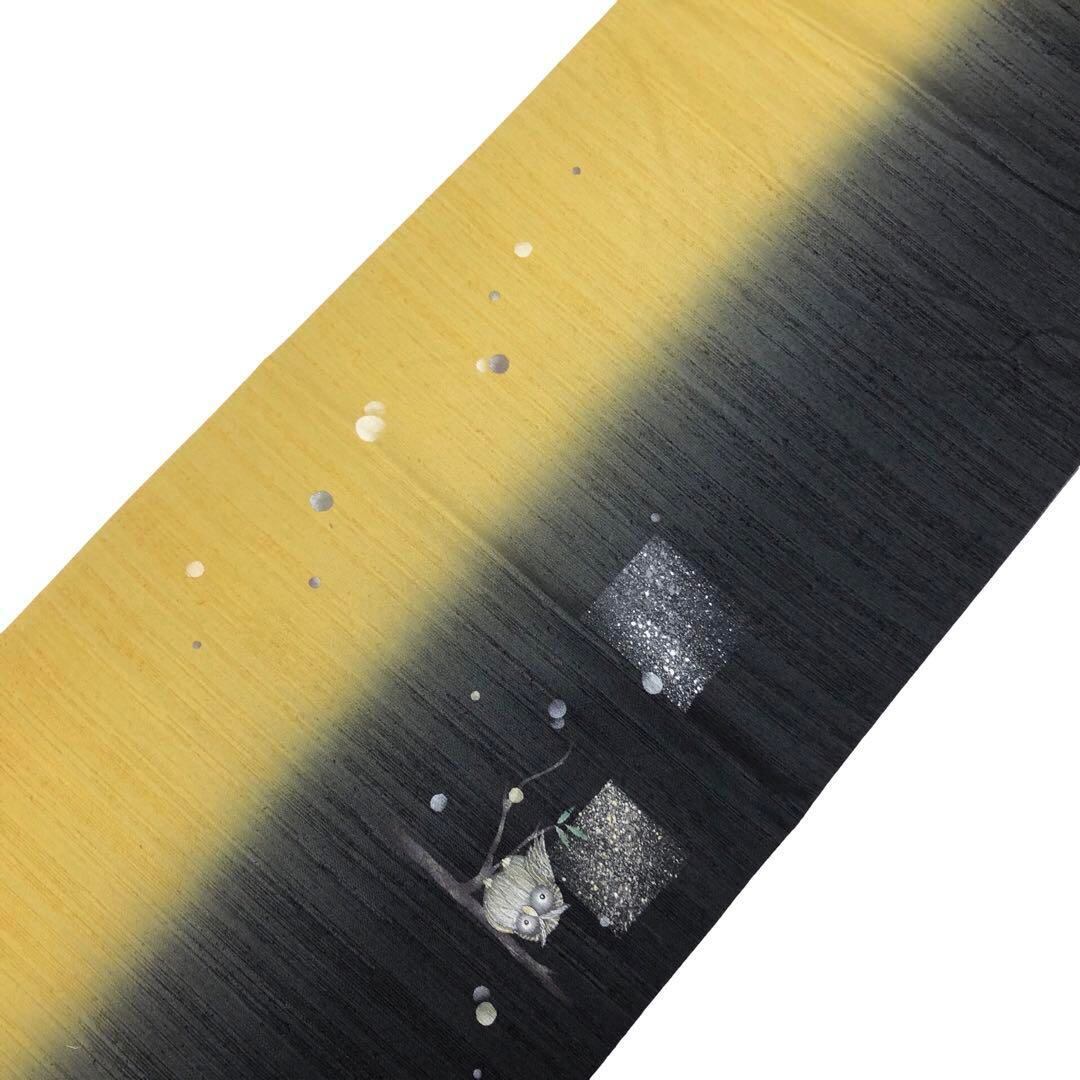 袋帯 手描き 木にとまる梟 縦柄グラデーション 紬 ガード加工 O-4564