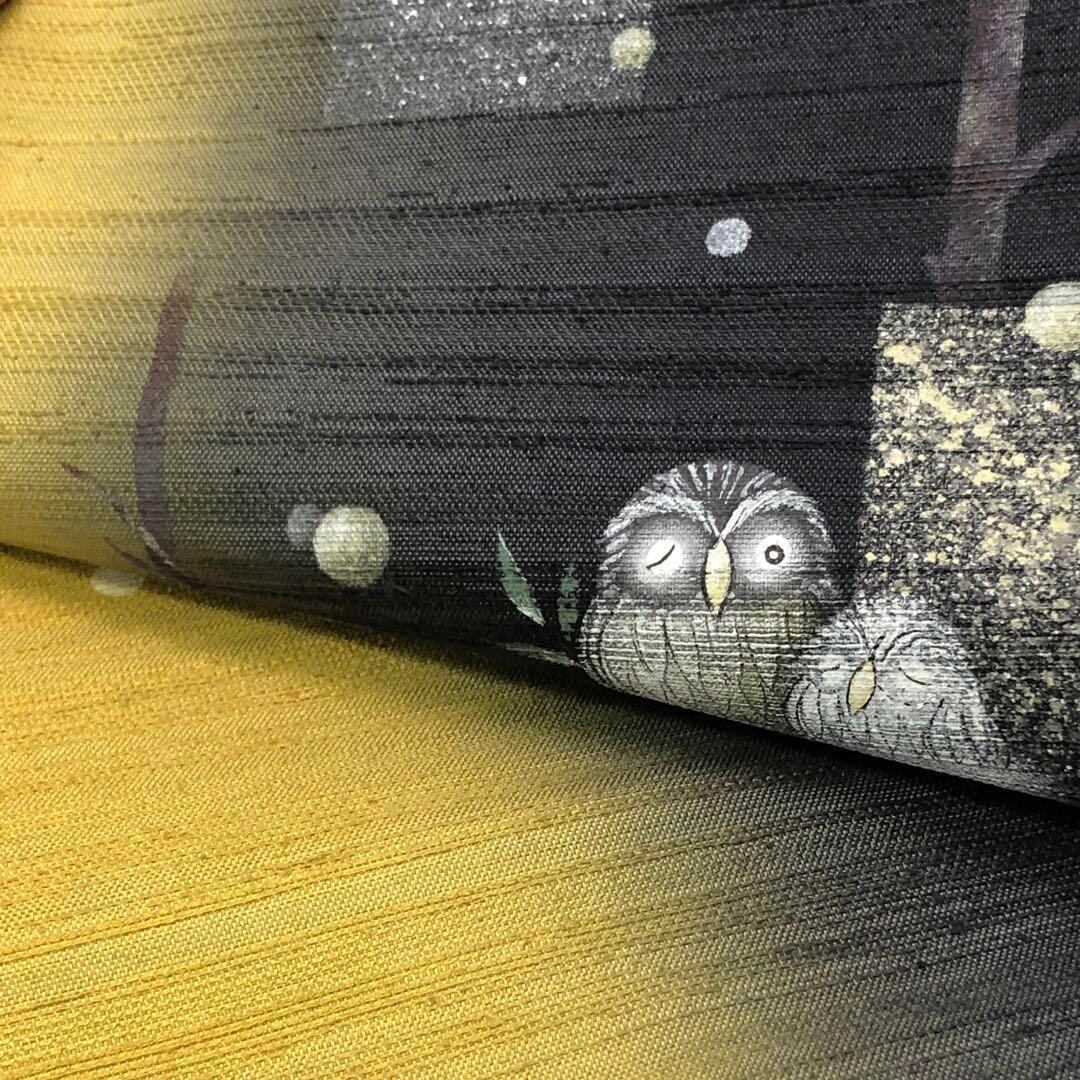 青褐色ベースの縦柄グラデーションの紬地に手描きの木にとまる梟の柄裄がデザインされた素敵なお品でございます。