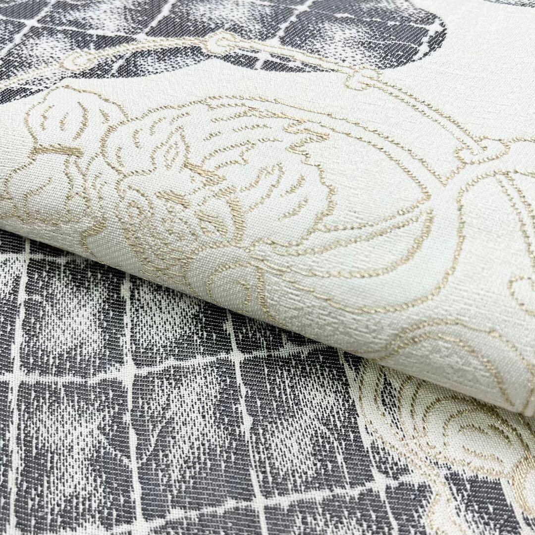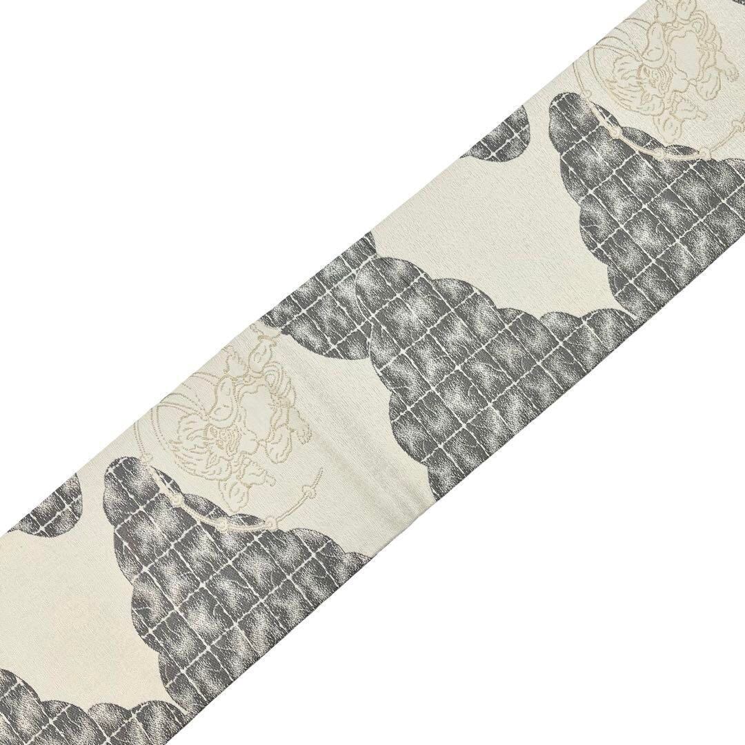乳白色のお色味に格子柄、風神雷神の織柄がデザインされた素敵なお品でございます。