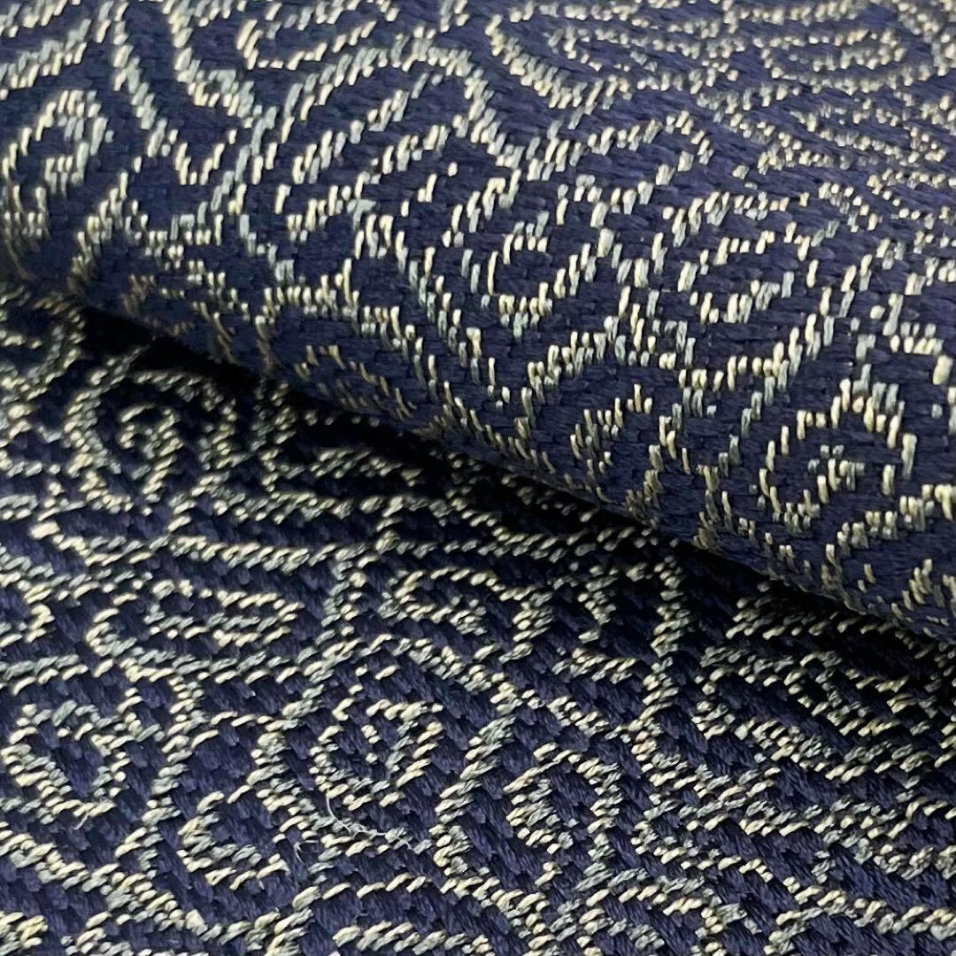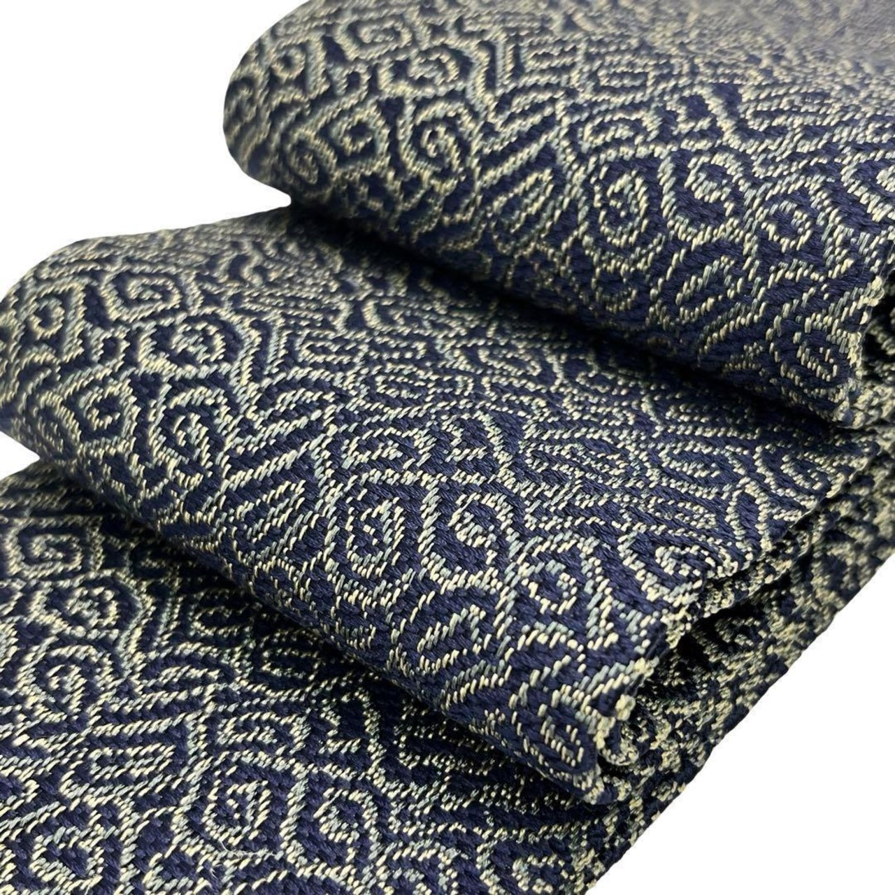 濃藍色のお色味に渦巻模様の織柄がデザインされた素敵なお品でございます。