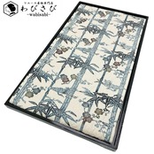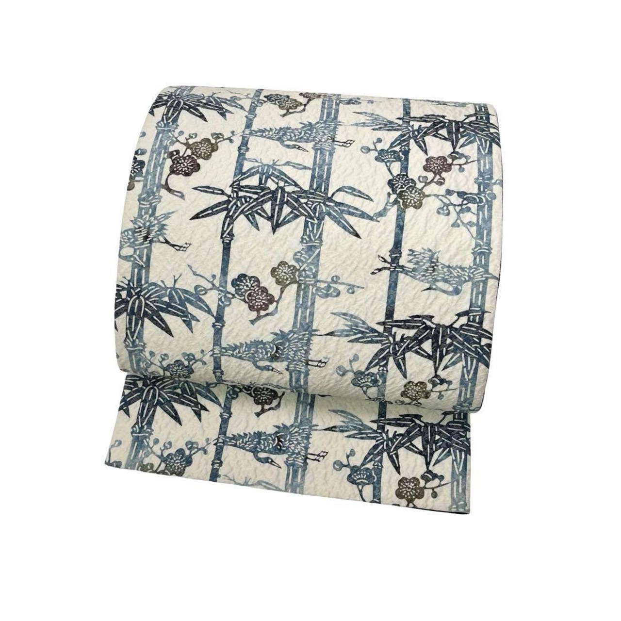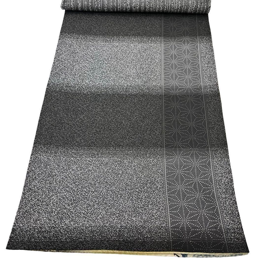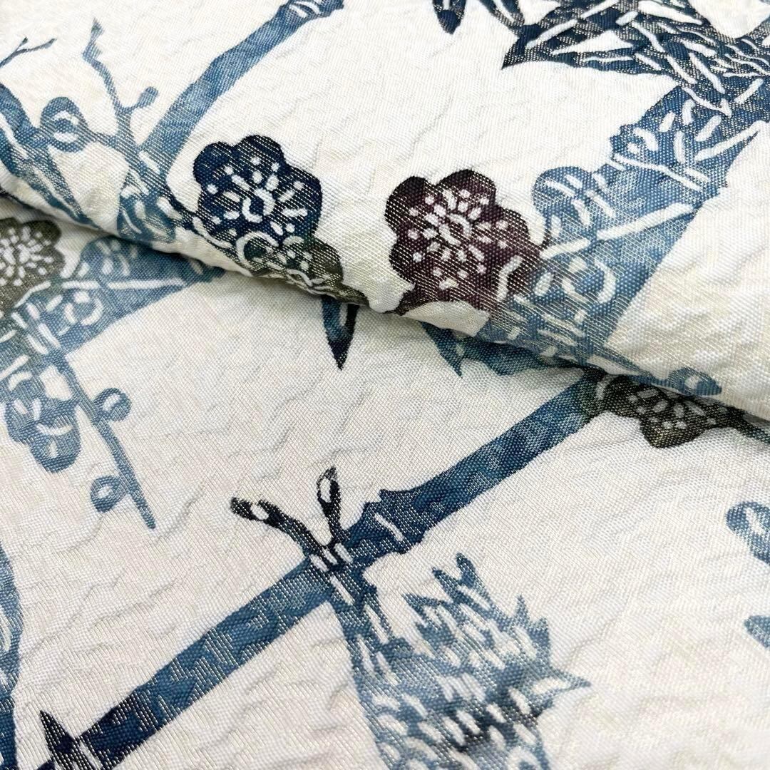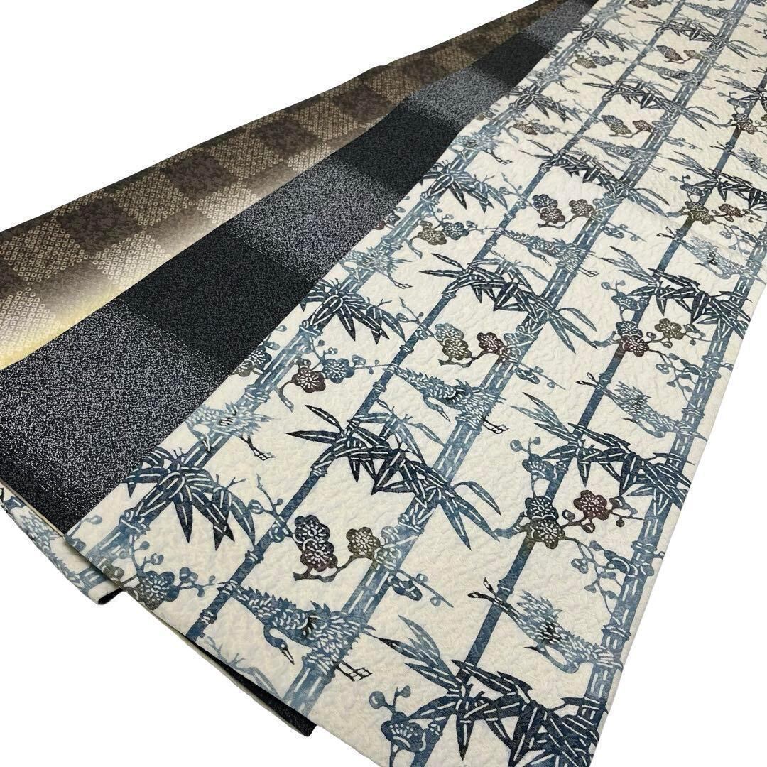 青味の美しい竹梅鶴などの染柄、格子柄にグラデーションの柄裄がデザインされた両面使える素敵なお品でございます。