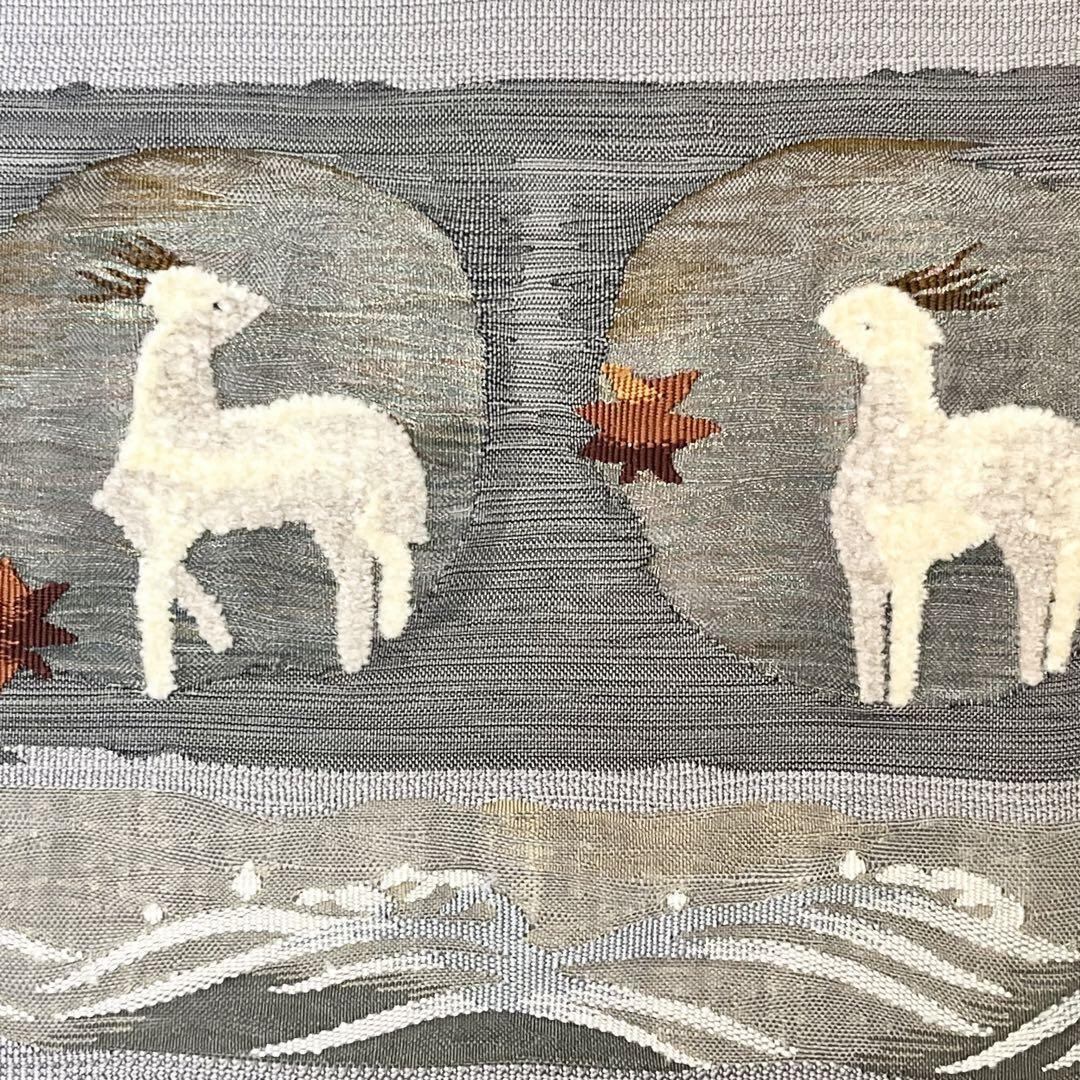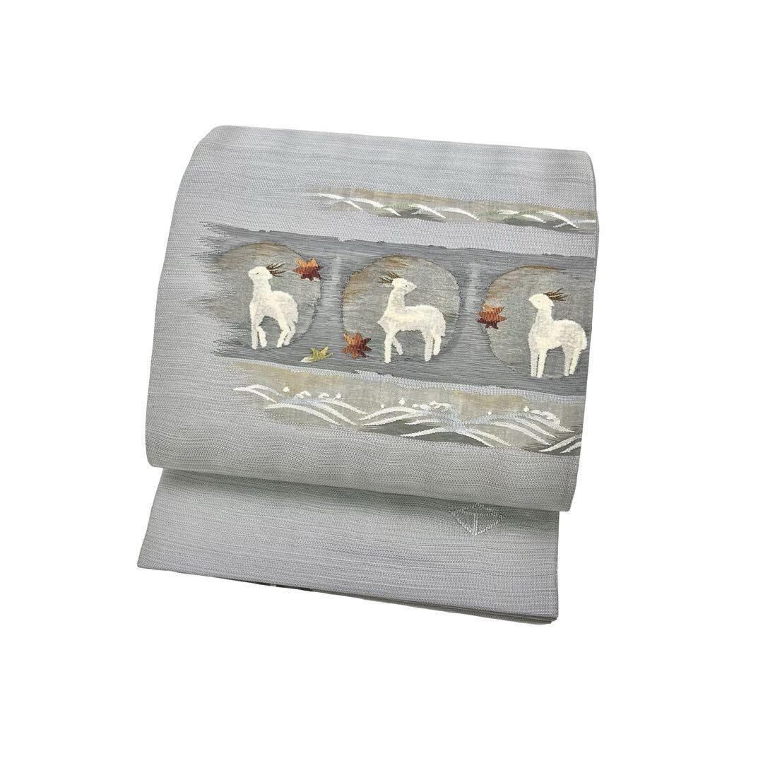 袋帯 三匹の山羊 ヤギ モール柄 波模様 灰色 ガード加工 O-4569 着物 きもの kimono 和服 和装 中古 リサイクル着物 【送料無料】