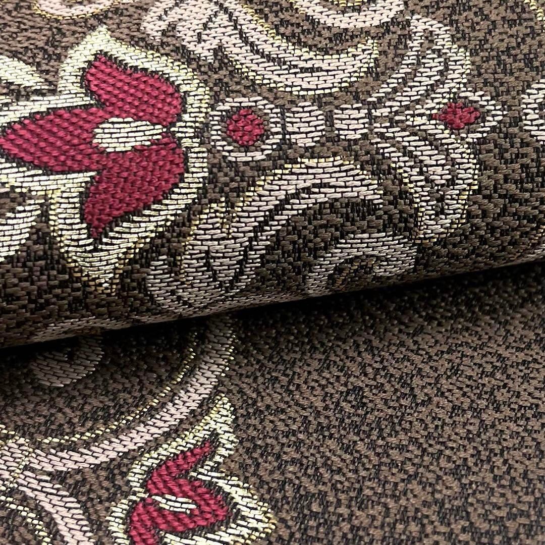 燻色ベースの落ち着きのあるお色味に金糸が使われたモダンな雰囲気の華模様がデザインされた素敵なお品でございます。