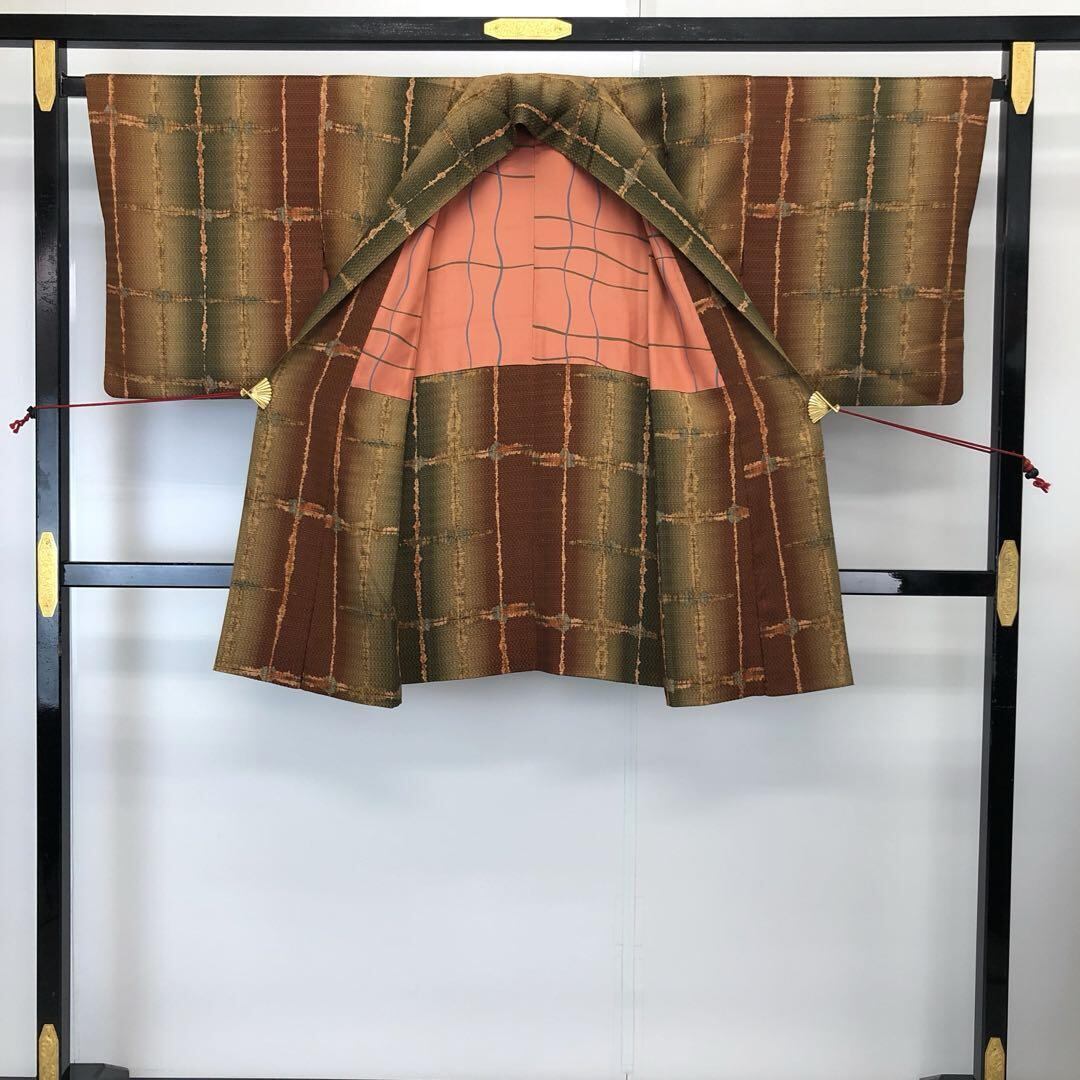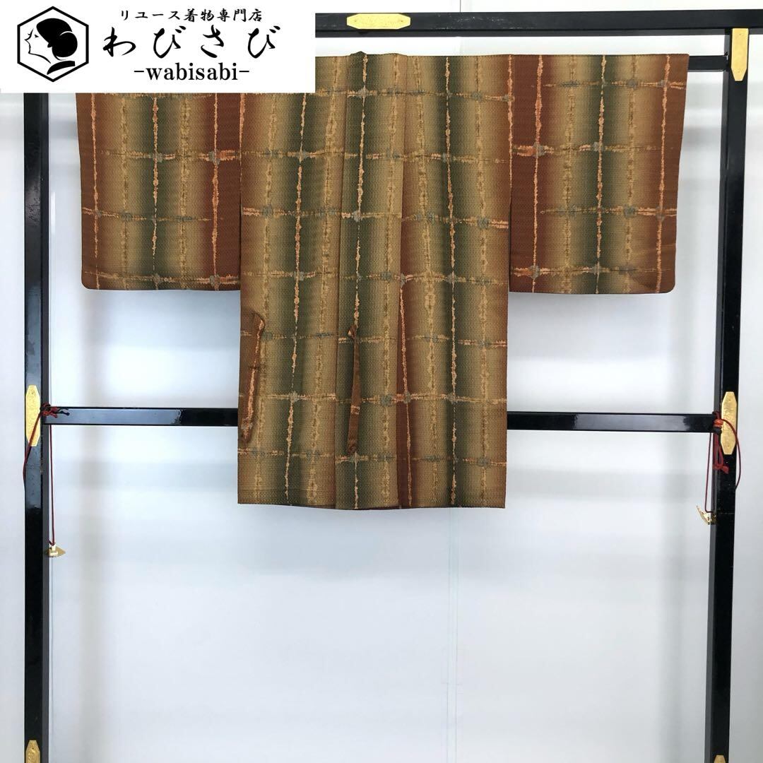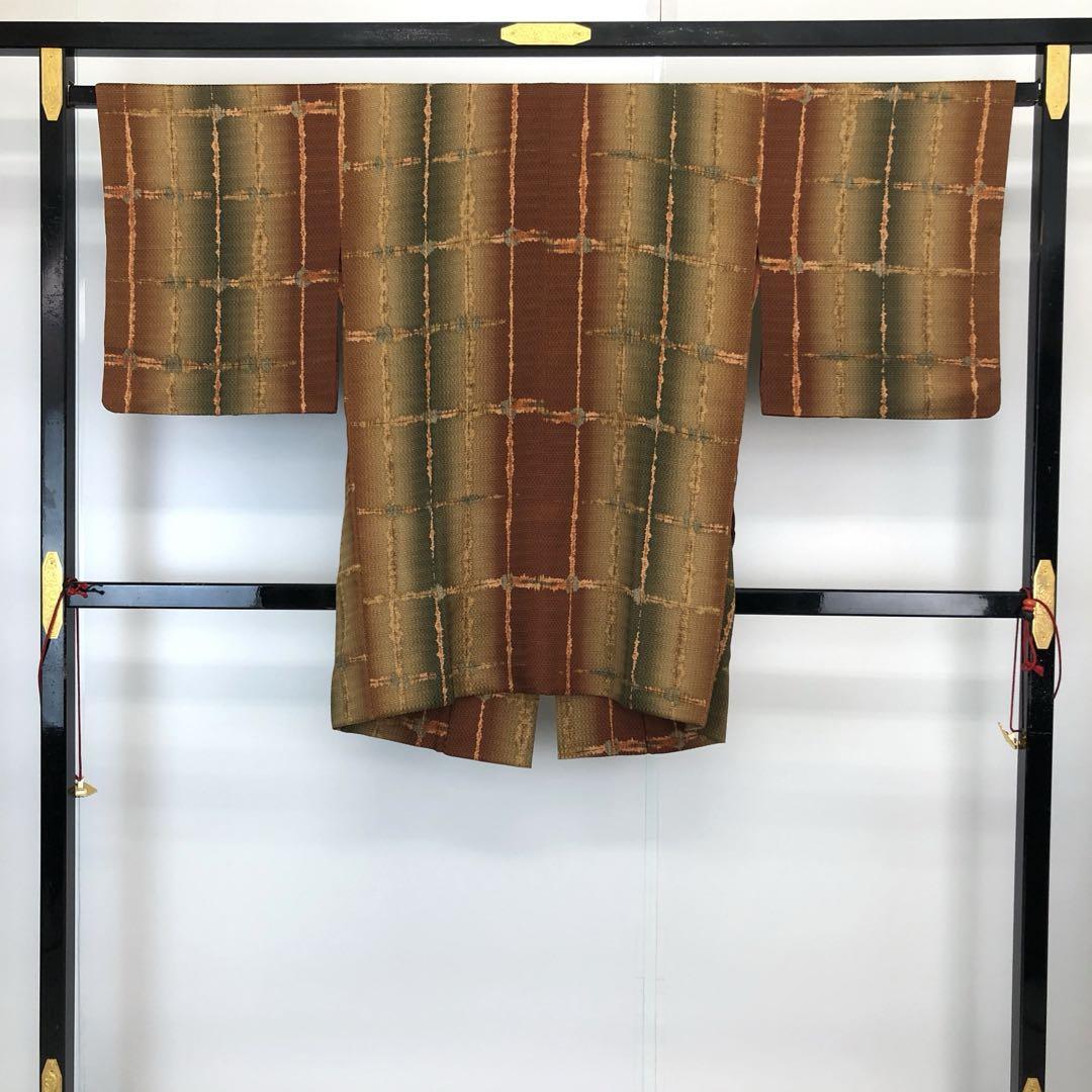 黄土色ベースの落ち着きのあるグラデーションのお色味に格子柄裄がデザインされた素敵なお品でございます。