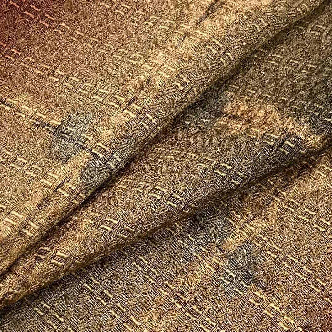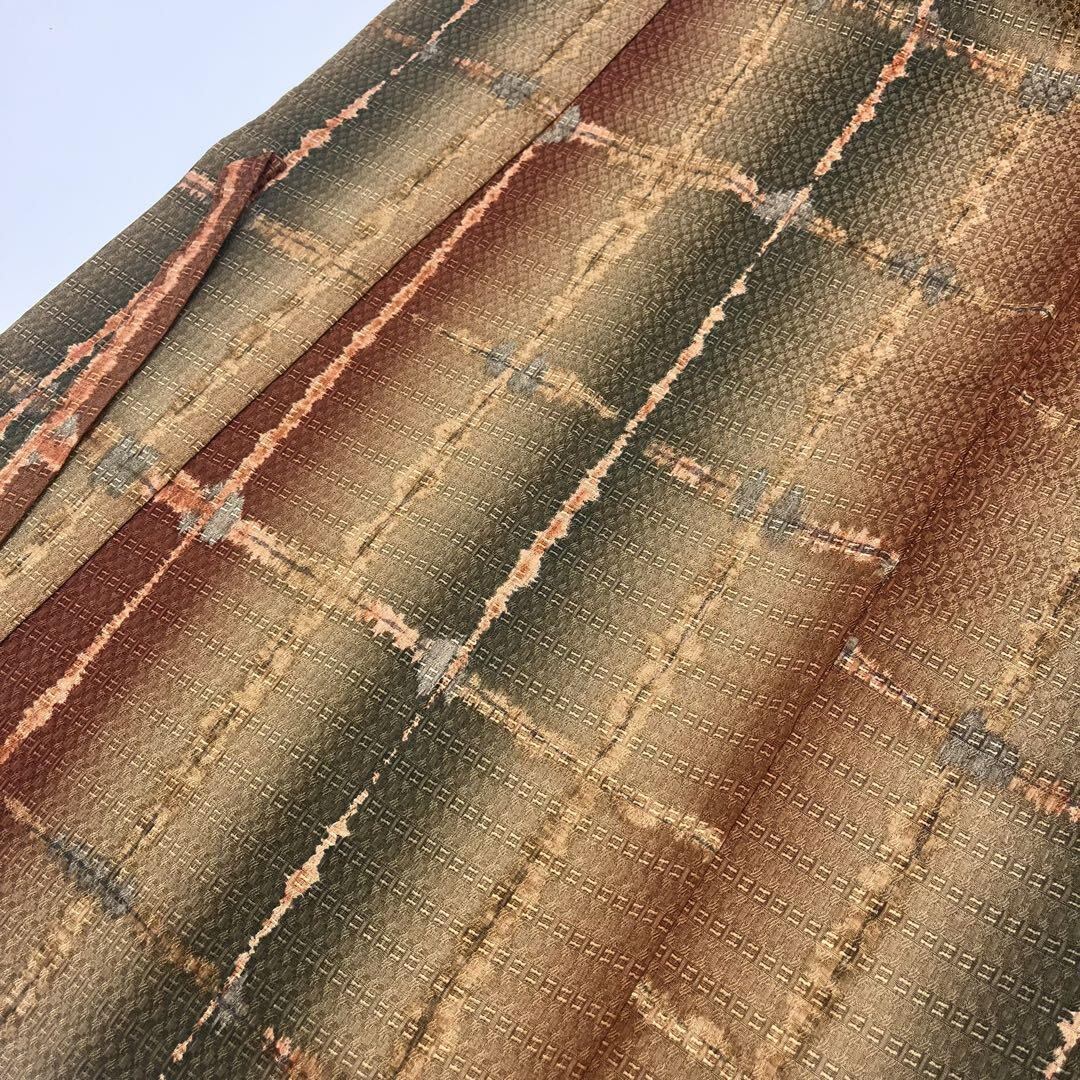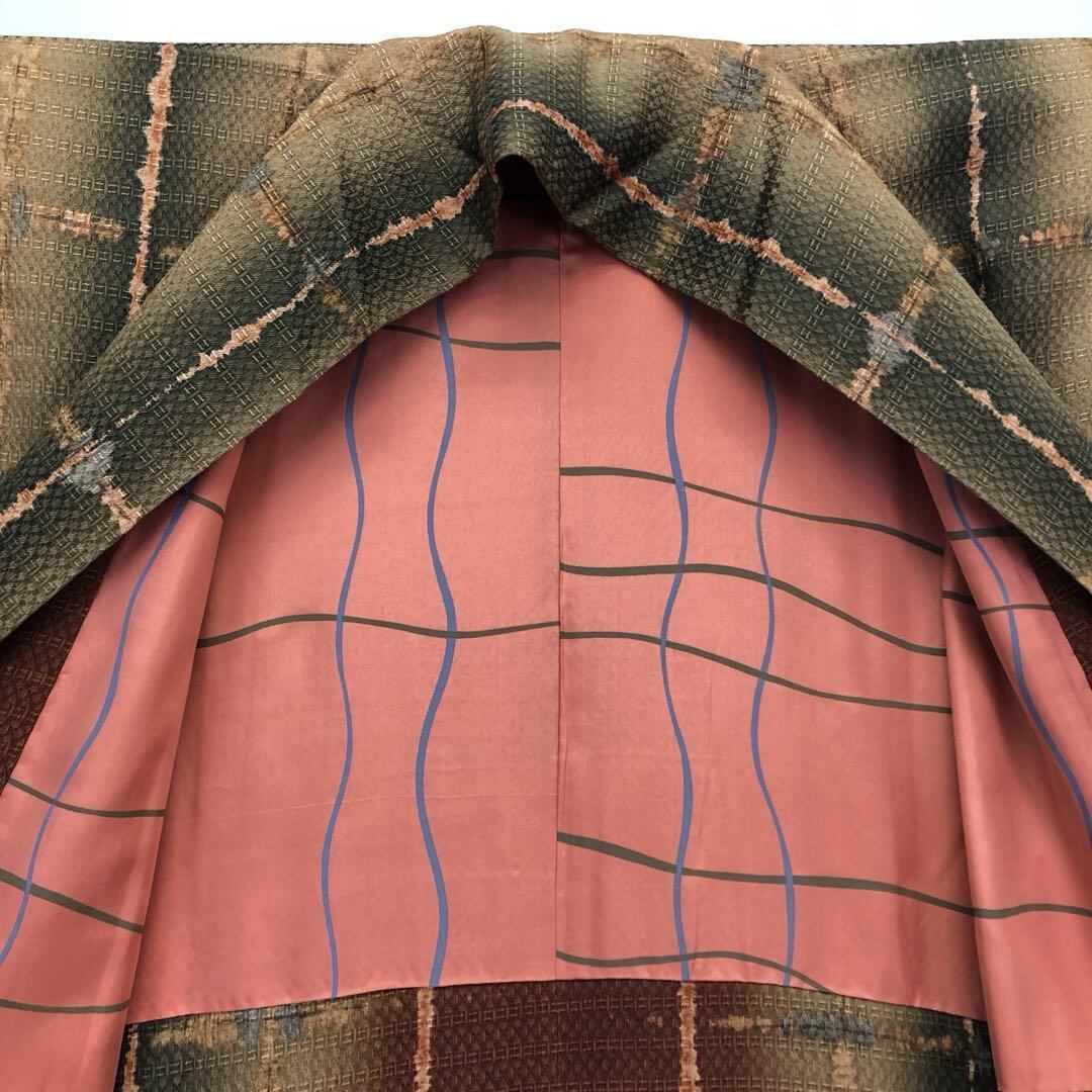 黄土色ベースの落ち着きのあるグラデーションのお色味に格子柄裄がデザインされた素敵なお品でございます。