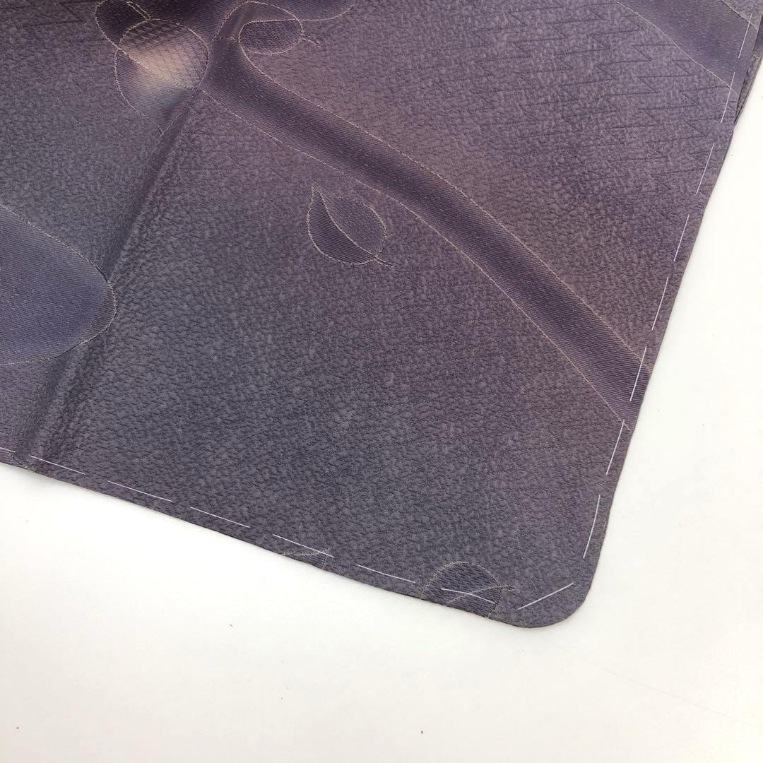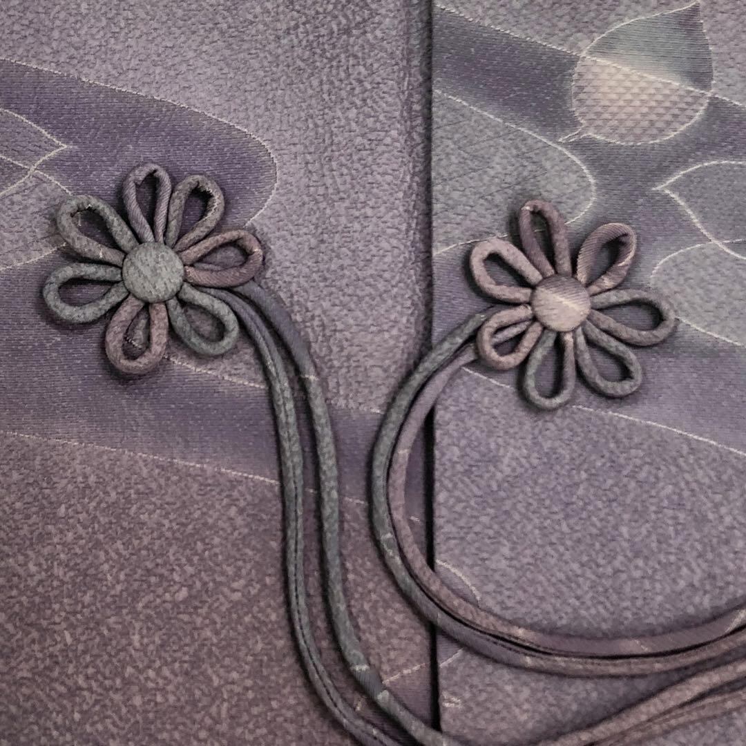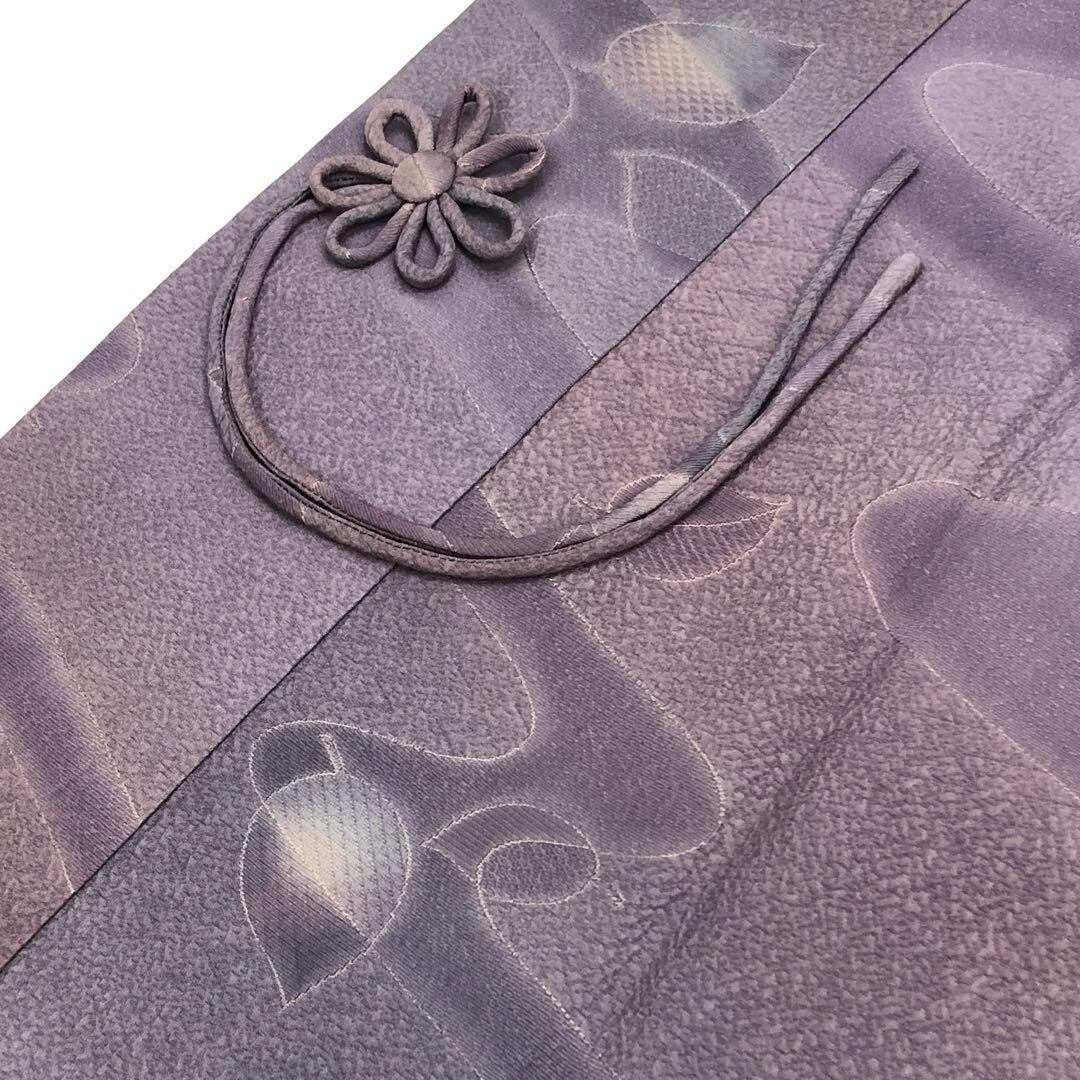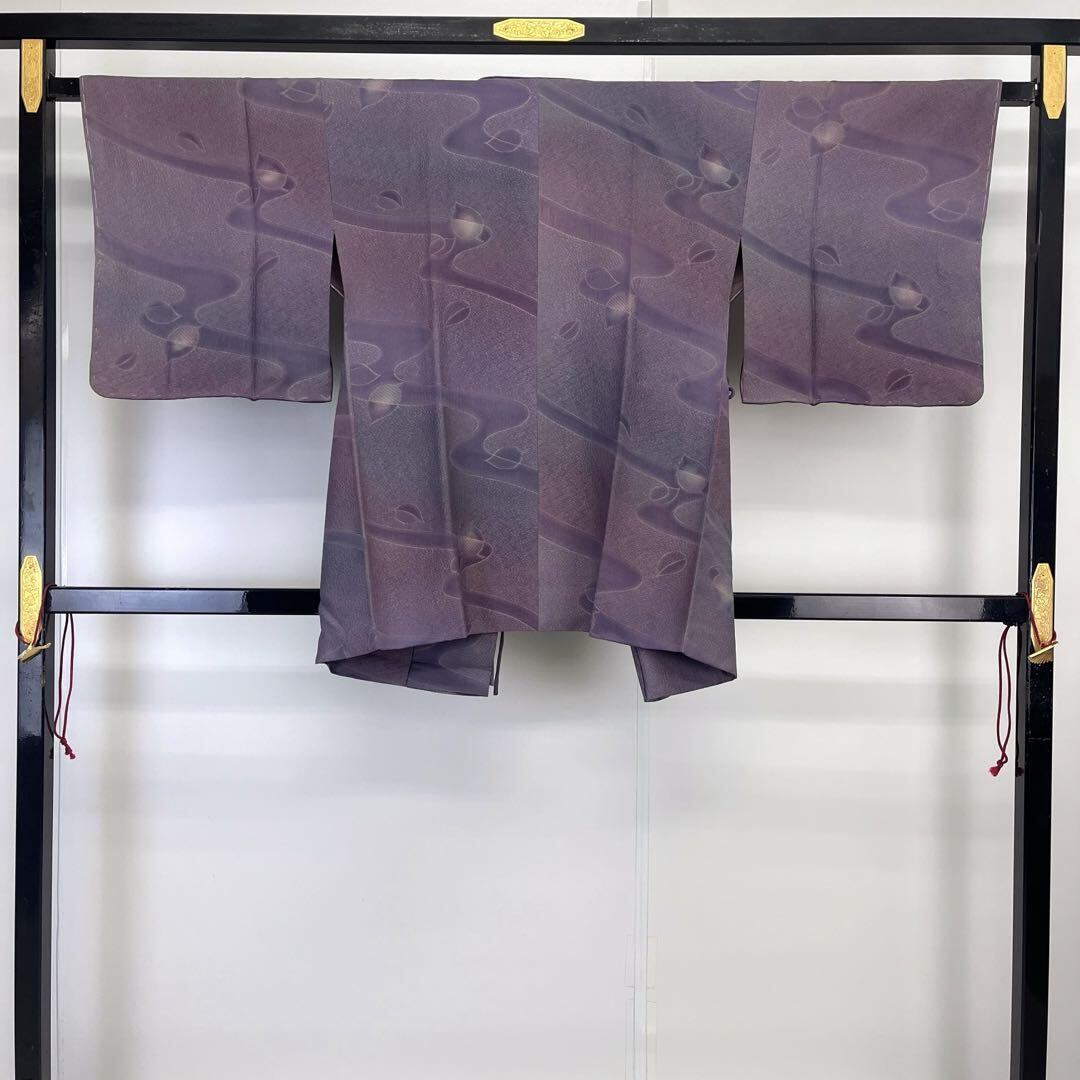 京紫色ベースのお色味に上品な流水に葉模様の柄裄がデザインされた素敵なお品でございます。