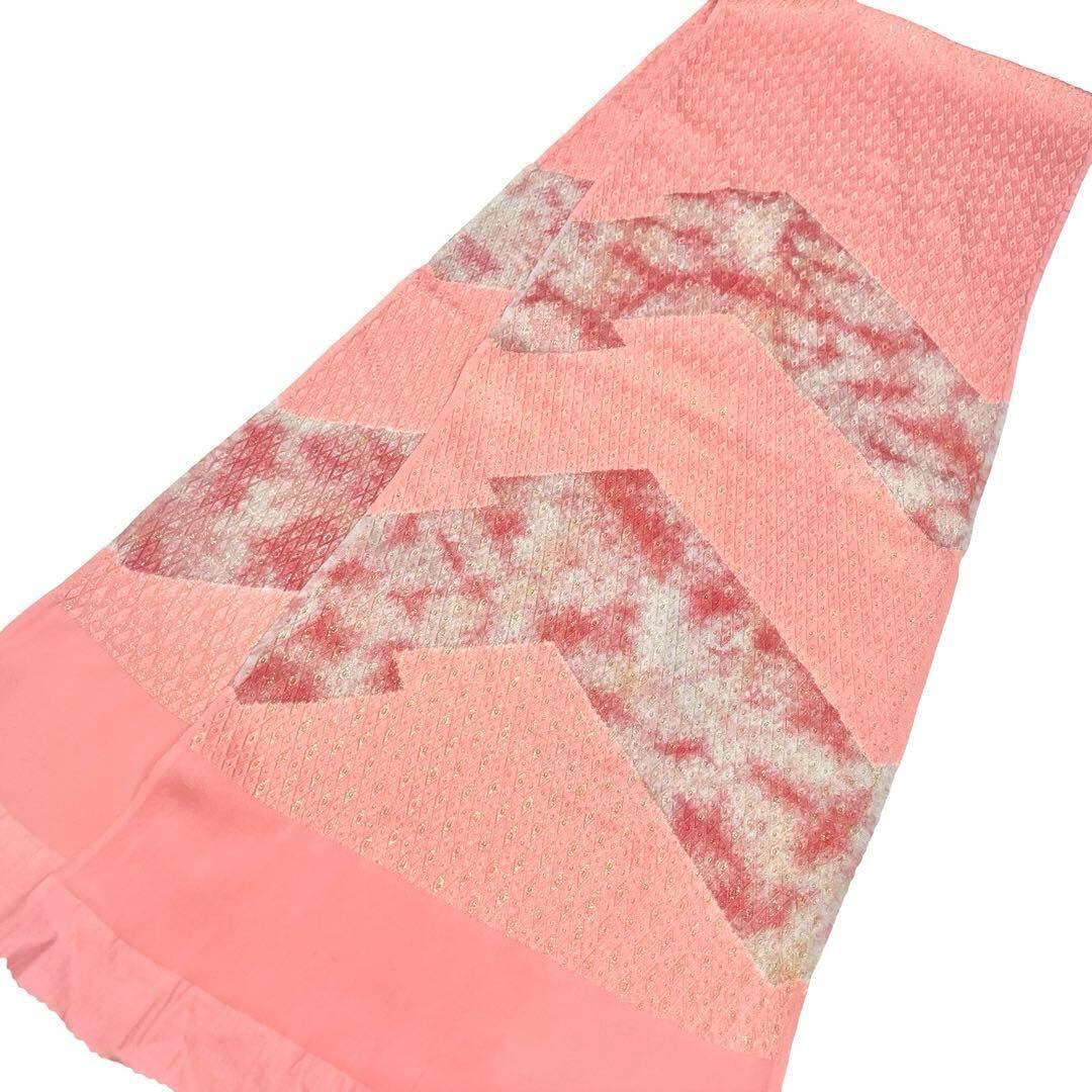 薄紅色ベースのお色味に菱形の地模様、抽象模様の柄裄がデザインされた素敵なお品でございます。
