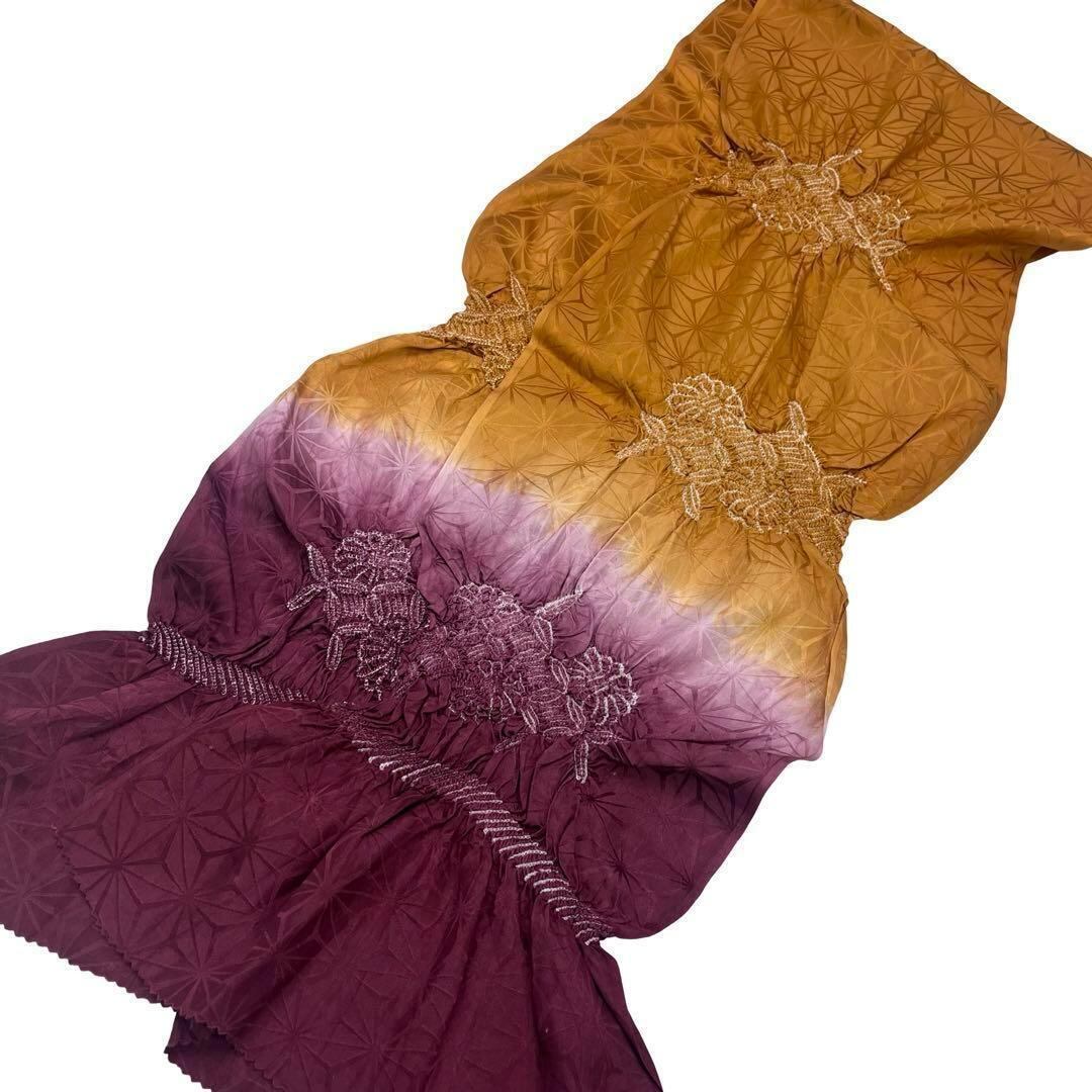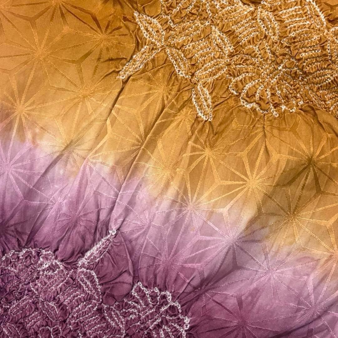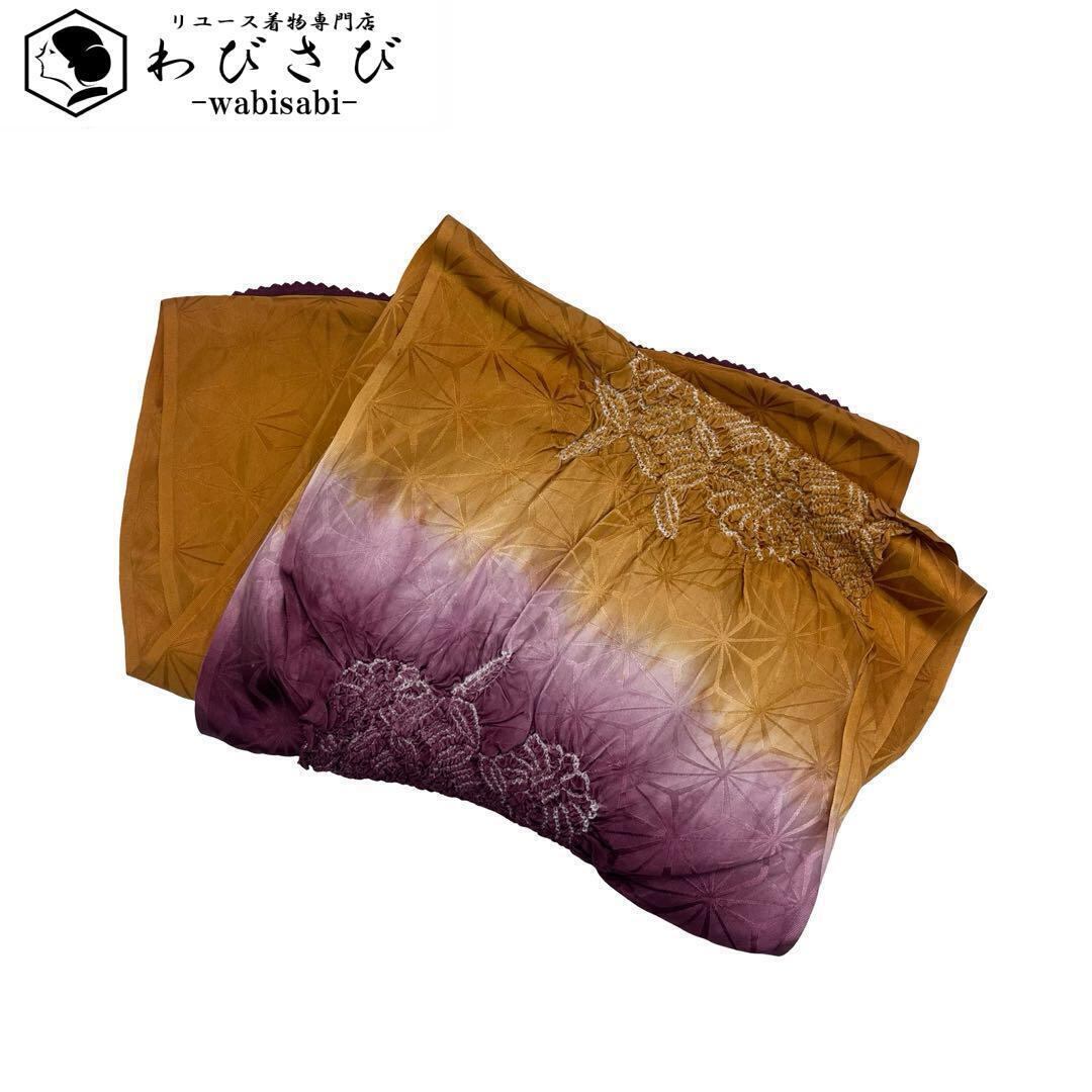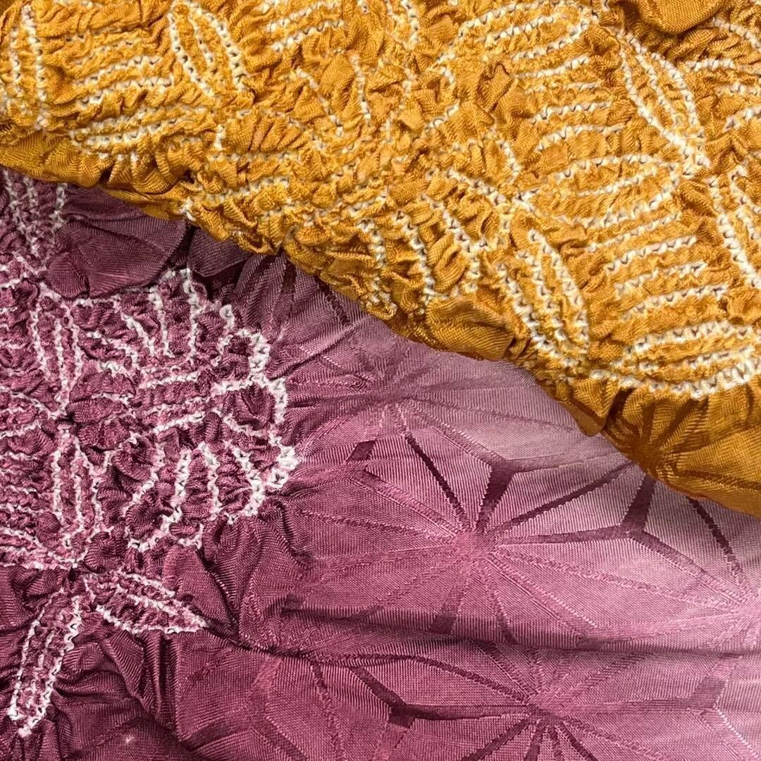 黄茶色と暗紅色のお色味に絞りで花模様がデザインされた素敵なお品でございます。