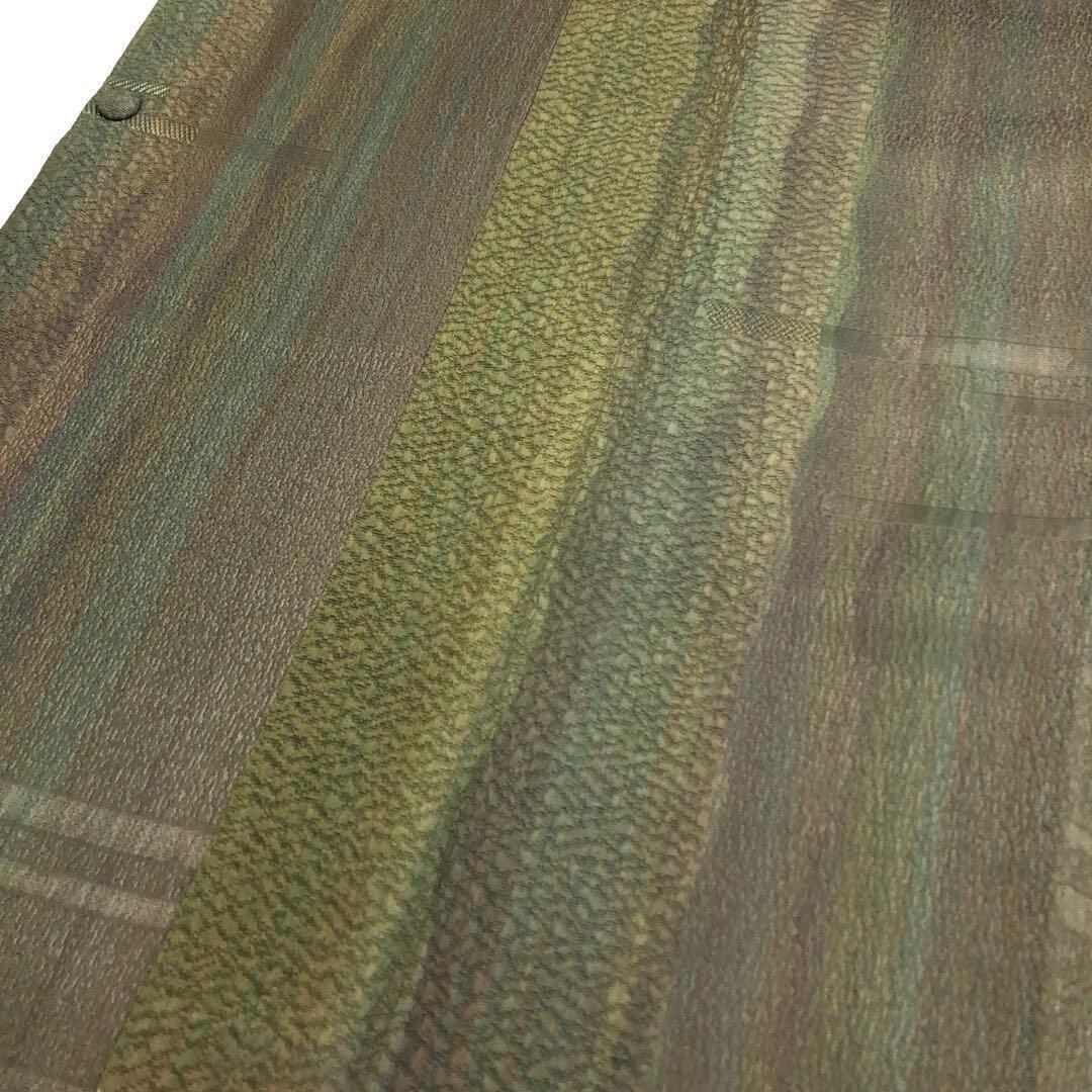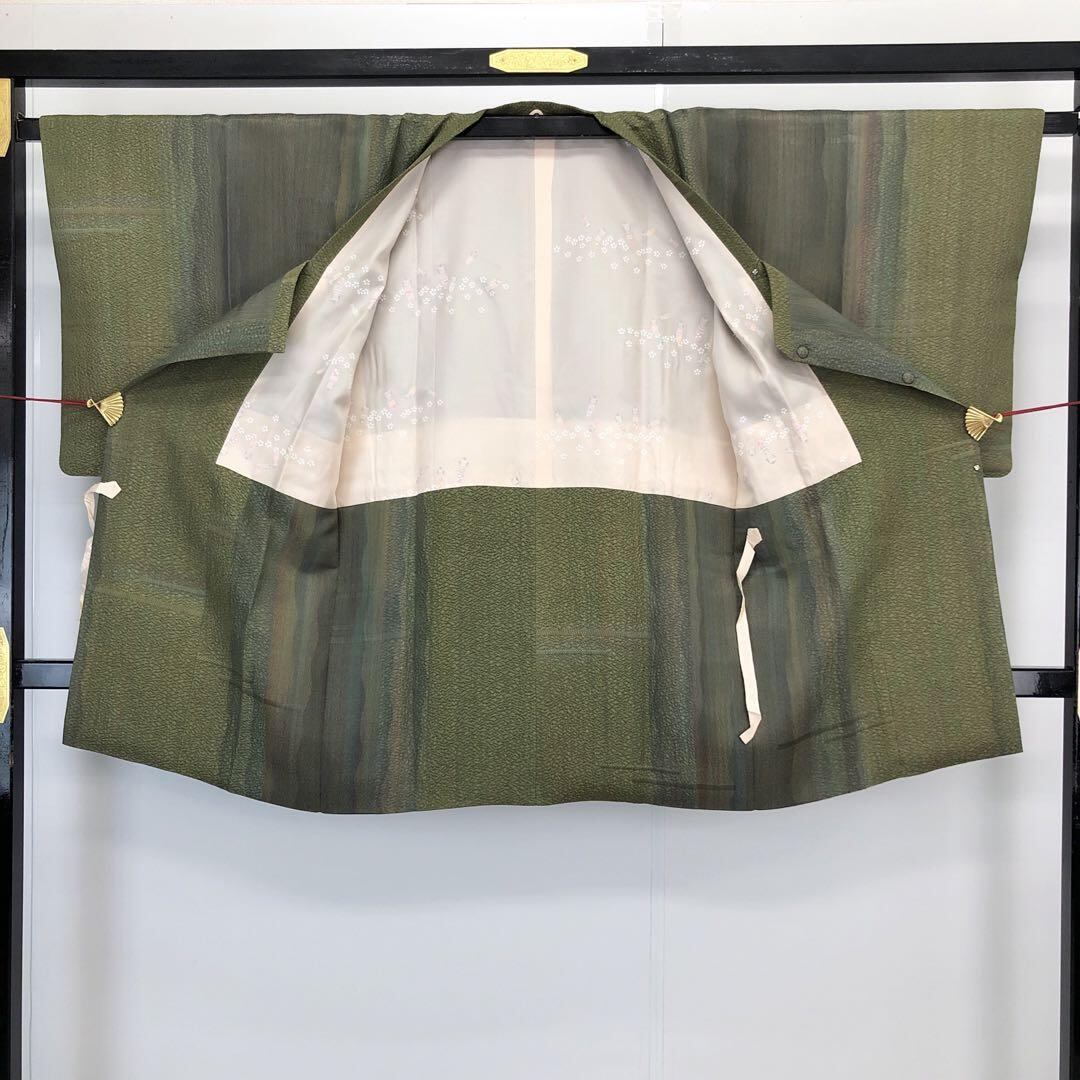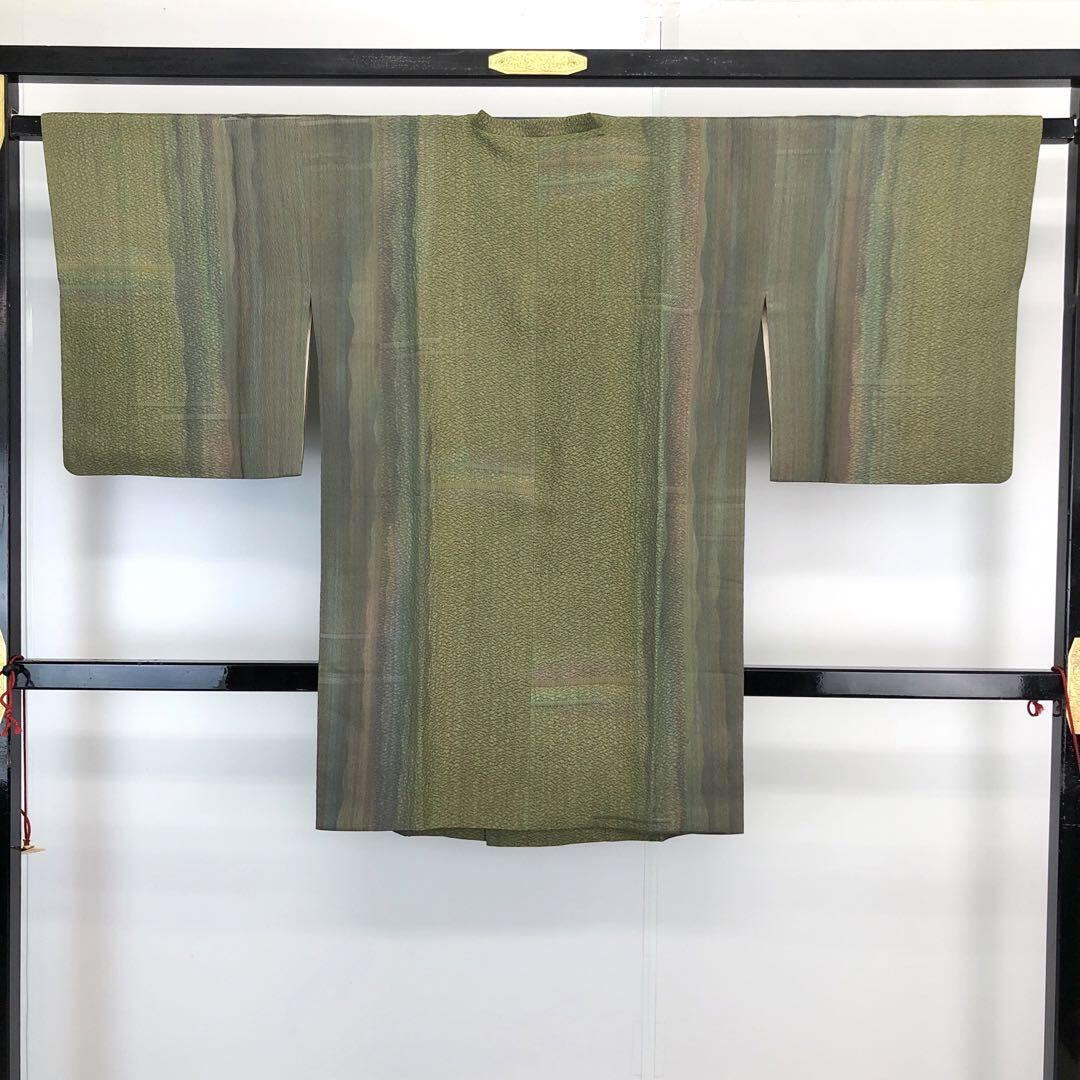市紅茶色ベースの緑味ベースのお色味に暈し、縦柄模様がデザインされた雰囲気の良い素敵な柄裄のお品でございます。