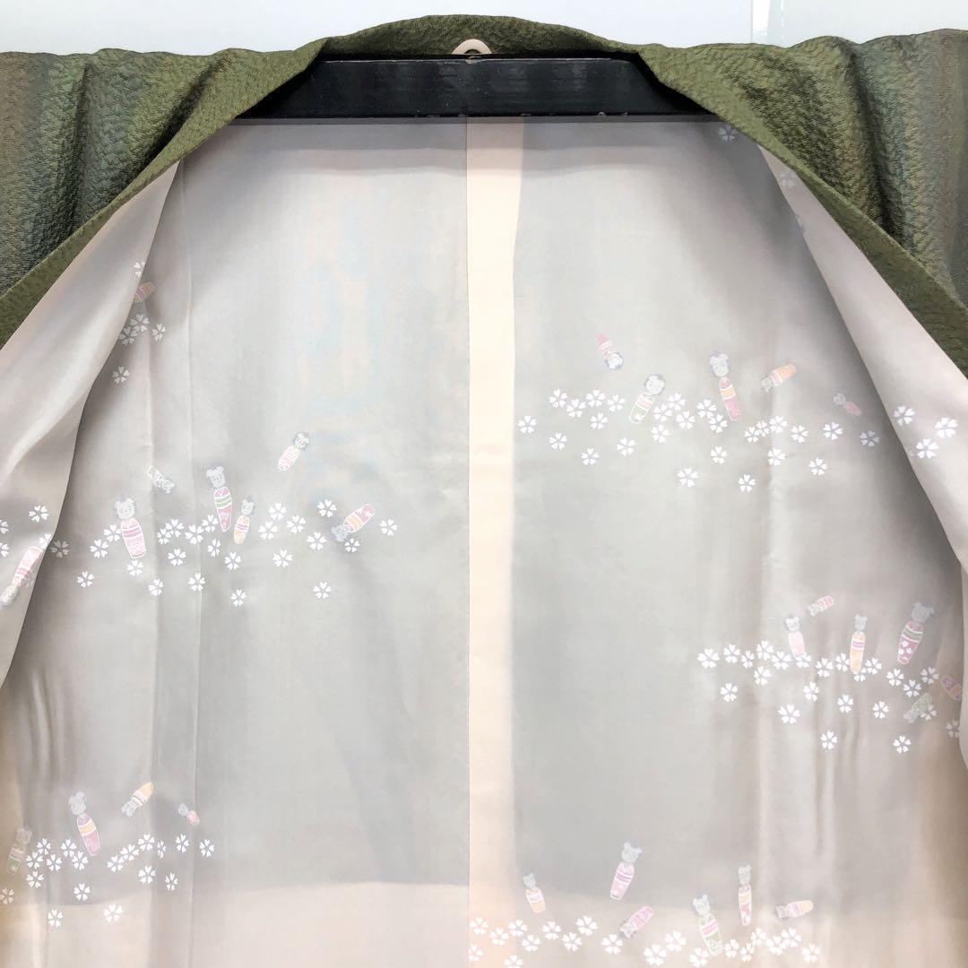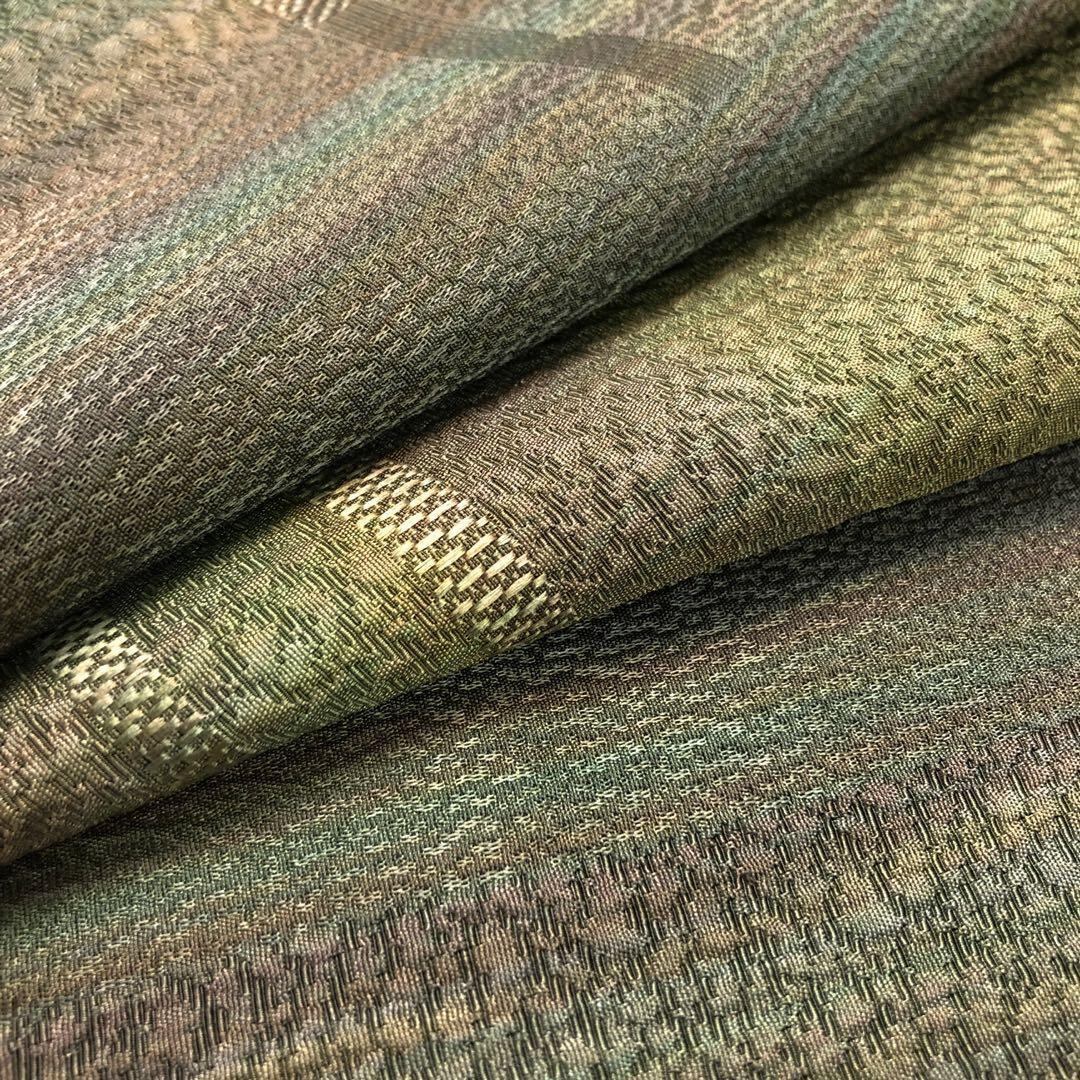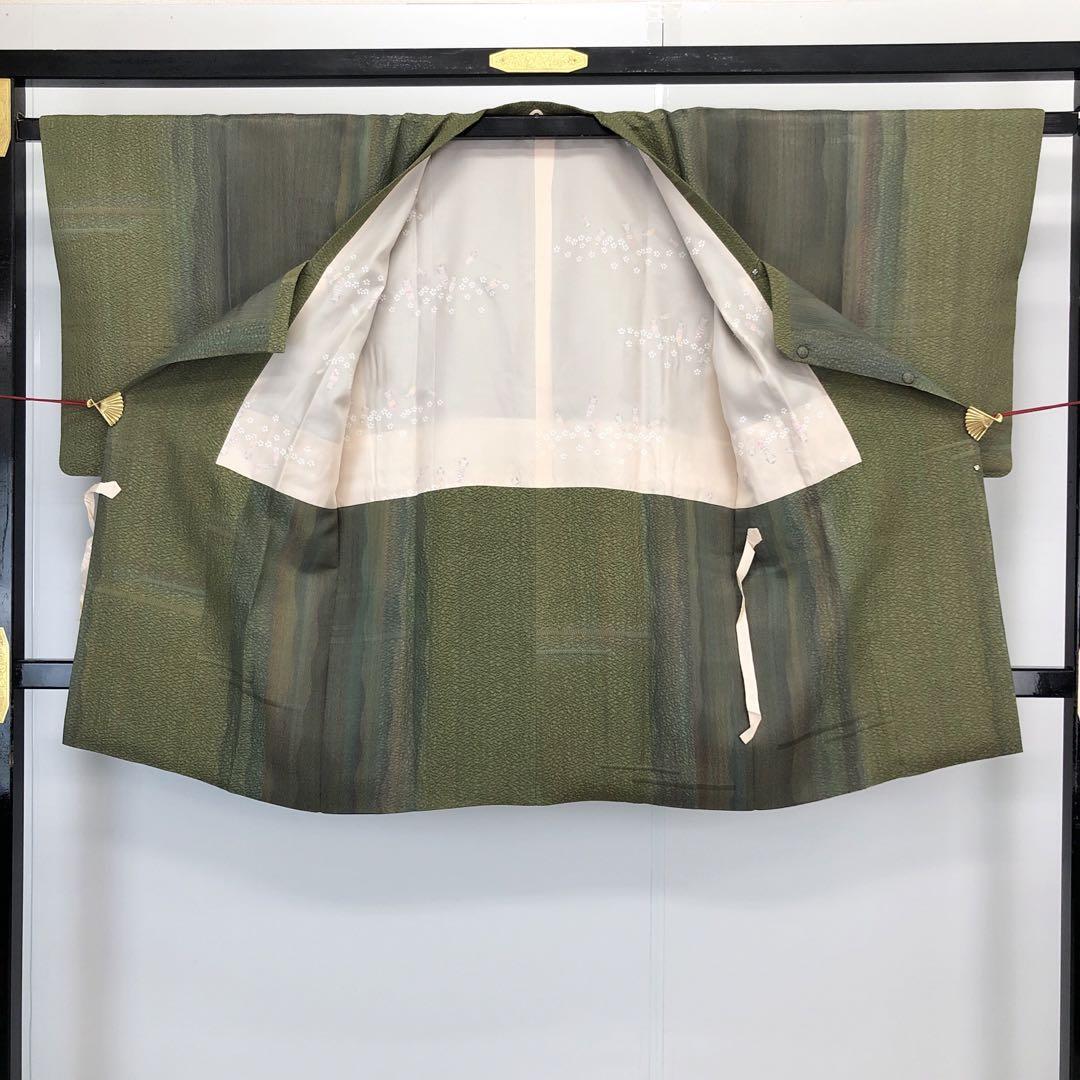 市紅茶色ベースの緑味ベースのお色味に暈し、縦柄模様がデザインされた雰囲気の良い素敵な柄裄のお品でございます。
