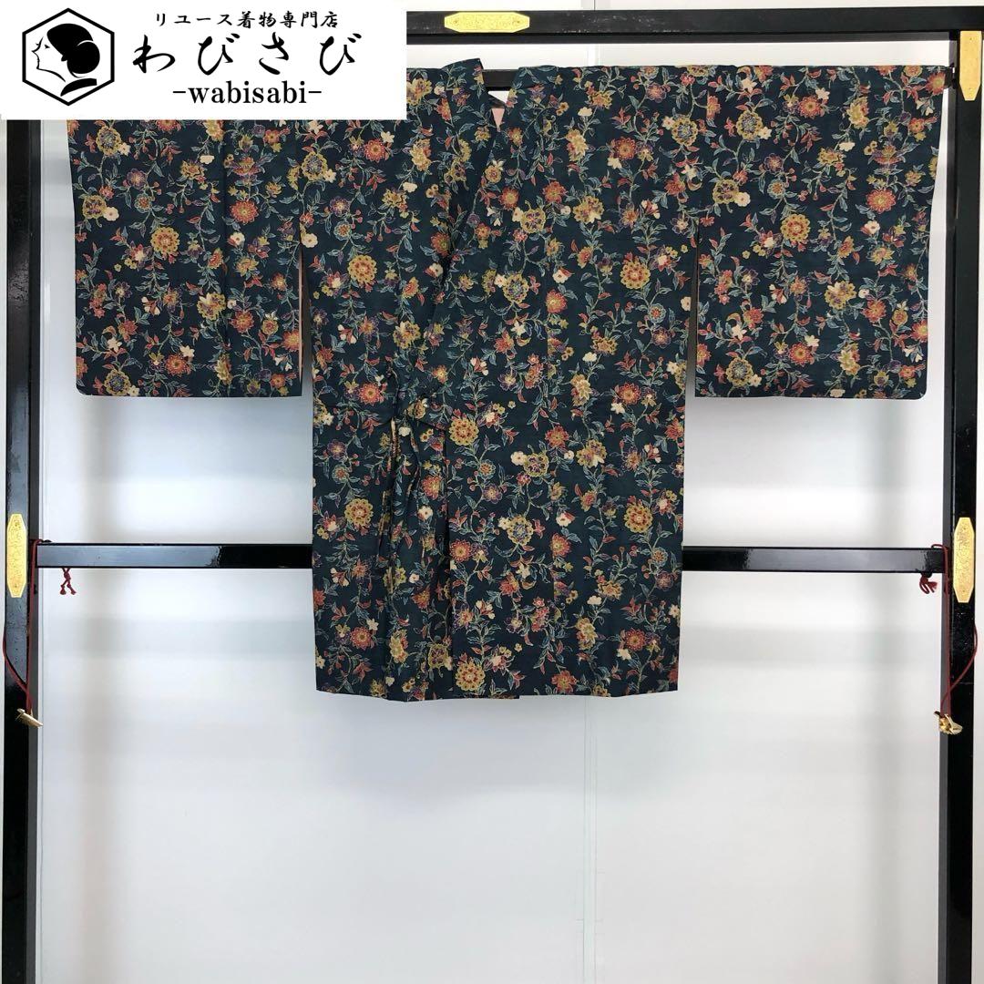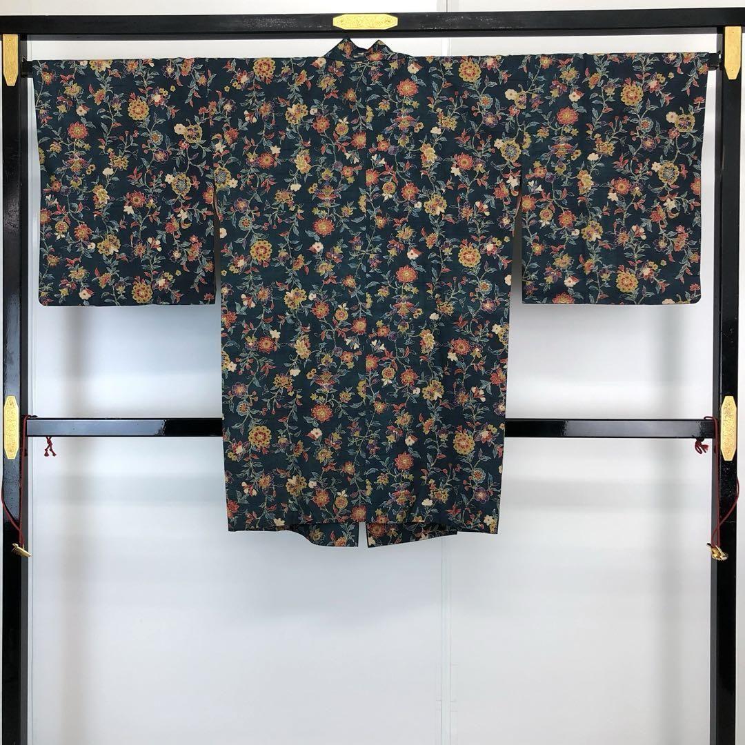 道中着 紬 型染 花唐草模様 鉄納戸色 鈴乃屋誂 H-4086 着物 きもの kimono 和服 和装 中古 リサイクル着物 【送料無料】