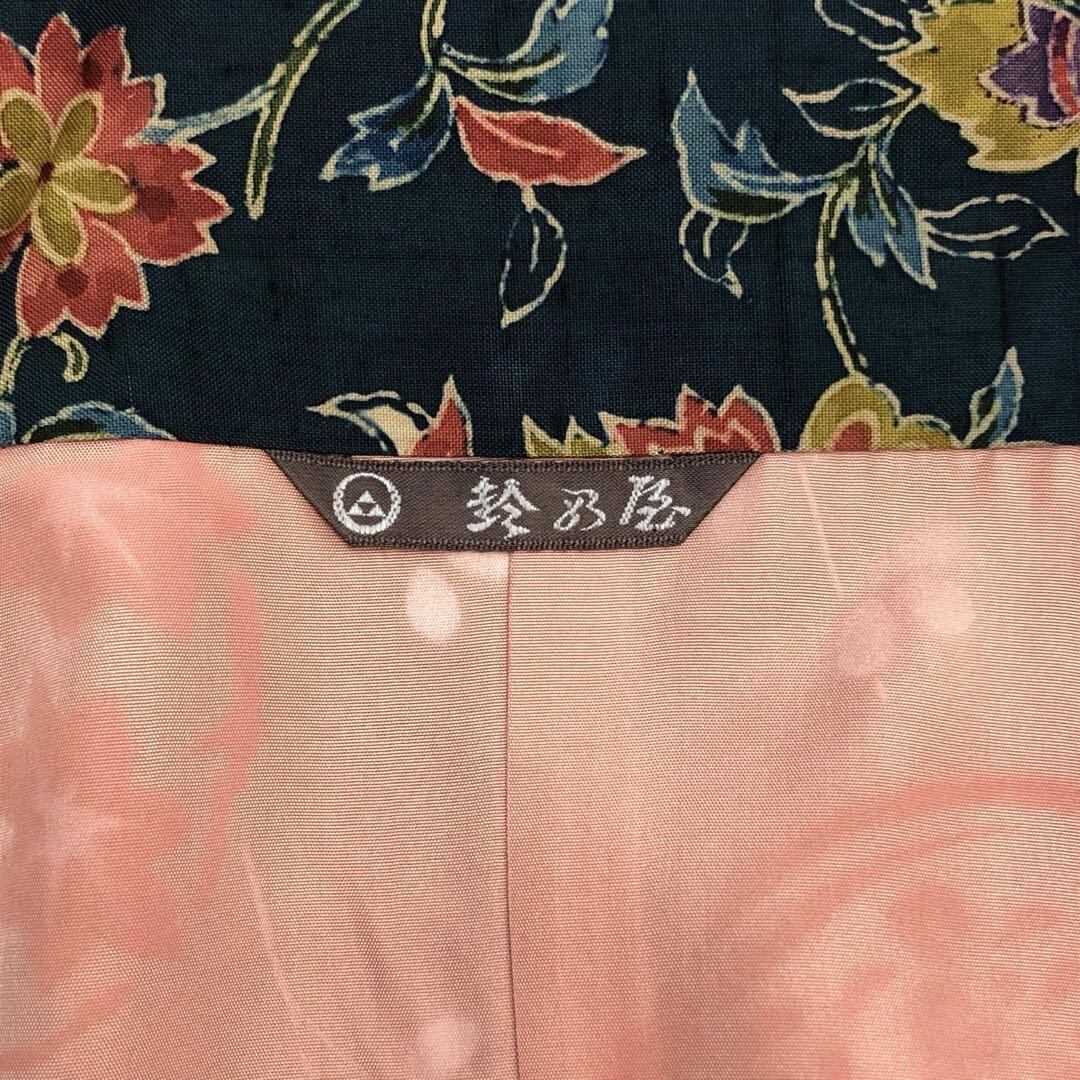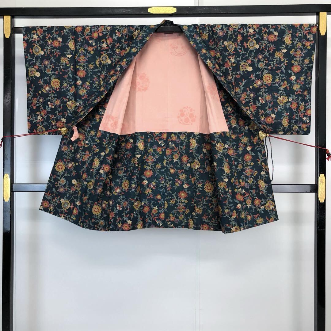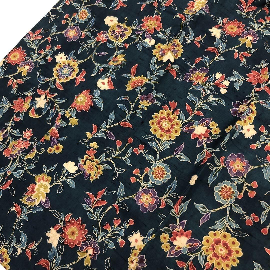 鉄納戸色の落ち着きのあるお色味の紬地に型染の花唐草模様の柄裄がデザインされた素敵なお品でございます。