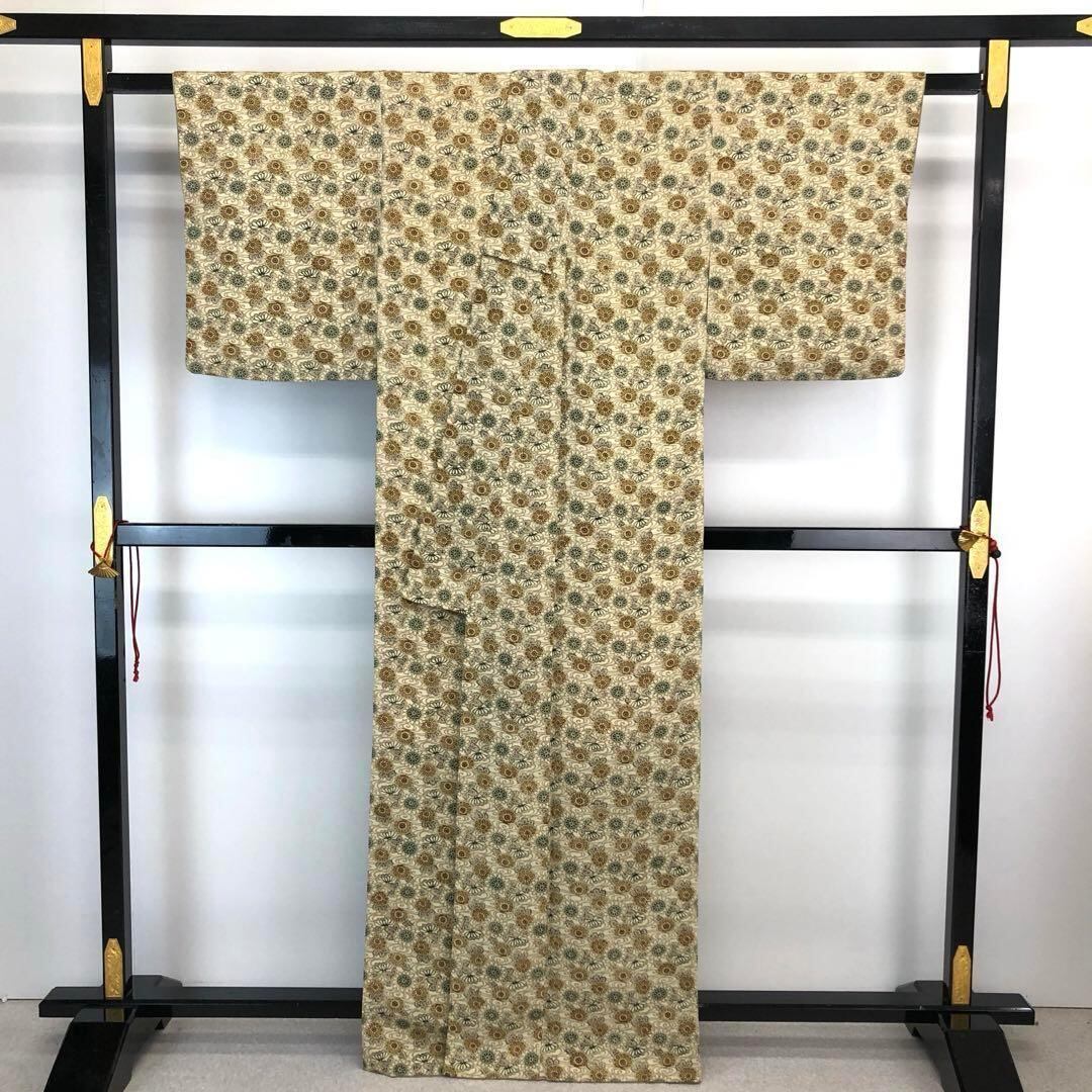 薄香色ベースのお色味の縮緬に型染めの流水花模様の柄裄がデザインされた素敵なお品でございます。