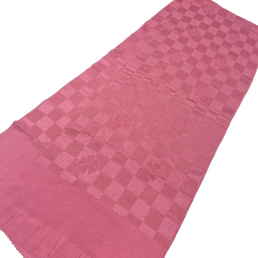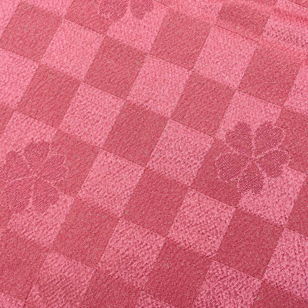 桃色の可愛らしいお色味に四角や花柄がデザインされた素敵なお品でございます。