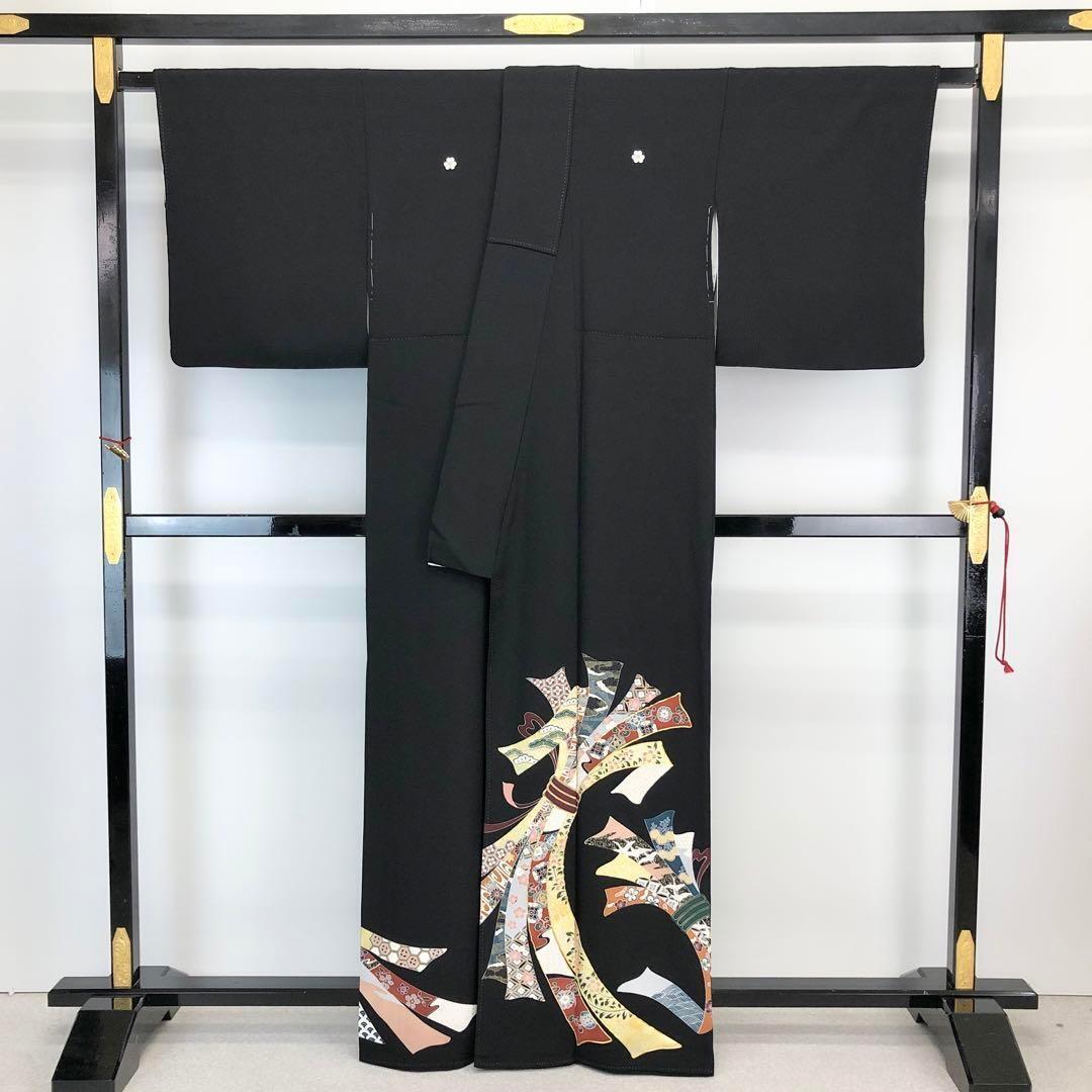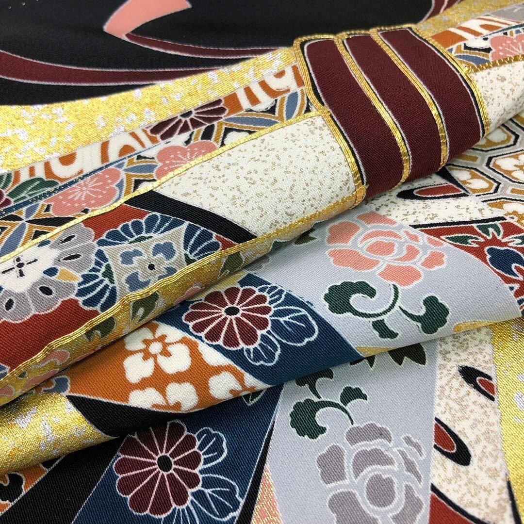 金銀彩、金駒刺繍などが使われた束熨斗に花模様、鶴などがデザインされた素敵な柄裄のお品でございます。