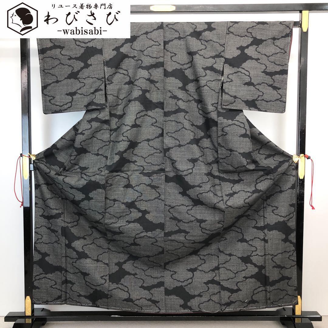 紬着物 霞模様 亀甲 黒色 しつけ糸 K-4333 着物 きもの kimono 和服 和装 中古 リサイクル着物 【送料無料】