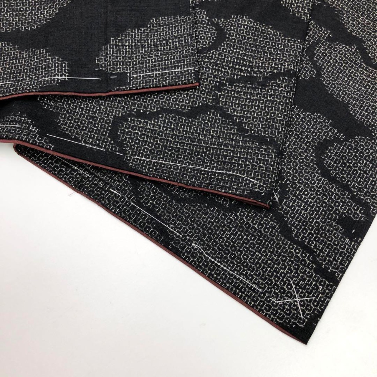 黒色ベースのお色に亀甲の霞模様の柄裄がデザインされた手触りの良い素敵なお品でございます。