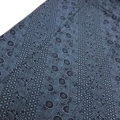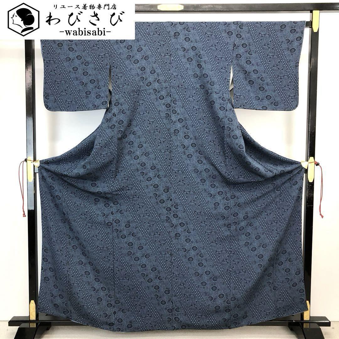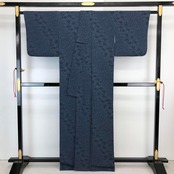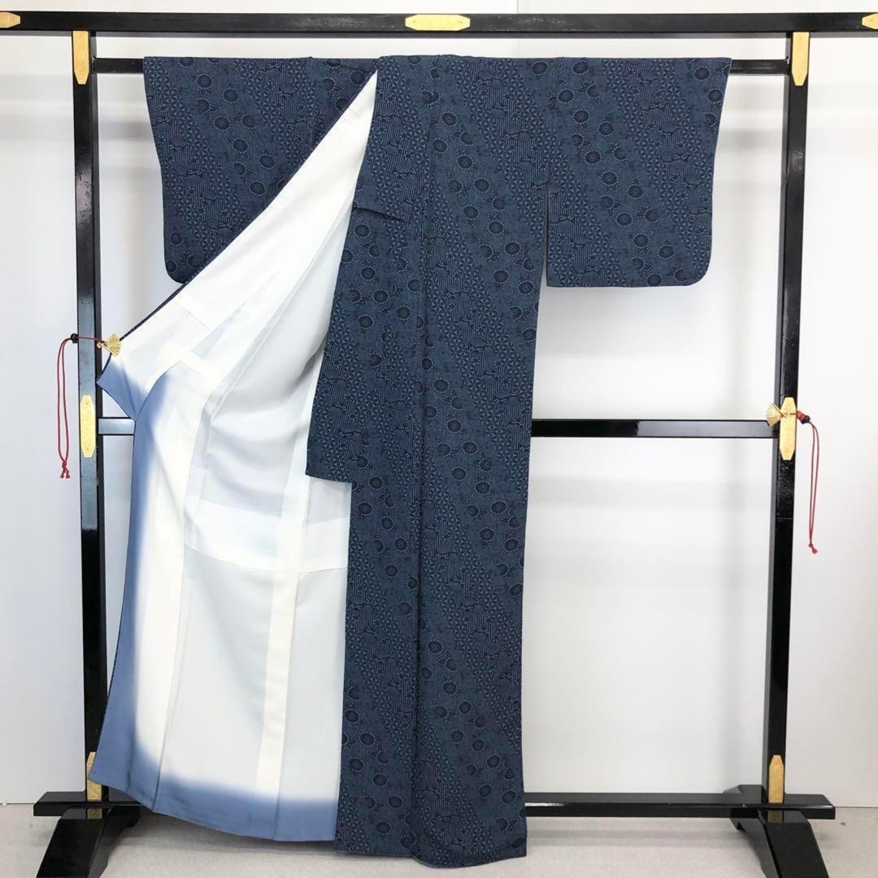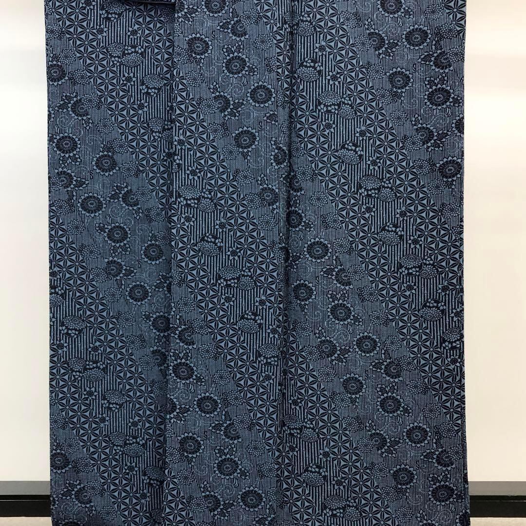 美しい藍色の縮緬地に斜めの雰囲気の良い型染の花柄模様がデザインされた素敵なお品でございます。