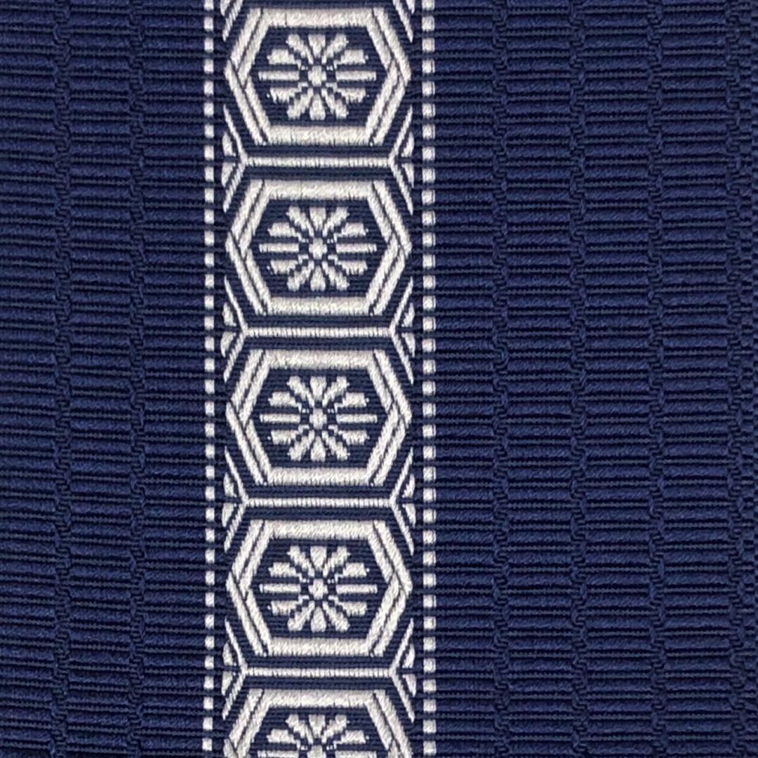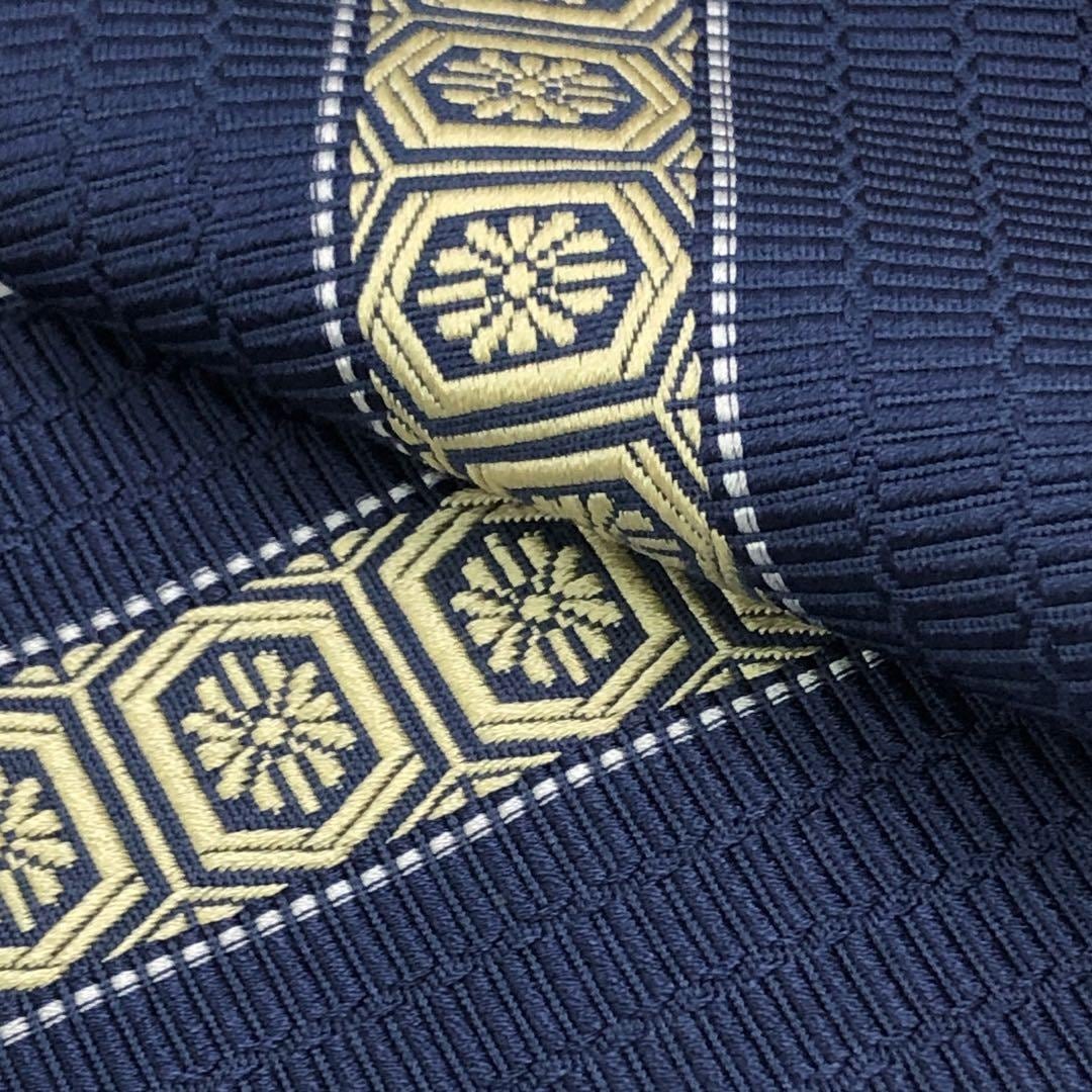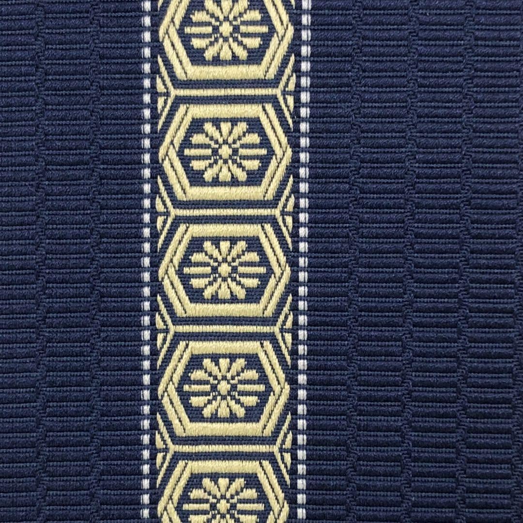 藍色のお色味に縦柄で花亀甲模様の柄裄がデザインされた両面楽しめる素敵なお品でございます。
