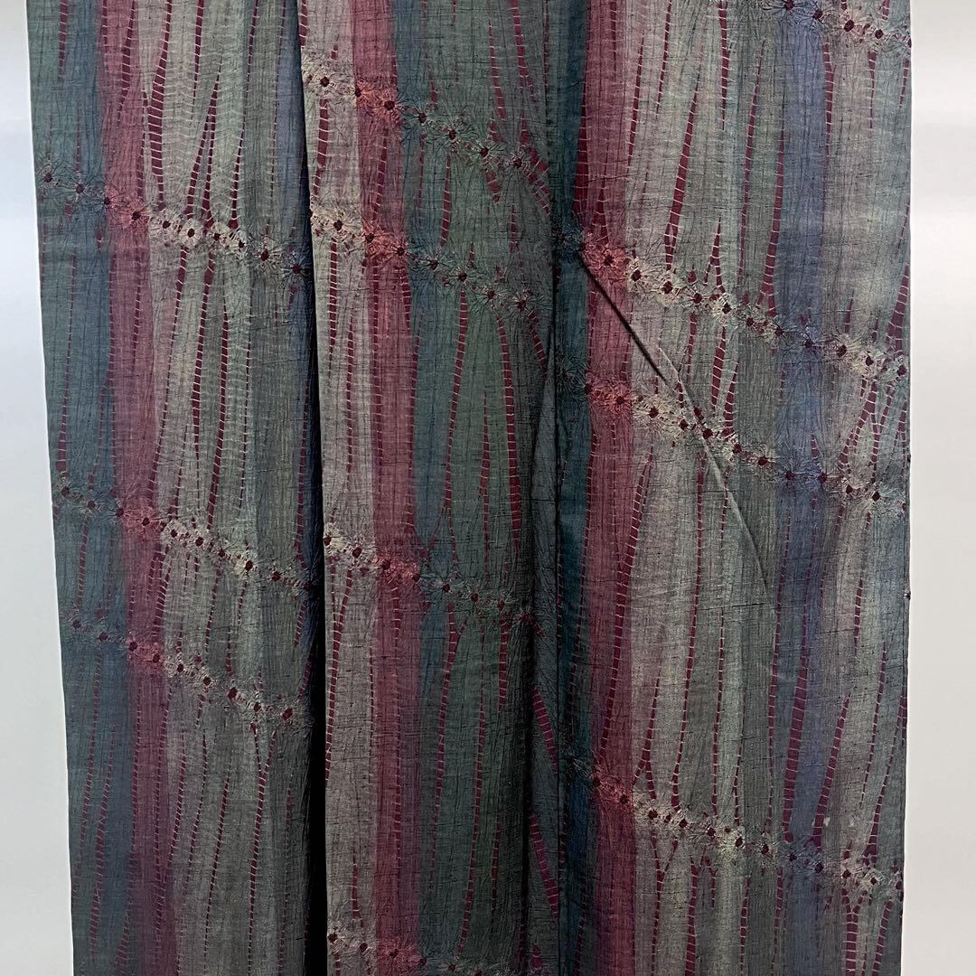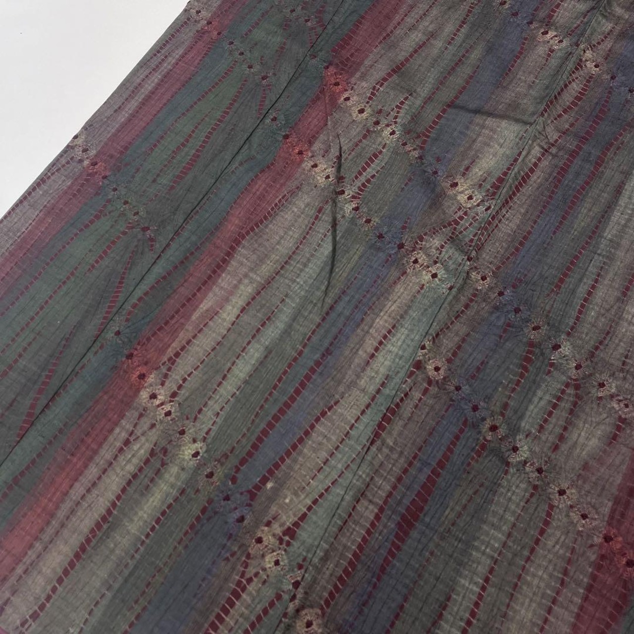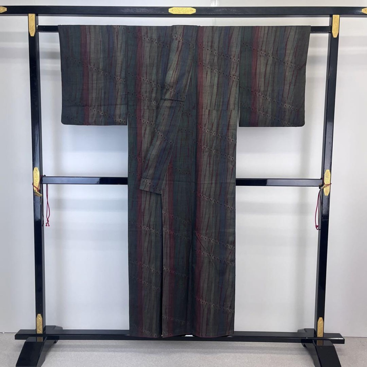 鉄色ベースの雰囲気の良い絞り柄、縦縞模様に蜘蛛絞りがデザインされた素敵なお品でございます。