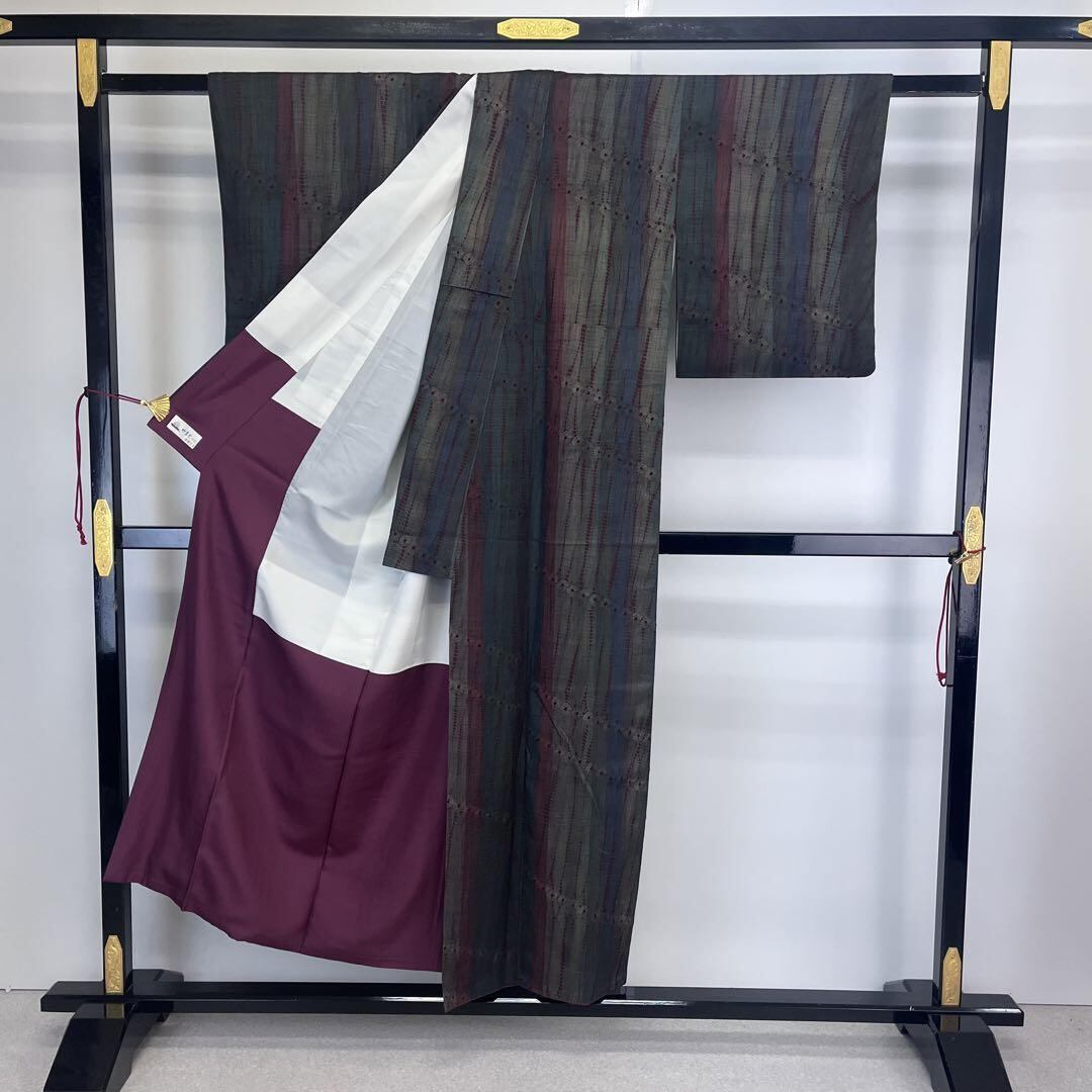 紬着物 雰囲気の良い絞り柄 蜘蛛絞り 縦縞模様 鉄色 ガード加工 K-4338 着物 きもの kimono 和服 和装 中古 リサイクル着物 【送料無料】